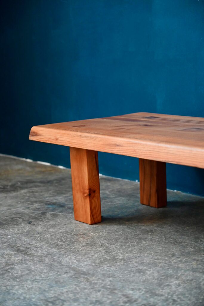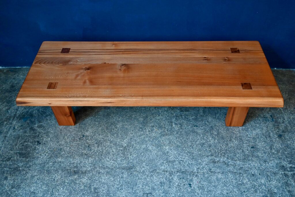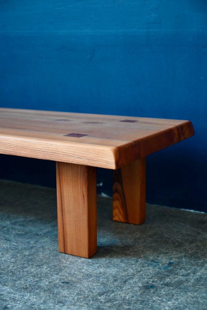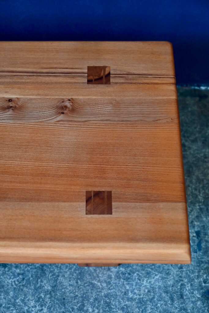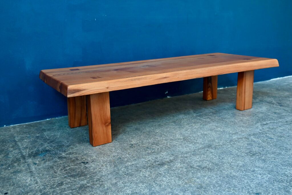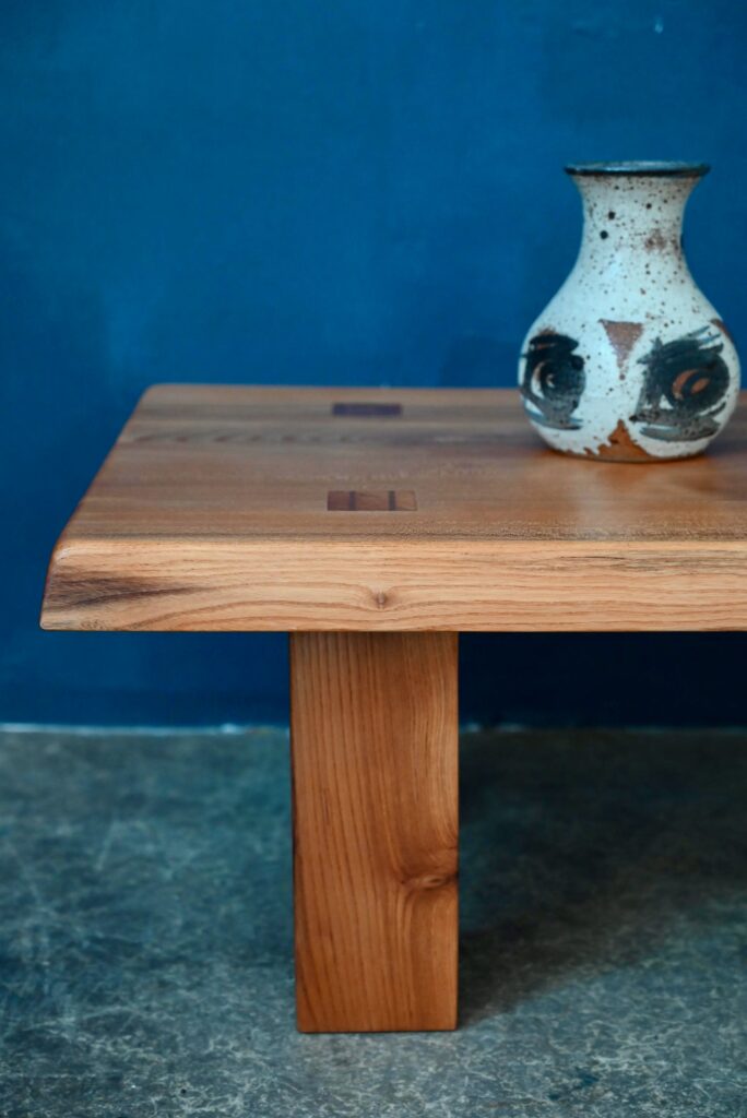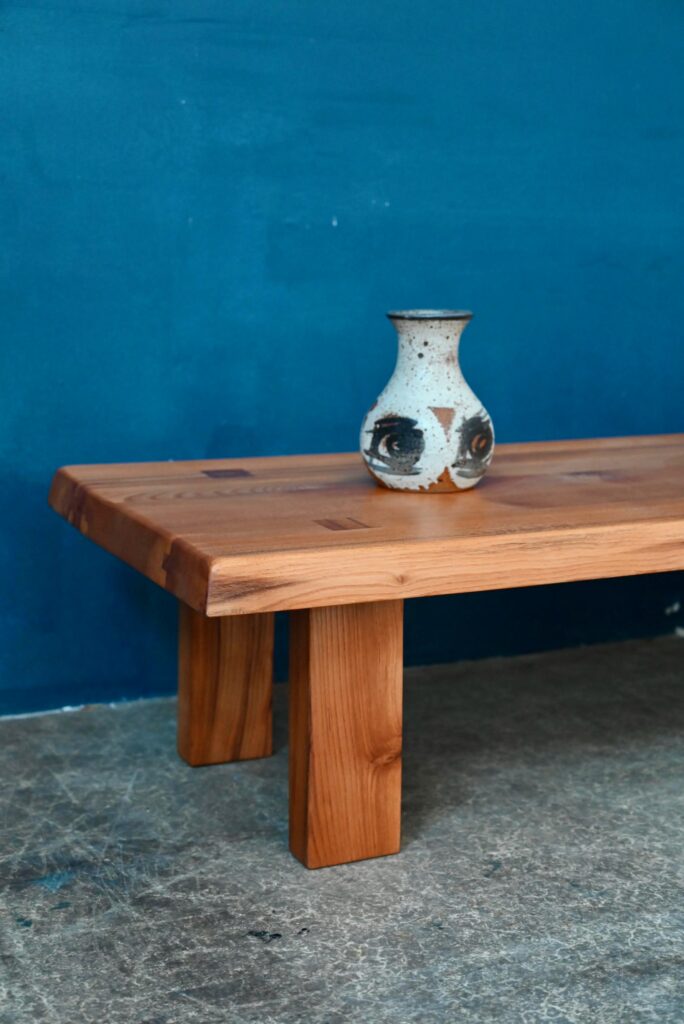 La table basse est en orme massif. Elle est en très bel état. Stable et en bel état, le plateau met en évidence les mortaises de son épais piétement. La table est une très belle pièce de design brutaliste.