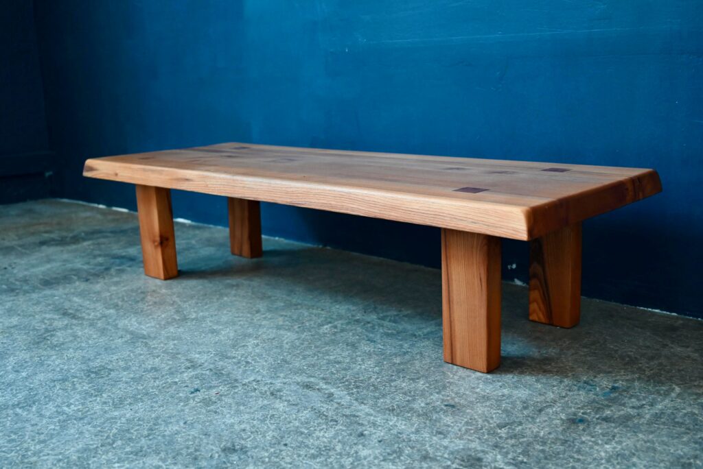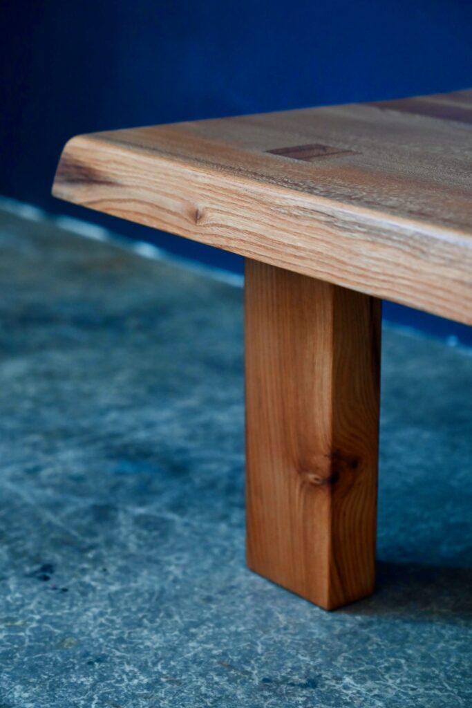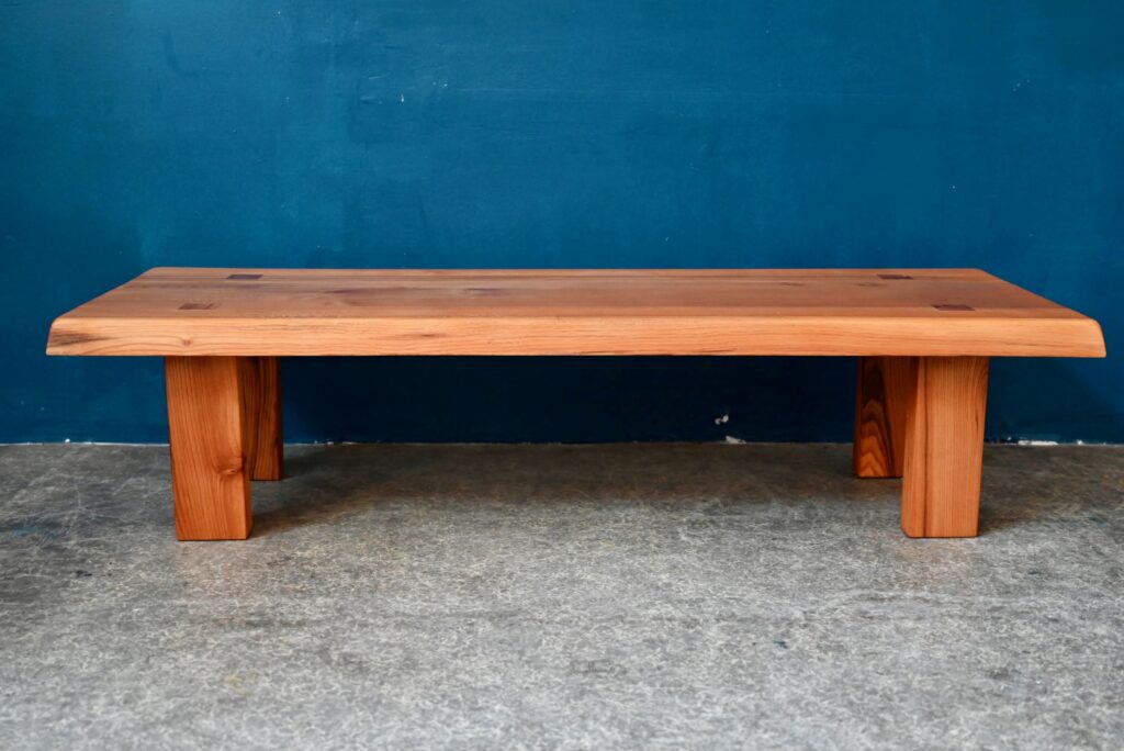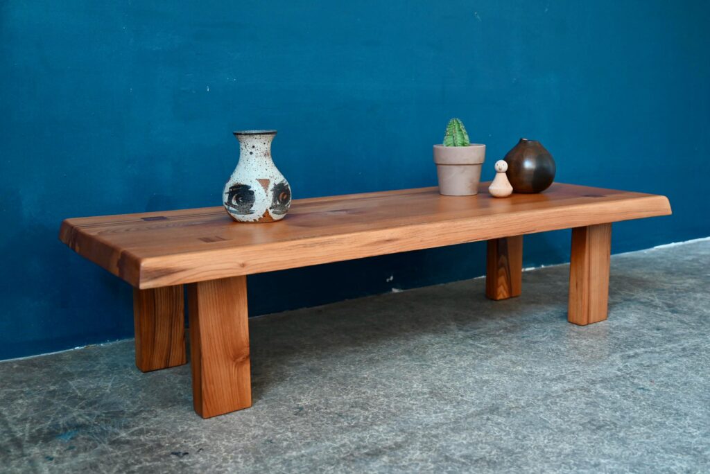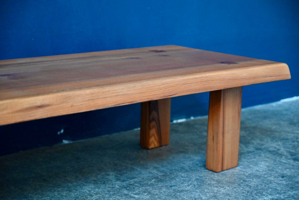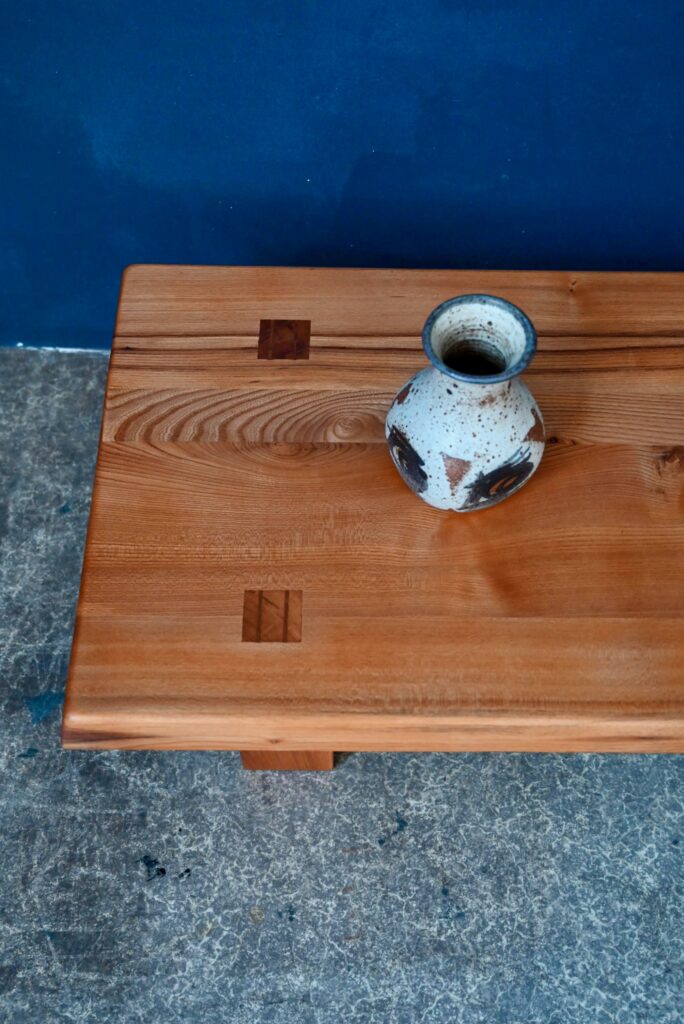 La table basse est en orme massif. Elle est en très bel état. Stable et en bel état, le plateau met en évidence les mortaises de son épais piétement. La table est une très belle pièce de design brutaliste.