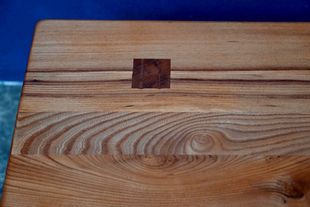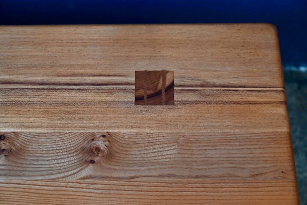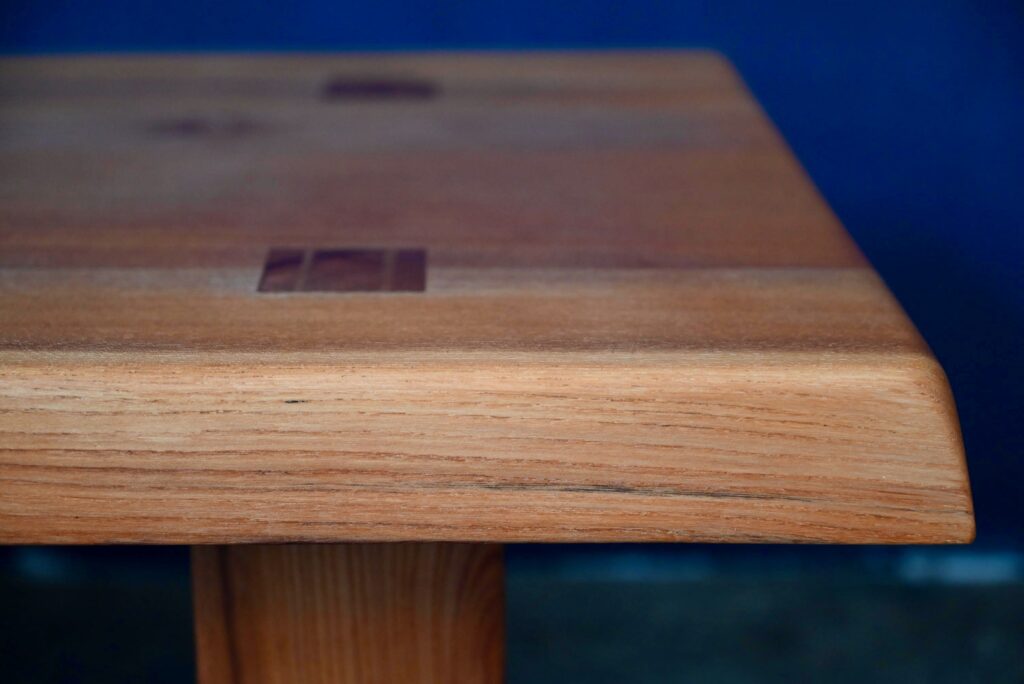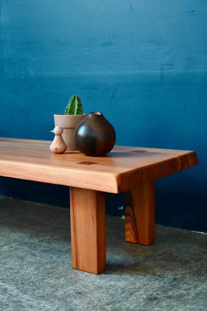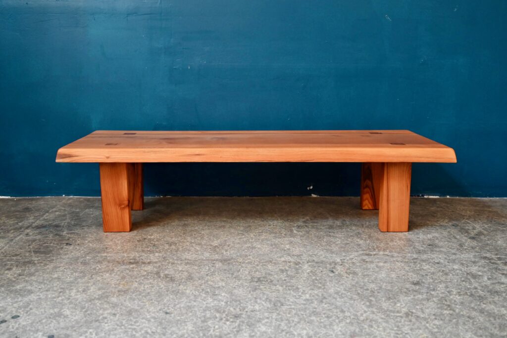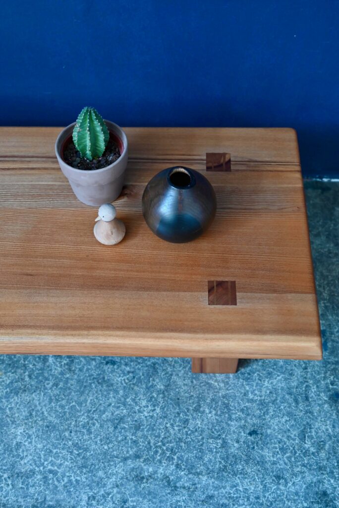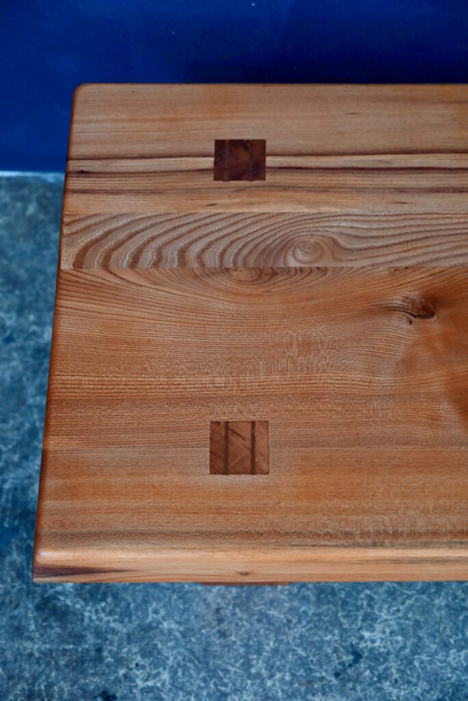 La table basse est en orme massif. Elle est en très bel état. Stable et en bel état, le plateau met en évidence les mortaises de son épais piétement. La table est une très belle pièce de design brutaliste.
