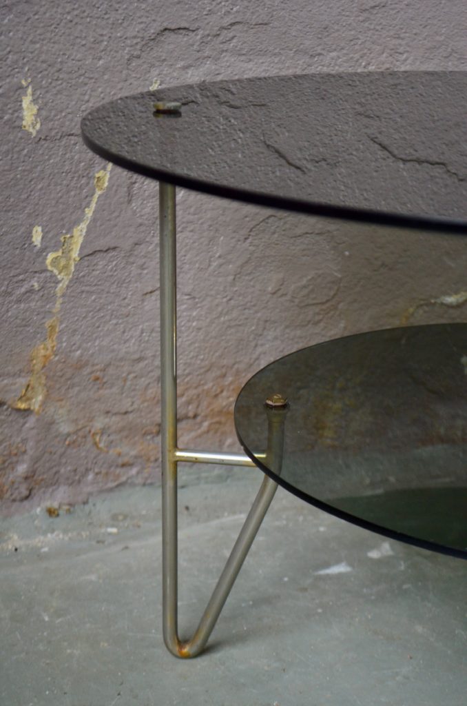 La table basse moderniste française date des années 50. Quelques rayures sont visibles sur le verre du plateau supérieur, ainsi que des impuretés et de discrets manques. La structure de métal est patinée, oxydée par endroits. La table basse midcentury est dotée de deux plateaux ronds soutenus par de l’acier tubulaire coudé.