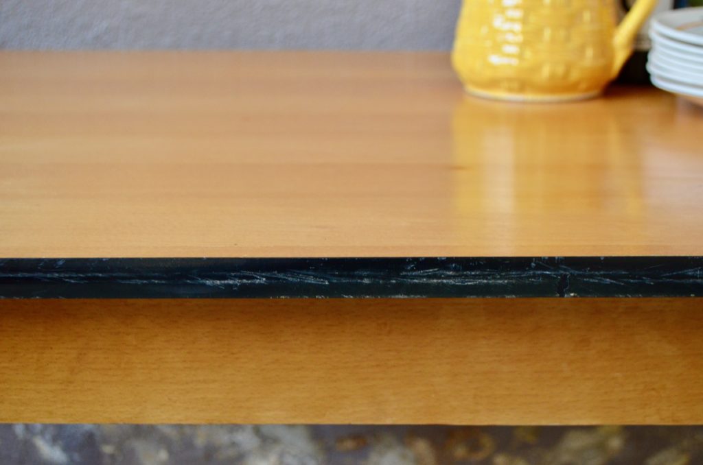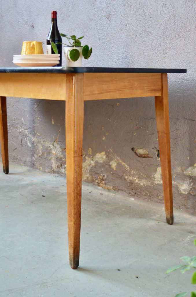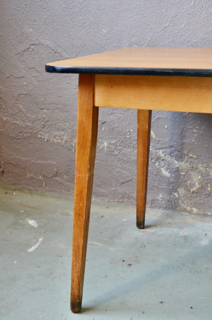 La table date des années 60. Elle possède d’un piétement compas en bois massif blond. Le plateau est en placage bois d’une belle teinte blonde, bordé d’un chant en vinyle noir. La table est table et en très bel état. Elle peut accueillir jusque 8 personnes. Des traces d’usage sont visibles sur le bas des pieds, le chant et sur le plateau, visibles en photo.