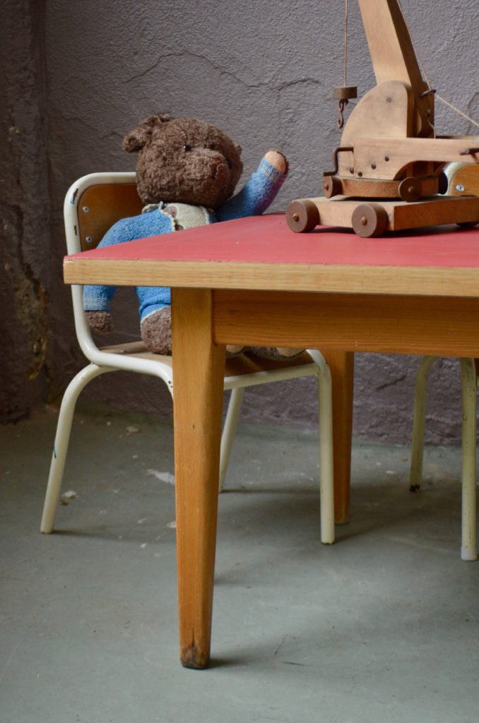 Dénichées dans un jardin d’enfants, ces charmants ensembles de mobilier sont de parfaits supports pour les bricolages, jeux, dessins et autres activités ludiques et créatives. Le plateau de la table, rénové en rouge “fraise”, contraste joliment avec la teinte claire du bois. Parfaitement stable, ergonomique, costaud, cet ensemble table et chaises d’activités affiche un beau vécu mais a encore de belles années devant lui. D’un design émouvant et d’une qualité incomparable, cet ensemble vintage est l’assurance de moments riches en créations et en découvertes!