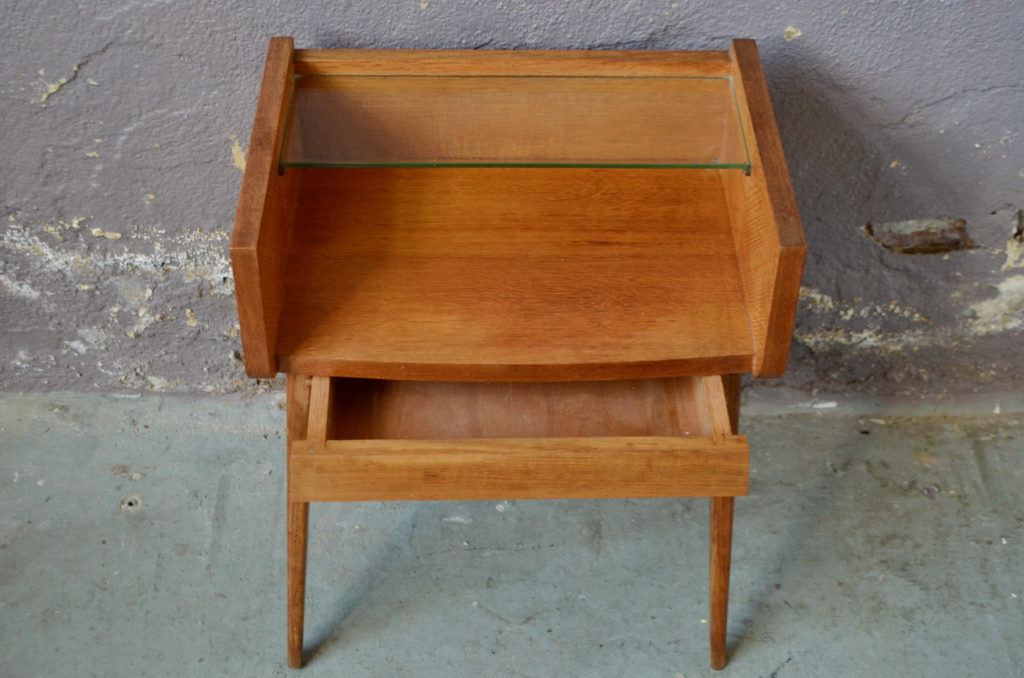 Les lignes de cette jolie table de nuit sont racées, pleines de finesse. Petit meuble plein de caractère, c’est une production française des années 50. De belle facture, il est réalisé en bois blond. Nous aimons ses longs pieds compas effilés qui portent un fin tiroir, une niche et une tablette pour de belles possibilités de déco comme de rangement. Petit meuble d’appoint, il trouvera sa place comme chevet ou bout de canapé et apportera sa touche vintage à l’ambiance de la maison.