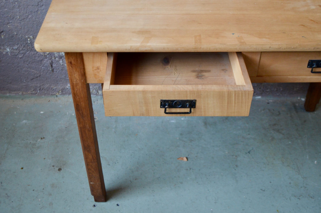 La table est ancienne et date des années 40. Il est en bois massif. Epaisse et de belle facture, la table est en bel état et très stable. Il y a quelques traces d’usage visibles en photo. Le plateau est brut, nous pouvons appliquer une finition sur simple demande. La ceinture comprend 2 tiroirs profonds, les poignées en métal sont d’origine.
