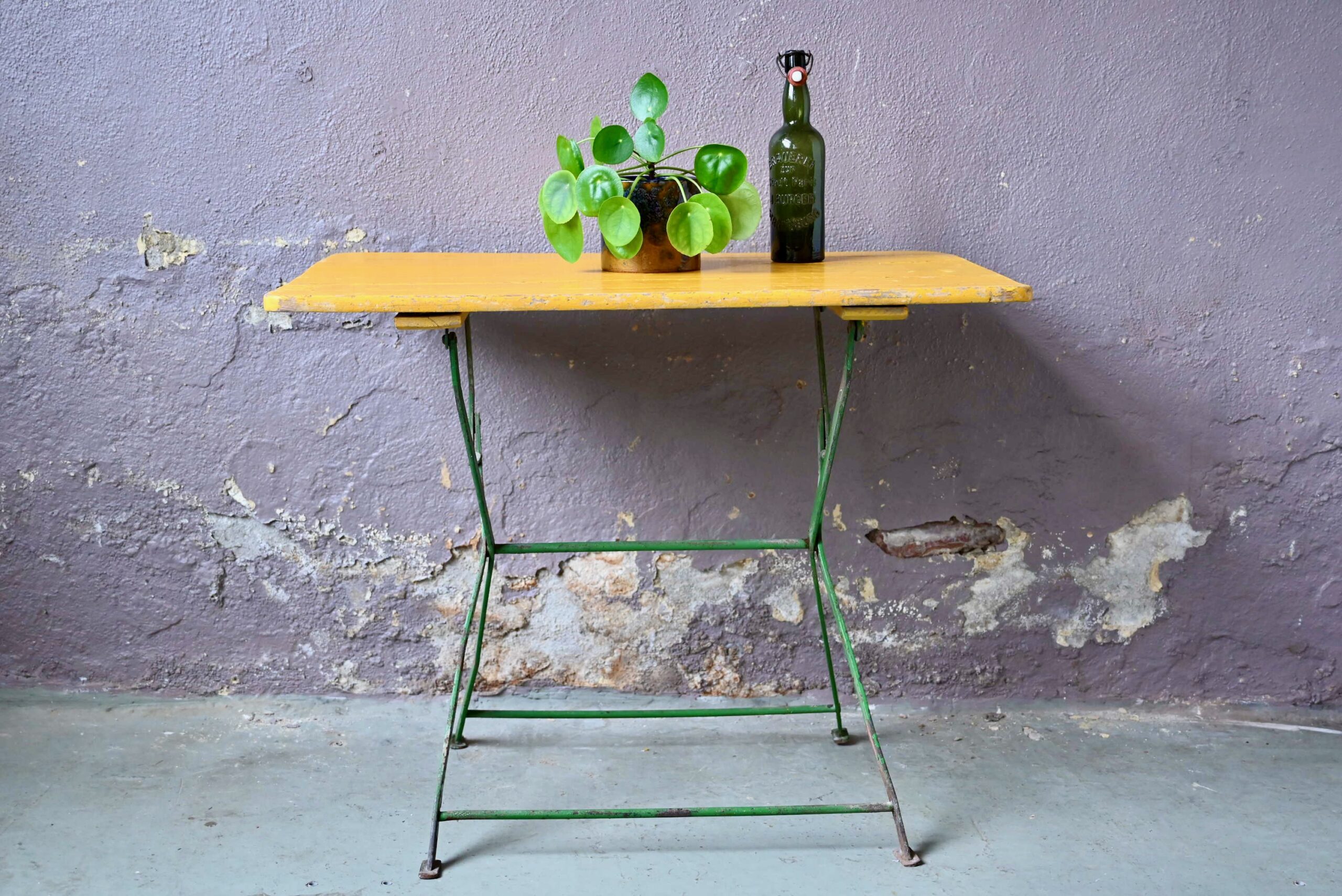 Patine intense et couleur éclatante pour cette ancienne table bistrot en bois et métal des années 40. Fine et pleine de charme, cette petite table pliante est touchante. On l’imagine dans une cuisine rétro, sur un petit balcon bohème ou à l’ombre d’un saule pleureur dans un jardin bohème et sauvage.