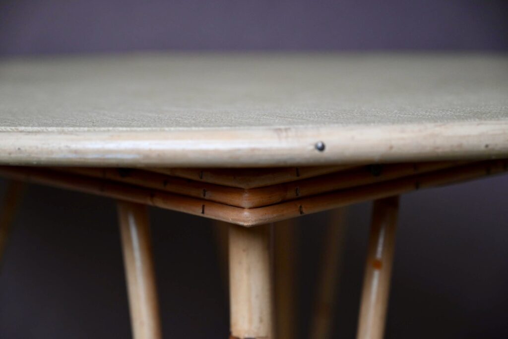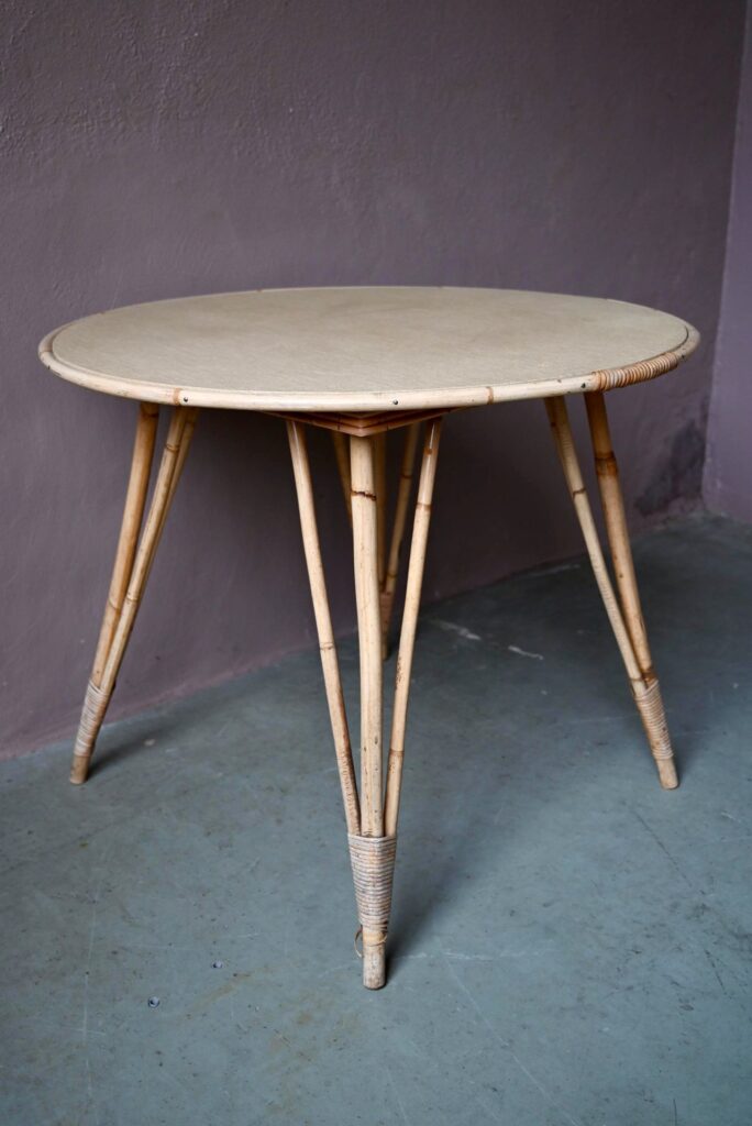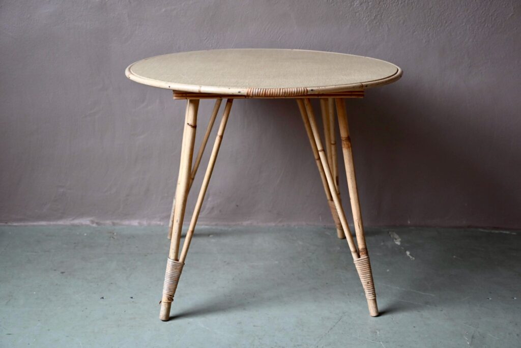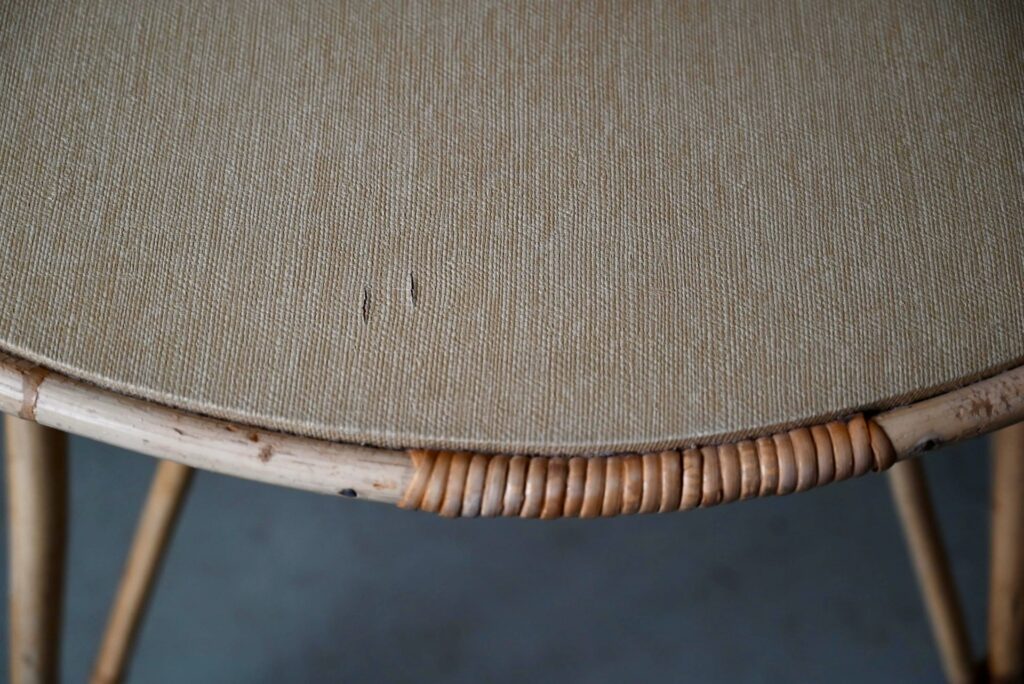 Le guéridon est en rotin doré. Le dessin du piétement est joli et souligne un joli plateau rond couvert de vinyle beige. Il est bel état, quelques traces d’usage sont visibles sur le plateau et en photo. Un petit manque de rotin est à noter sur un des pieds.