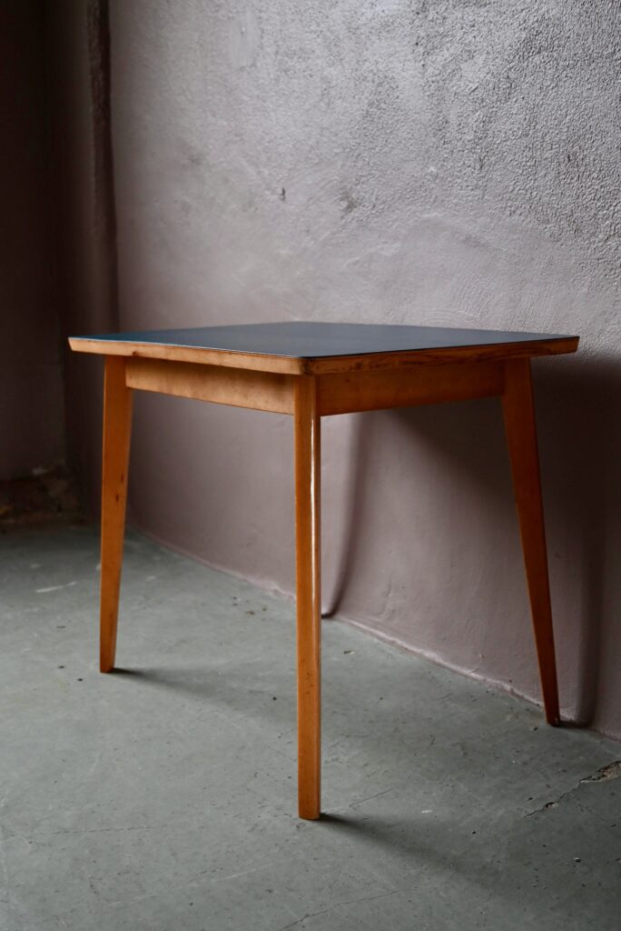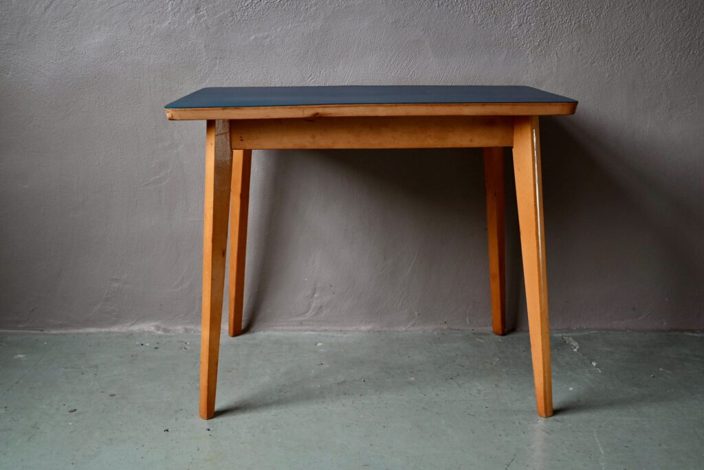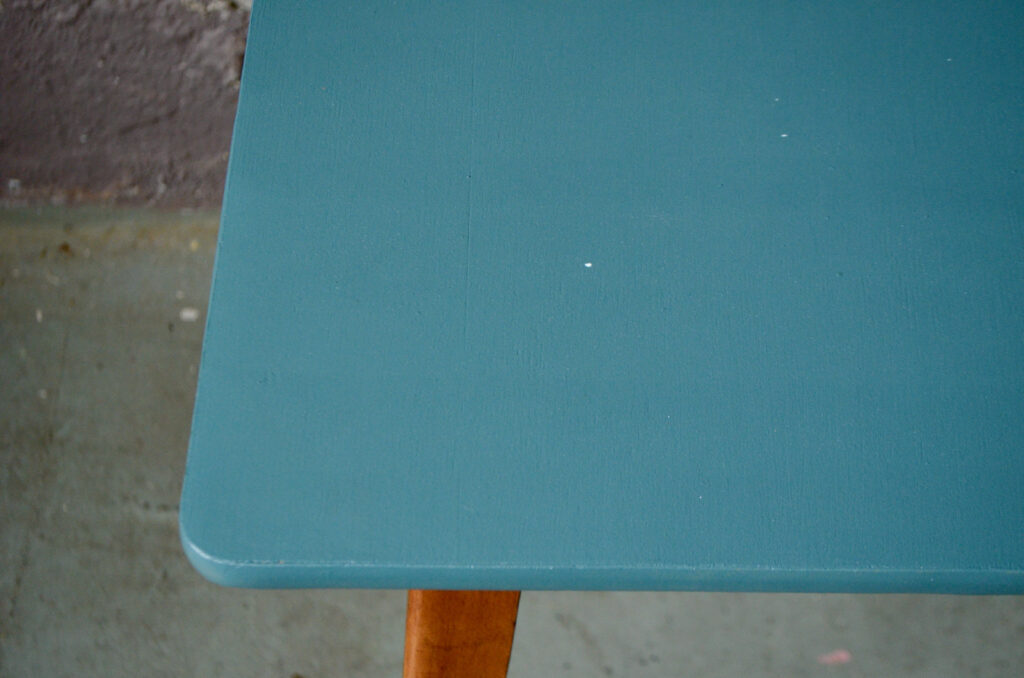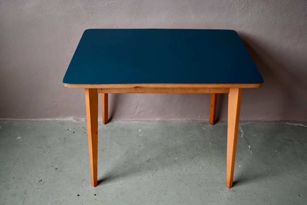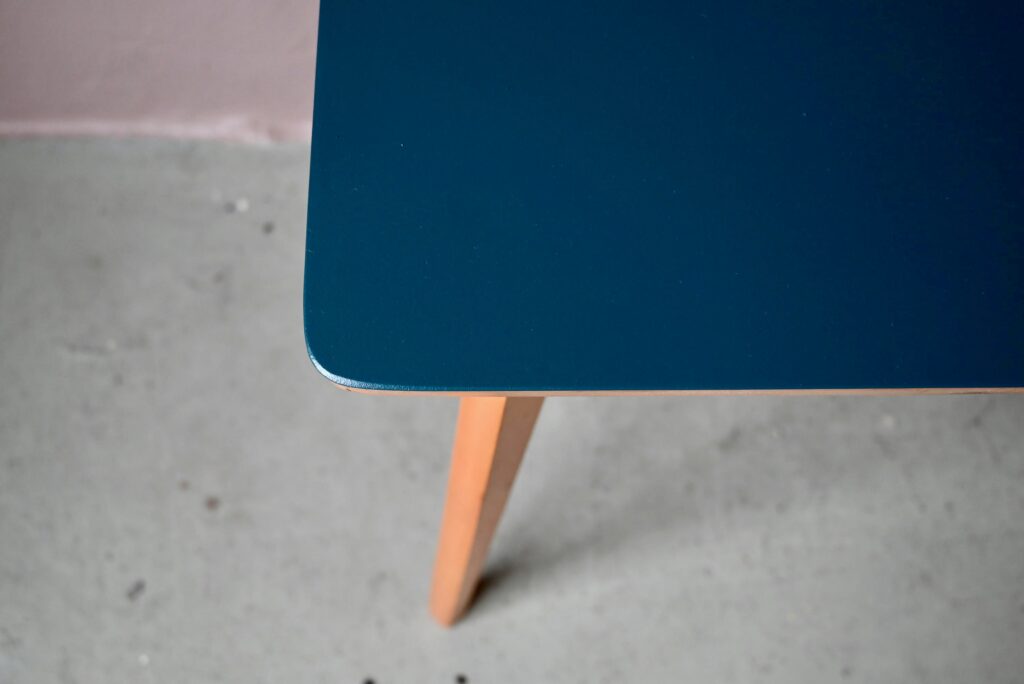 Le piétement compas de la table est en hêtre massif, de teinte miel doré, contrastant joliment avec le plateau bleu lazuli. Celui-ci a été protégé par un vernis très résistant. Quelques discrètes traces d’usage sont présentes et visibles sur le piétement. L’ensemble est stable, costaud et en très bel état.