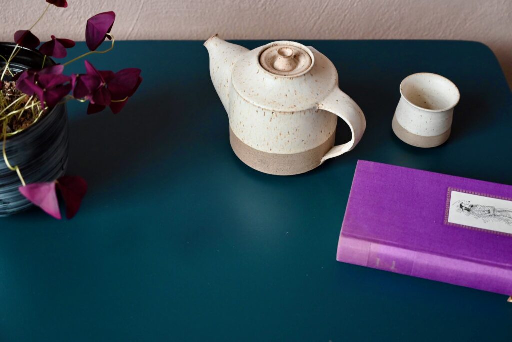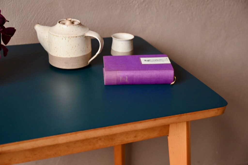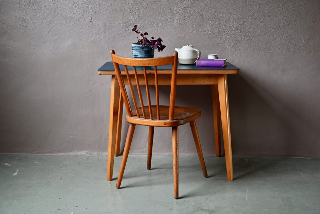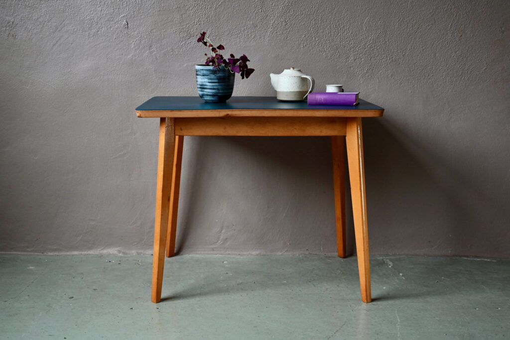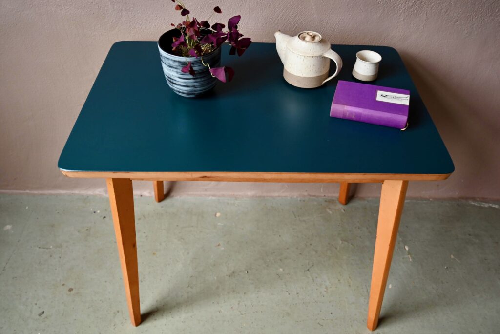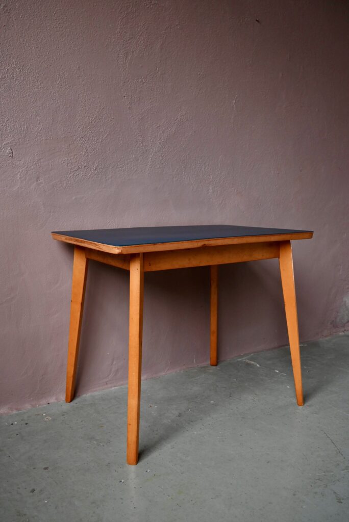 Voici une petite table en bois des années 60! Élancée, aux formes simples et minimalistes, son allure est élégante et pétillante. Le piétement compas en hêtre doré lui confère un bel air rétro. Son plateau rénové “bleu lazuli” joue les contrastes et dynamise cette table de cuisine vintage, parfaitement dans l’air du temps. Facile à adopter, elle fera swinguer la cuisine, du petit déjeuner jusque tard dans la soirée!