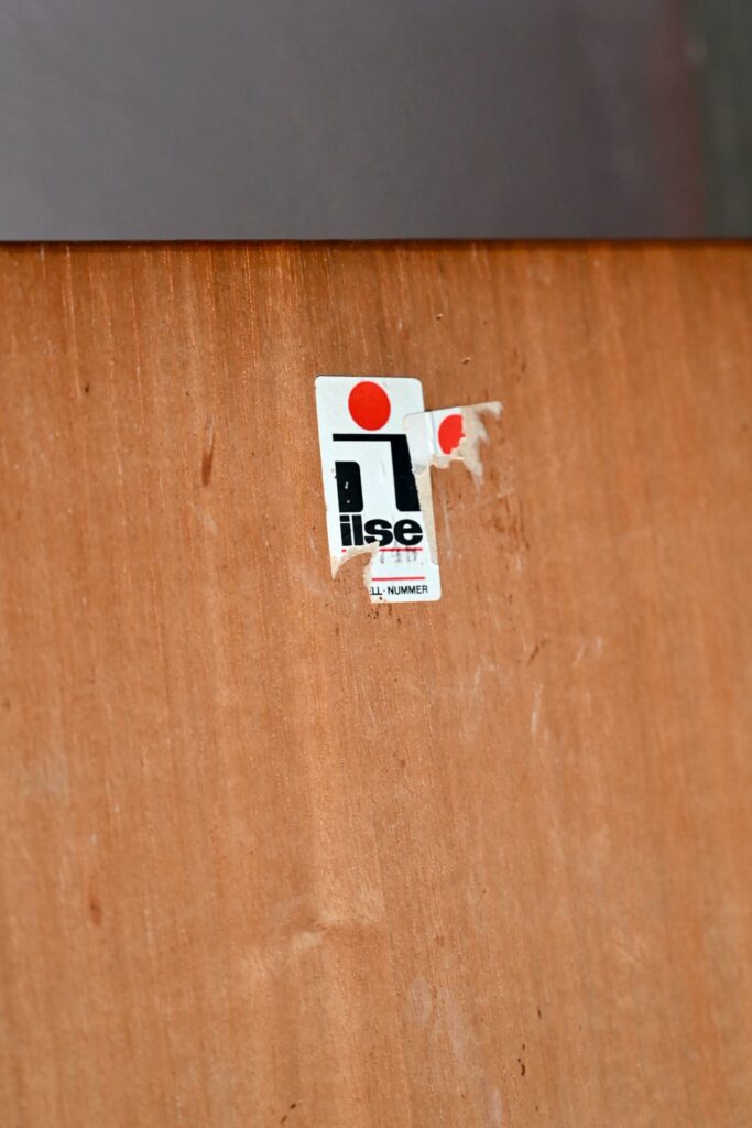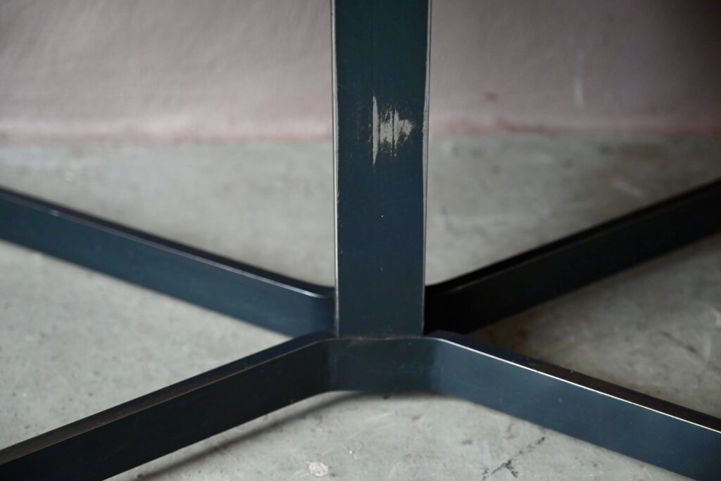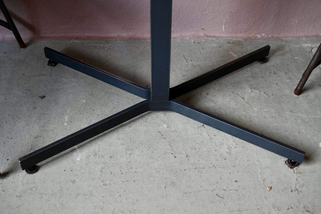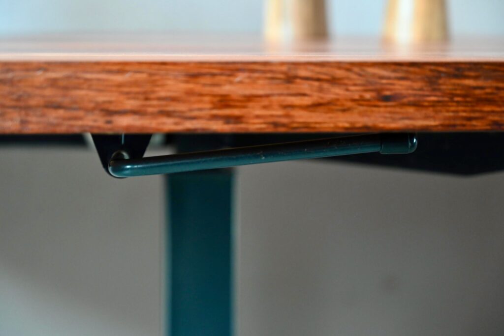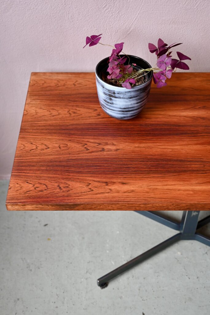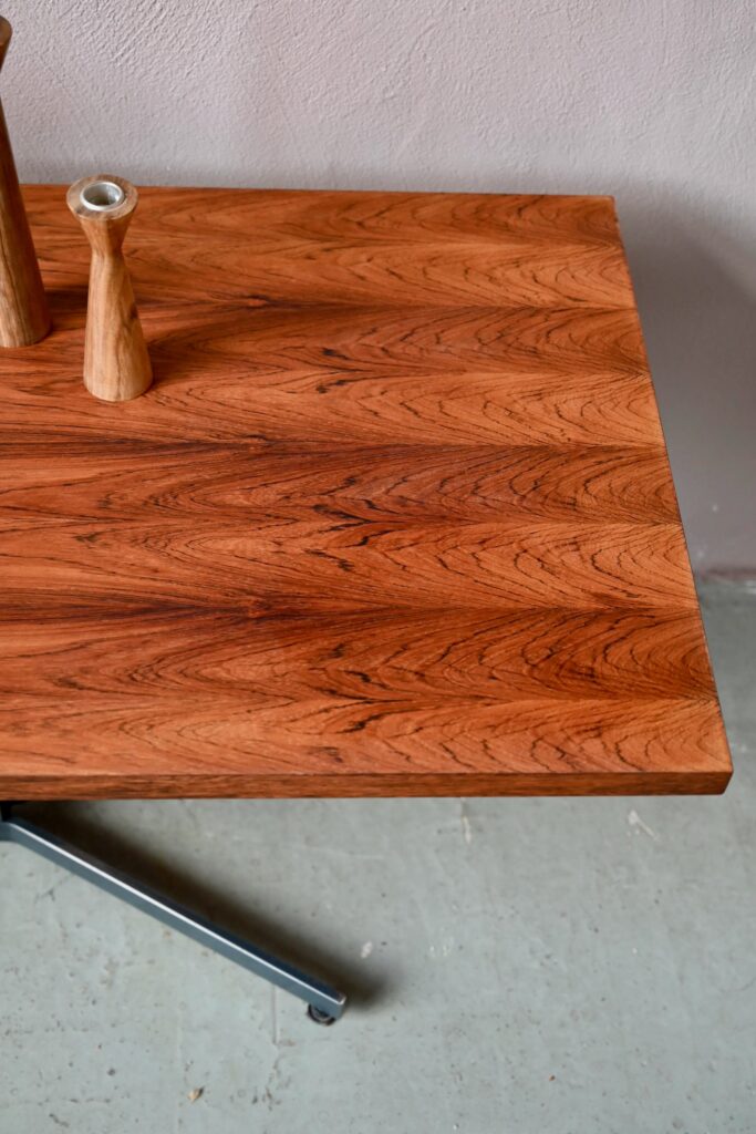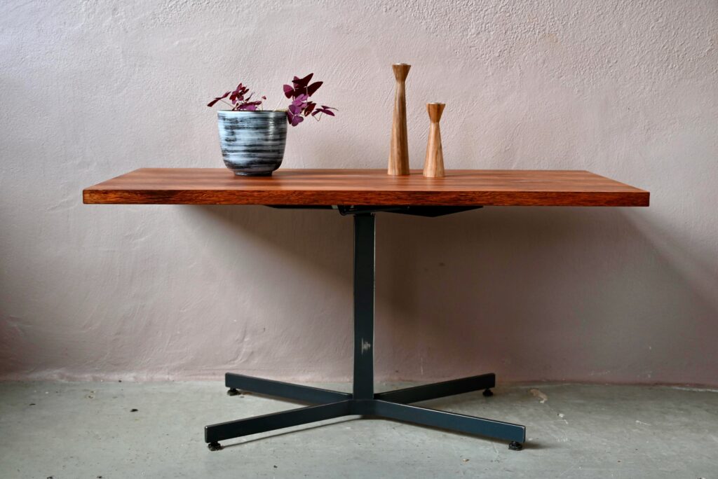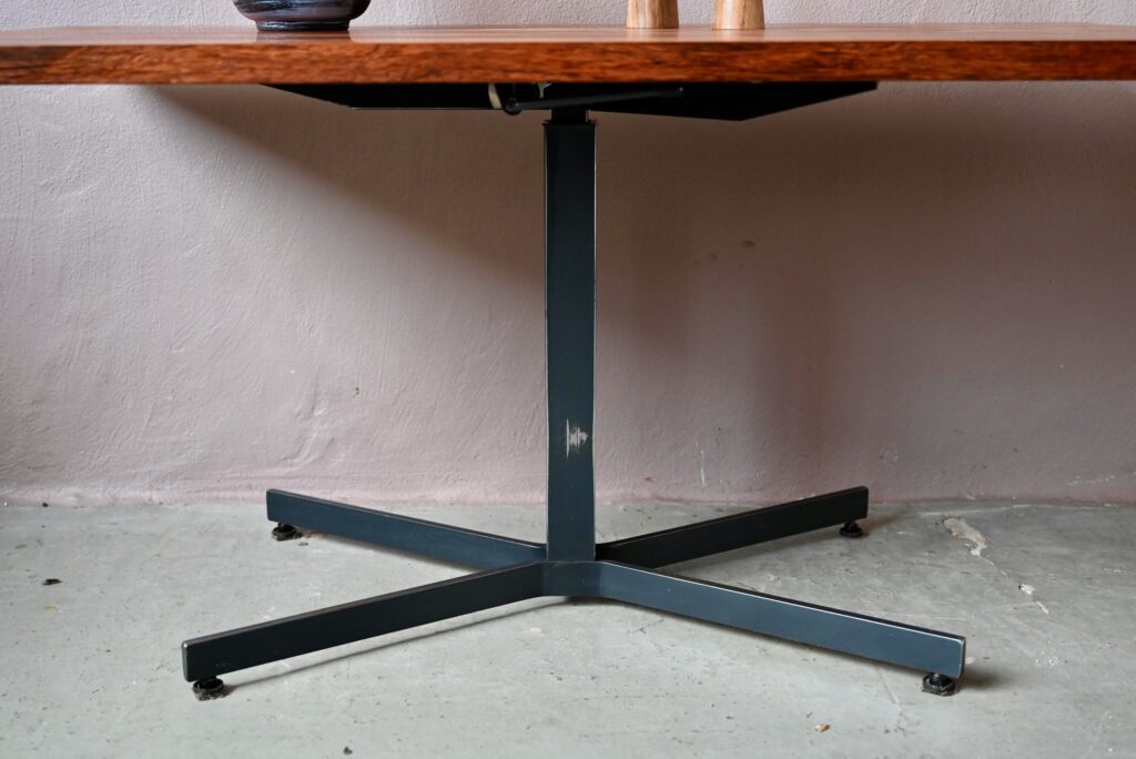 La table est ancienne et date des années 60. Elle a été éditée par le fabricant “Ilse”, une étiquette est encore présente sous le plateau. Elle est de très belle facture. Le placage du plateau, en bois exotique est superbe. La teinte est profonde et le grain fortement veiné est très beau. Le plateau est en très bel état, des frottements sont à noter sur la peinture grise du pied. Le piétement minimaliste en croix est en métal. Très stable, la table est équipée d’un pied coulissant permettant de relever ou d’abaisser le plateau grâce à un levier et un vérin. Le système fonctionne parfaitement.