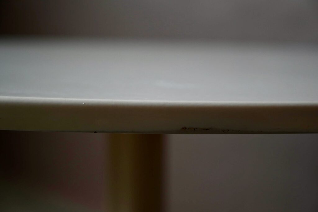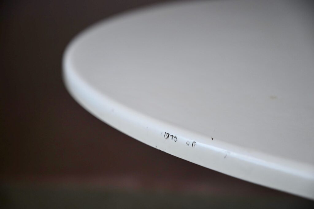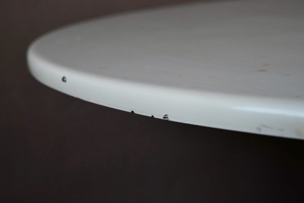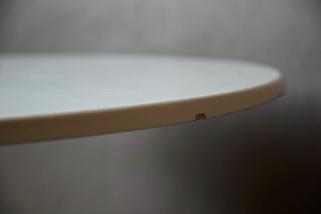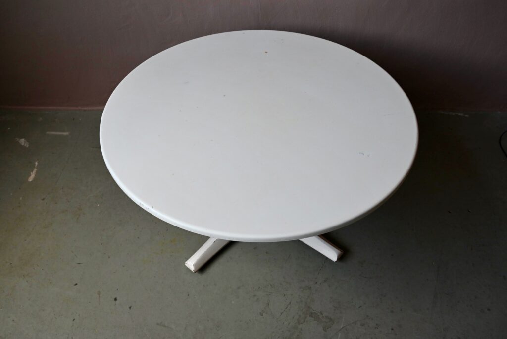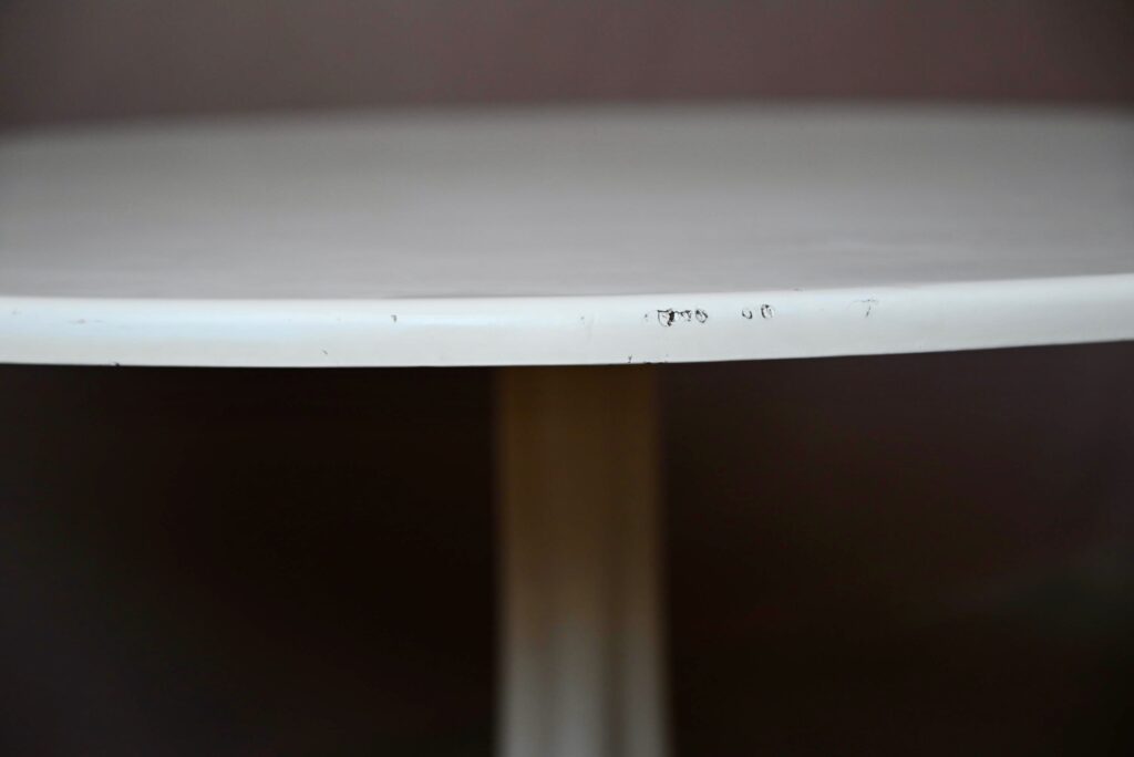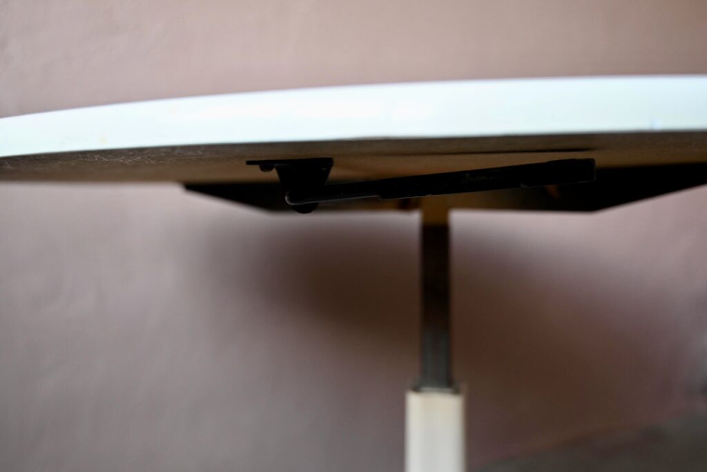 La table est ancienne et date des années 60. Elle a été éditée par le fabricant “Ilse”. Elle est de très belle facture. Le plateau rond en fibre de bois laqué est fin et superbe. Il présente des traces d’usage notamment de petites traces de brûlures visibles en photos. Des frottements sont à noter sur le piétement. Le piétement minimaliste en croix est en métal blanc, des patins de réglage sont présents. Très stable, la table est équipée d’un pied coulissant permettant de relever ou d’abaisser le plateau grâce à un levier et un vérin. Le système fonctionne parfaitement.