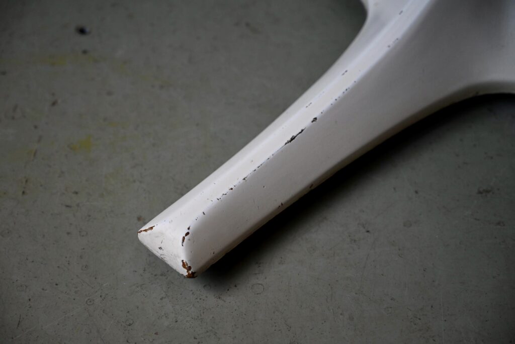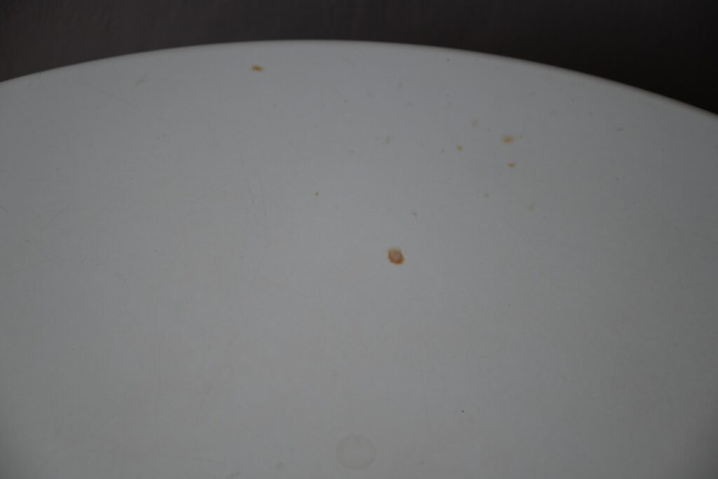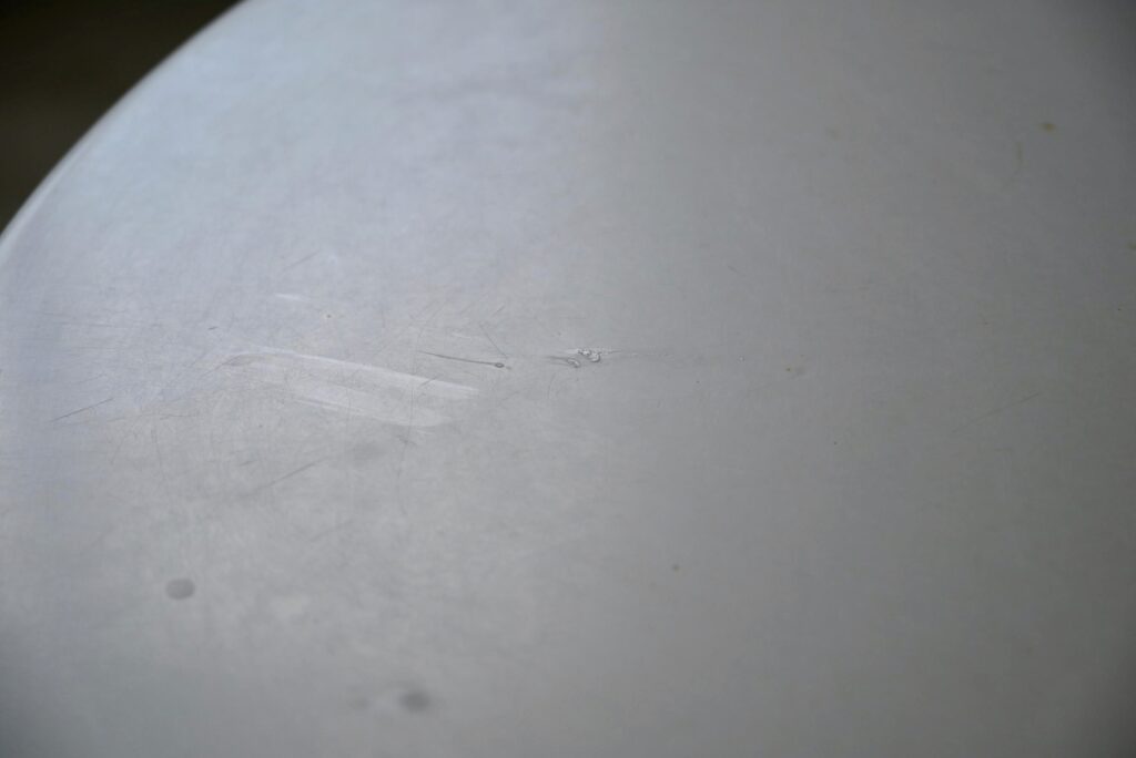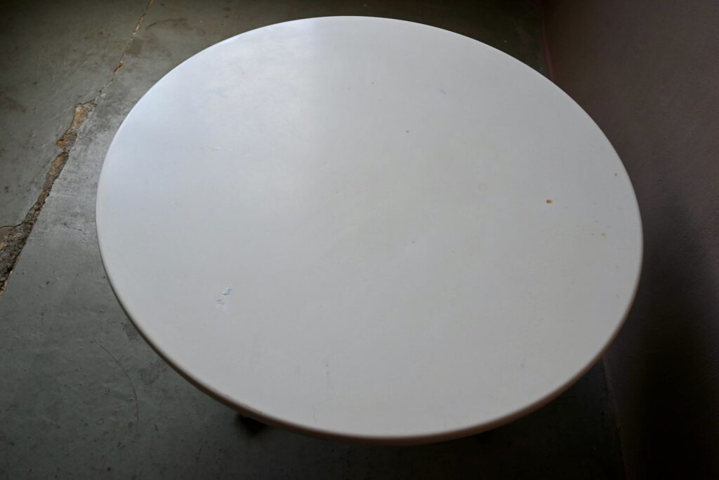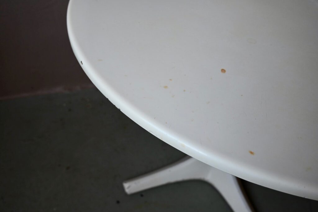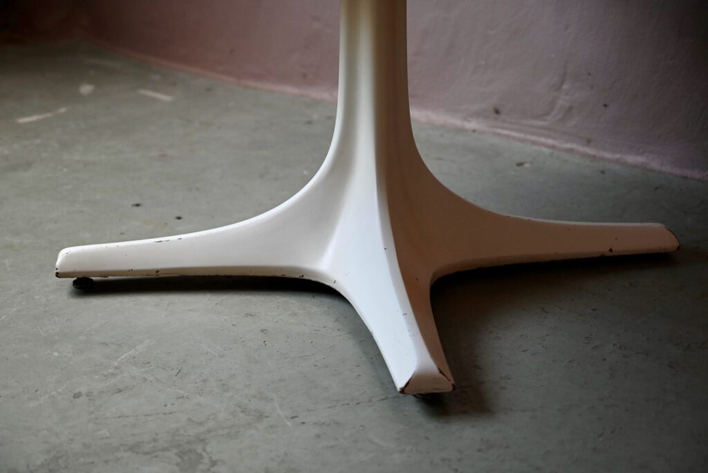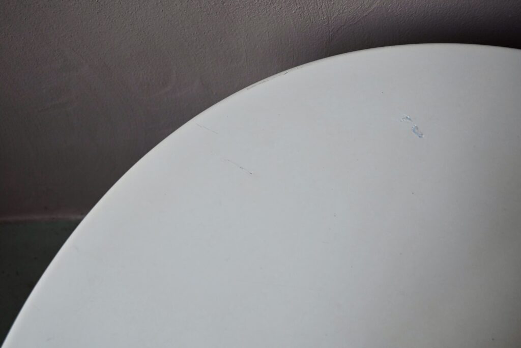La table est ancienne et date des années 60. Elle a été éditée par le fabricant “Ilse”. Elle est de très belle facture. Le plateau rond en fibre de bois laqué est fin et superbe. Il présente des traces d’usage notamment de petites traces de brûlures visibles en photos. Des frottements sont à noter sur le piétement. Le piétement minimaliste en croix est en métal blanc, des patins de réglage sont présents. Très stable, la table est équipée d’un pied coulissant permettant de relever ou d’abaisser le plateau grâce à un levier et un vérin. Le système fonctionne parfaitement.