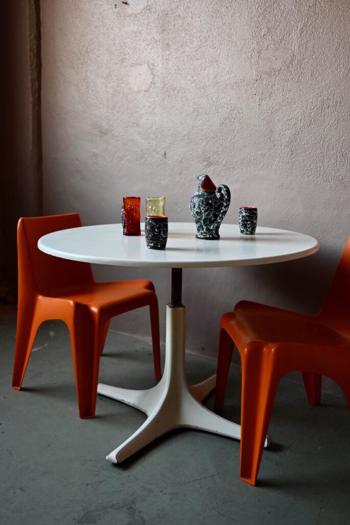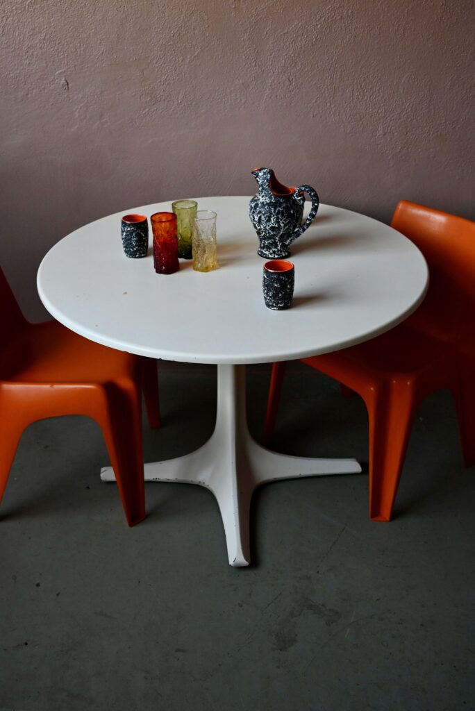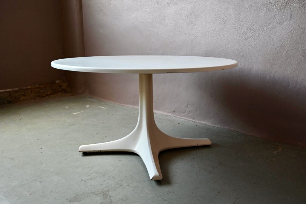 Parer aux imprévus, avec classe! Cette table ronde monte & baisse des années 60 éditée par “Ilse” vous permettra de passer de l’apéritif au plat principal d’une simple pression sur son levier astucieux. Ronde et blanche dans sa totalité, cette table rétro affiche un look Space Age bien trempé. Le piétement en croix en métal blanc profilé est futuriste et assure une grande stabilité. Alliée parfaite des espaces restreints, cette table éditée par Ilse est aussi belle que pratique.