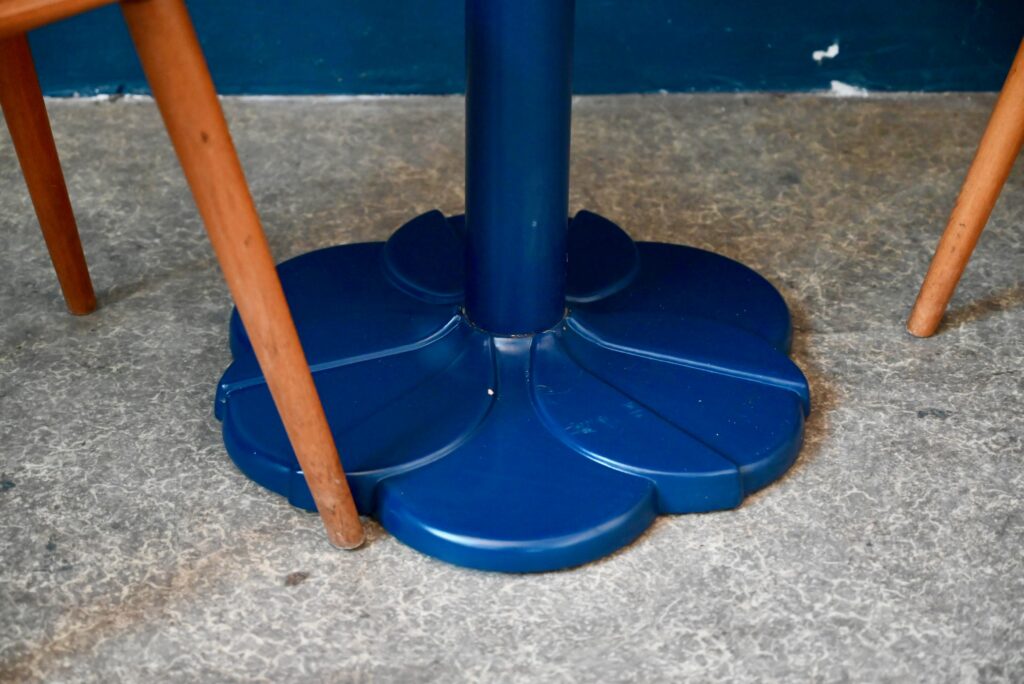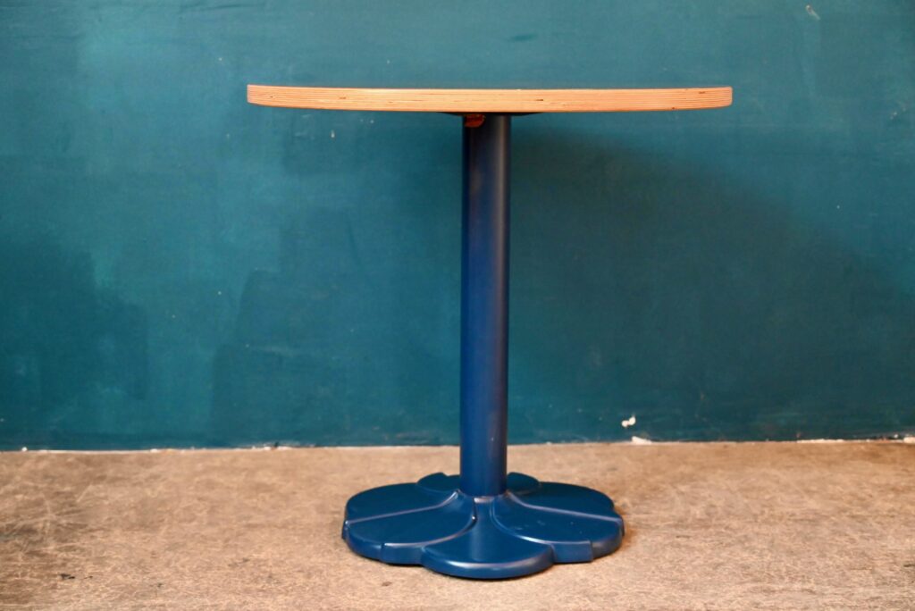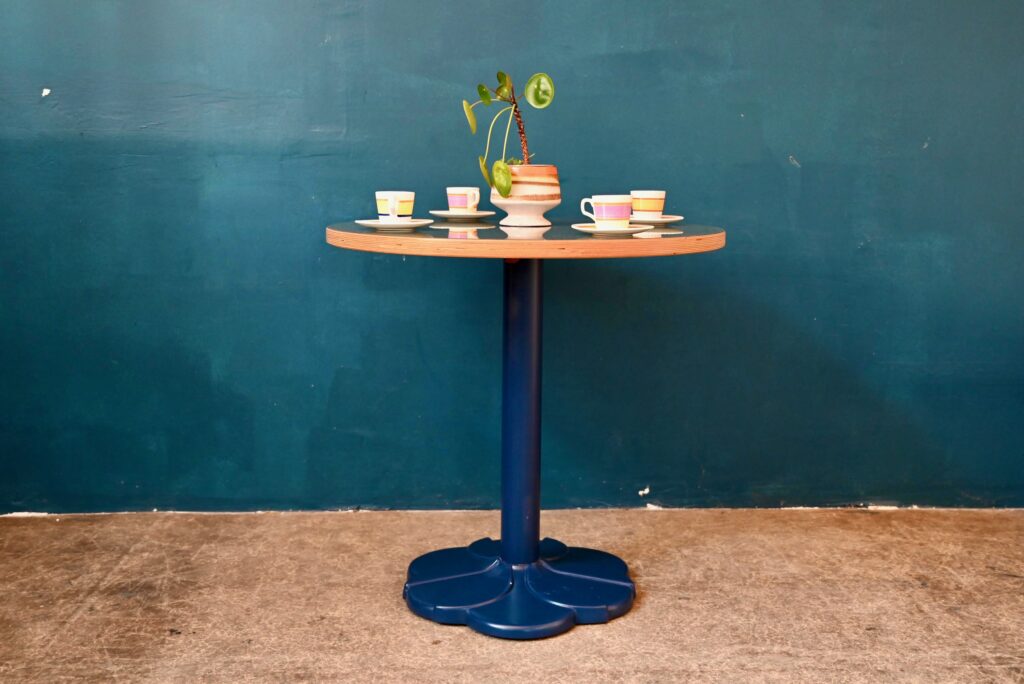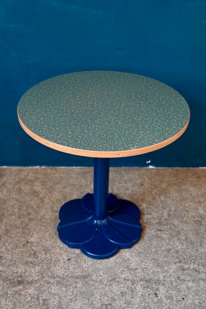 Avec son pied central moulé en forme de fleur stylisée de couleur bleu et son plateau rond en mélaminé pimpant-chant en bois contrecollé, voici une petite table qui ne manque pas d’allure. Jolie alliance de modernité et de tradition, le pied de cette table bistrot s’inspire des lignes Art Déco tout en mariant les matériaux modernes et de qualité. Sa silhouette marquante et haute en couleurs lui confèrent charme et originalité. Nous l’imaginons dans une petite cuisine vitaminée. En série, ce modèle fera mouche dans une jolie pâtisserie ou un charmant troquet à la personnalité assumée!