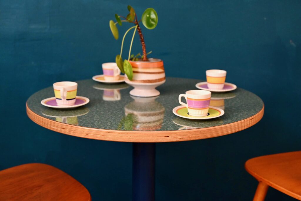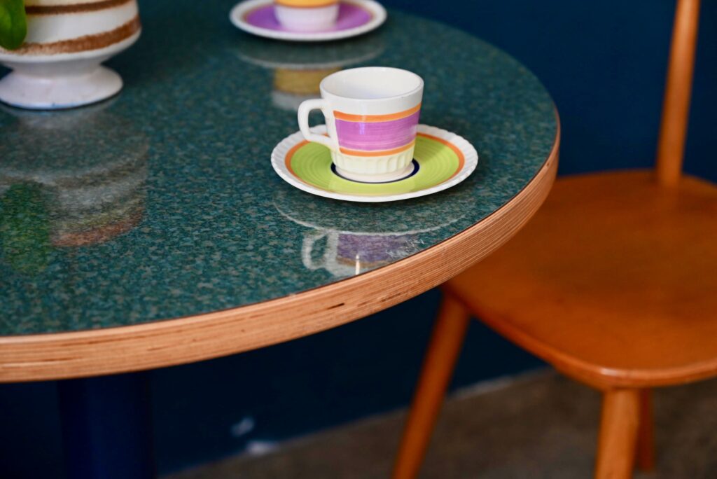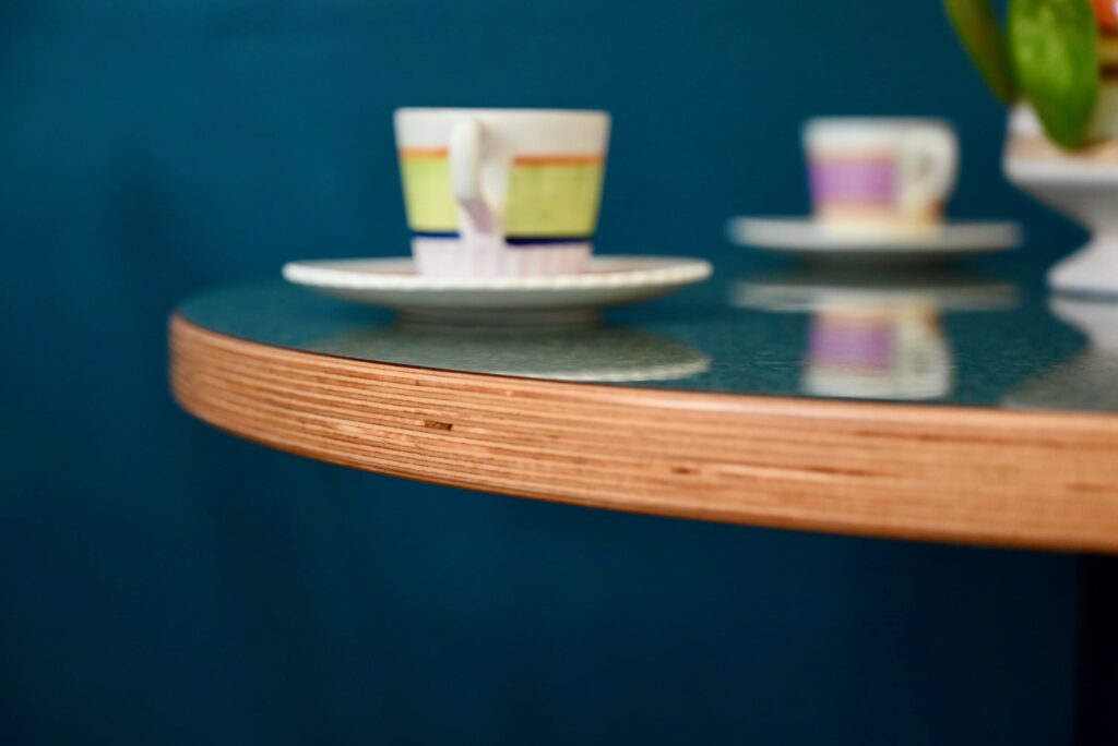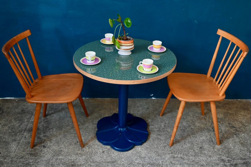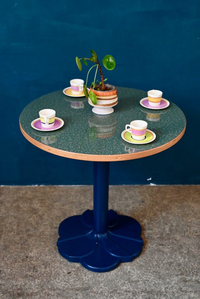 Avec son pied central moulé en forme de fleur stylisée de couleur bleu et son plateau rond en mélaminé pimpant-chant en bois contrecollé, voici une petite table qui ne manque pas d’allure. Jolie alliance de modernité et de tradition, le pied de cette table bistrot s’inspire des lignes Art Déco tout en mariant les matériaux modernes et de qualité. Sa silhouette marquante et haute en couleurs lui confèrent charme et originalité. Nous l’imaginons dans une petite cuisine vitaminée. En série, ce modèle fera mouche dans une jolie pâtisserie ou un charmant troquet à la personnalité assumée!