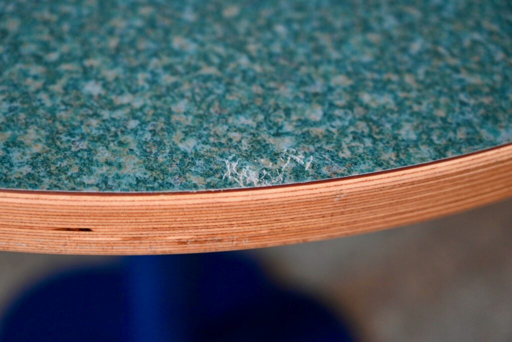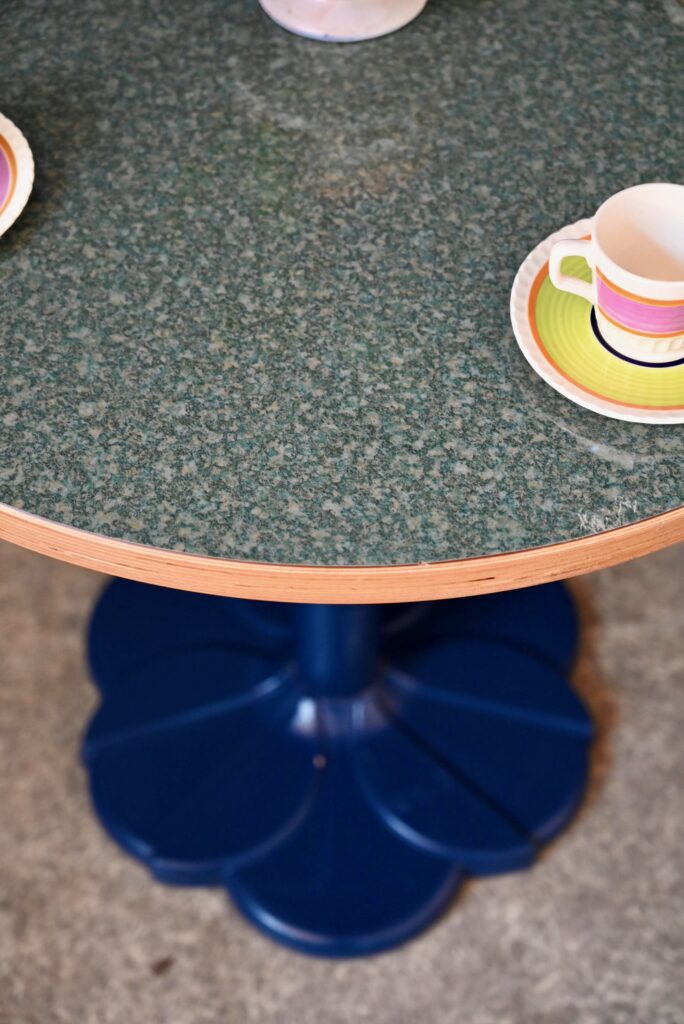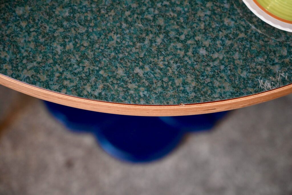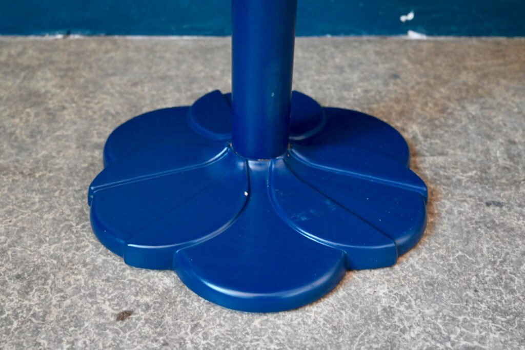 La table date des années 90. Elle est réalisée en fonte et aggloméré de bois pour le piétement de couleur bleu sombre. Le plateau en bois contrecollé de belle épaisseur, très déco sur le chant du plateau. Celui-ci est en mélaminé épais, motif granit nuances de bleu. Il est très brillant et en bel état. La table est lourde, en très bel état, originale et de dimensions compactes. Les traces d’usage sont minimes. Convient de 2 à 4 personnes. Nous disposons de 10 pièces, n’hésitez pas à nous contacter pour la réalisation d’un projet professionnelle.