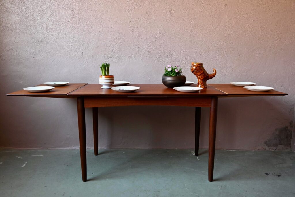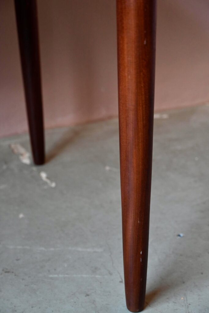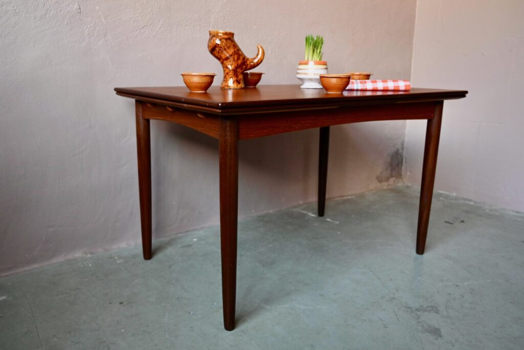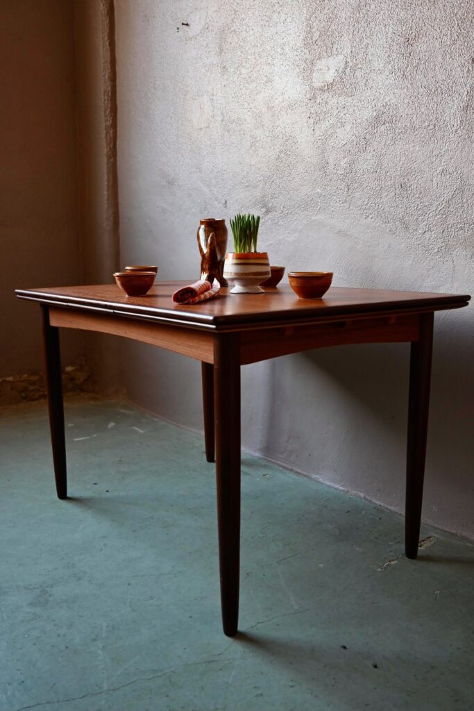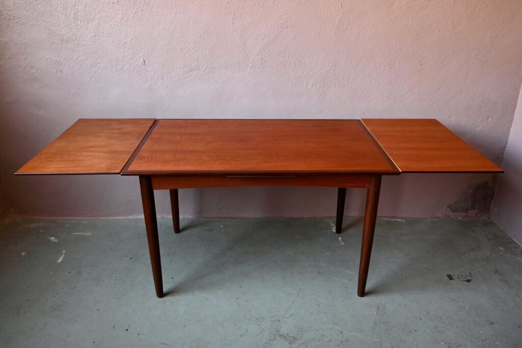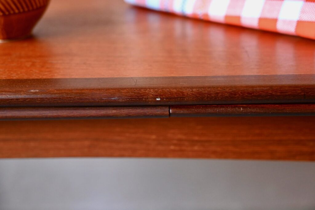 La table est de belles dimensions, pratique et modulable avec ses rallonges intégrées. C’est un modèle de belle fabrication, aux détails soignés. La table est en teck et placage teck. Elle est parfaitement fonctionnelle, notamment au niveau du système de rallonges. Elle est ancienne et a été utilisée, elle présente donc quelques discrètes traces d’usage et d’usure. Un accroc est à noter sur la tranche, visible en photo. Le plateau est patiné par endroit et des rayures discrètes sont visibles. Les rallonges sont d’une teinte légèrement différente de celle du plateau, un petit manque de placage est à noter. Les pieds sont démontables. La table en teck est une production scandinave des années 60.