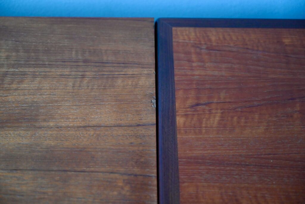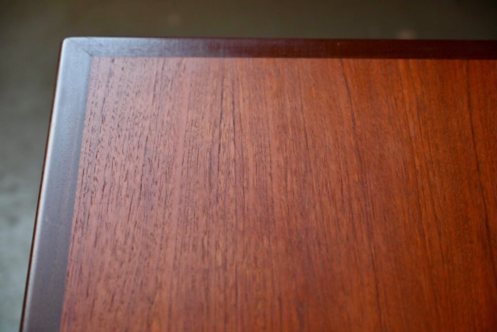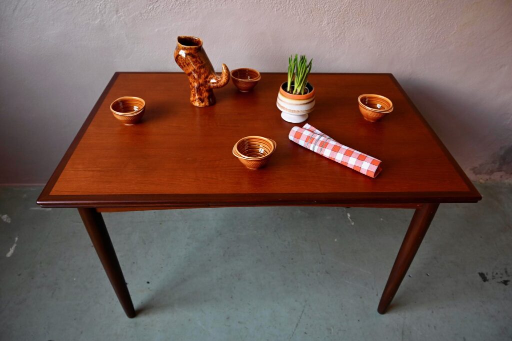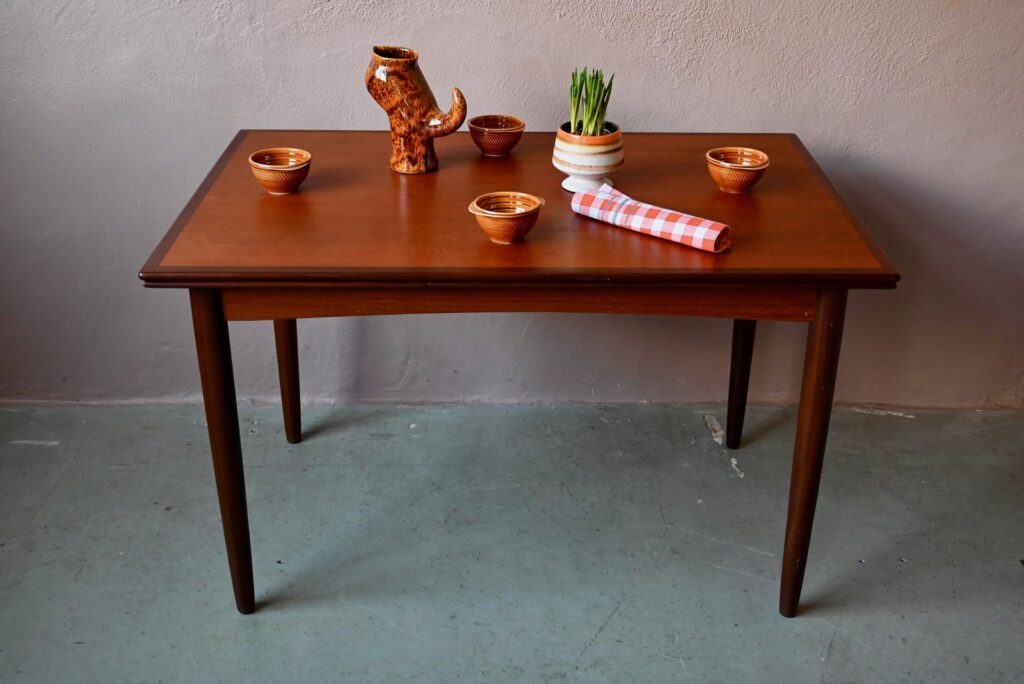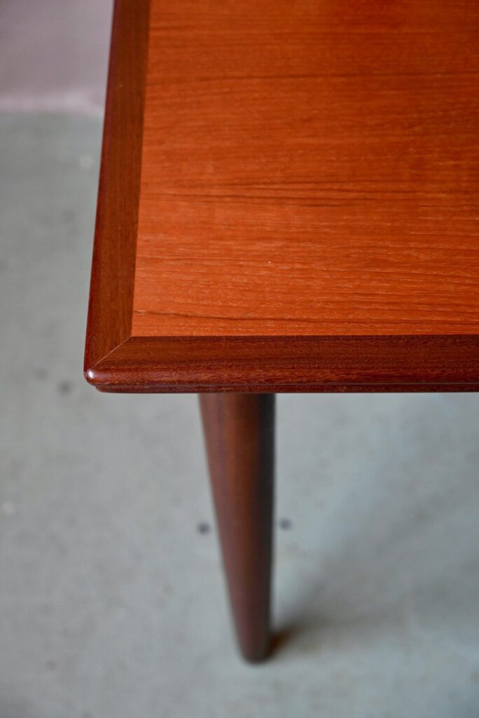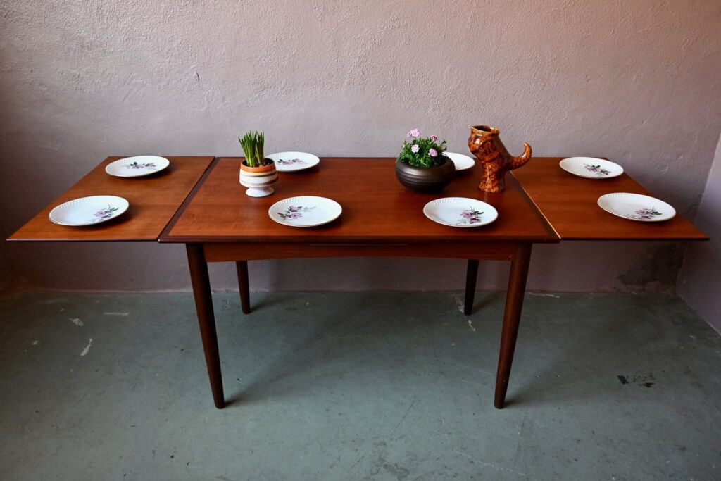 La table est de belles dimensions, pratique et modulable avec ses rallonges intégrées. C’est un modèle de belle fabrication, aux détails soignés. La table est en teck et placage teck. Elle est parfaitement fonctionnelle, notamment au niveau du système de rallonges. Elle est ancienne et a été utilisée, elle présente donc quelques discrètes traces d’usage et d’usure. Un accroc est à noter sur la tranche, visible en photo. Le plateau est patiné par endroit et des rayures discrètes sont visibles. Les rallonges sont d’une teinte légèrement différente de celle du plateau, un petit manque de placage est à noter. Les pieds sont démontables. La table en teck est une production scandinave des années 60.