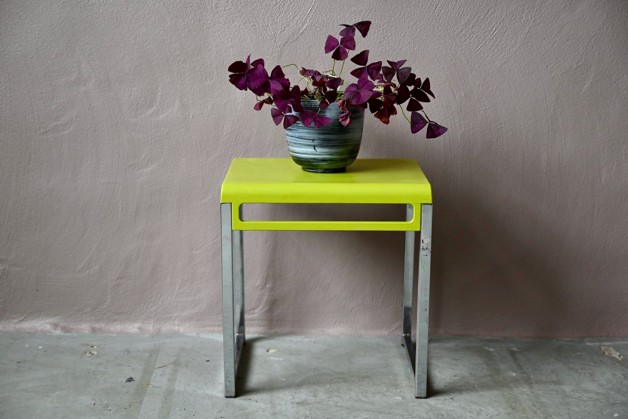La table ou mini-guéridon est bel état. Le chrome présente des traces d’oxydation importantes par endroits, visibles en photo. Le plateau est vert pomme. Il présente des traces d’usage visibles à la surface du plastique. Son design est très typé des années 70. Ce coloris n’est pas courant.