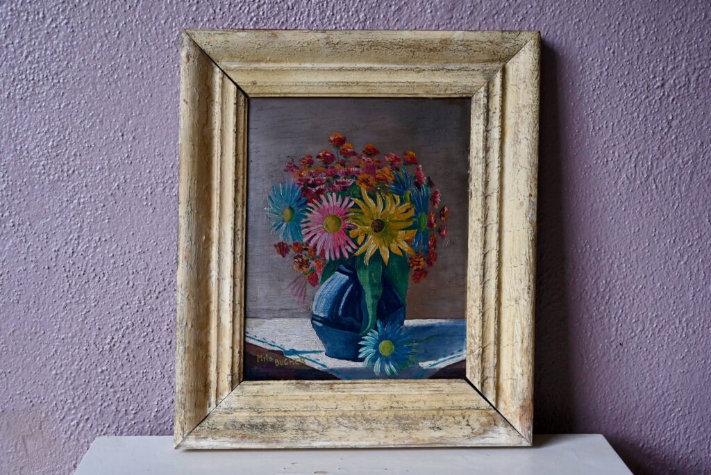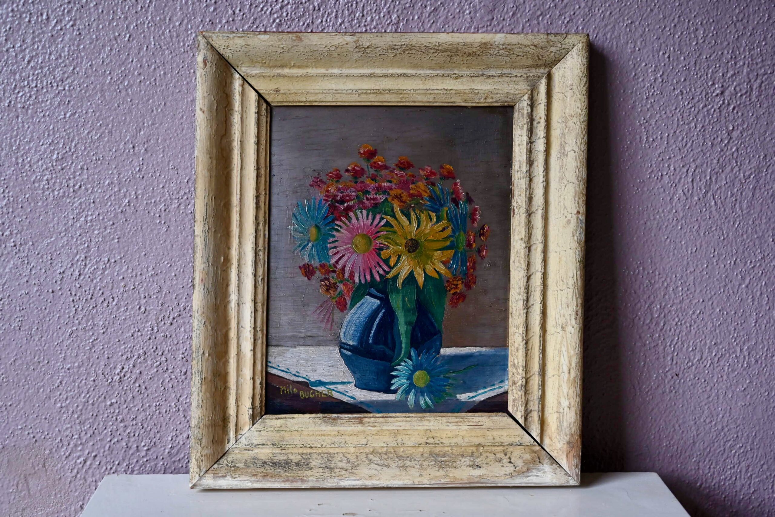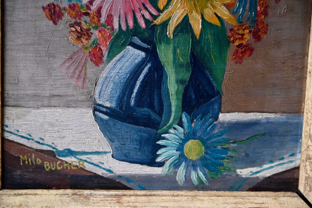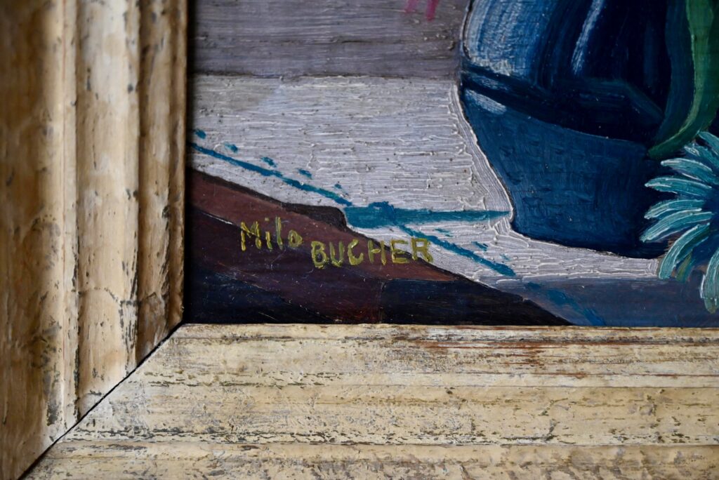 Huile sur toile de Milo Bucher. Elle est ancienne. Signé par l’artiste en bas à gauche. Tableau en bon état, couleurs fraîches, des traces du temps sur le cadre qui présente un petit décalage d’angle.