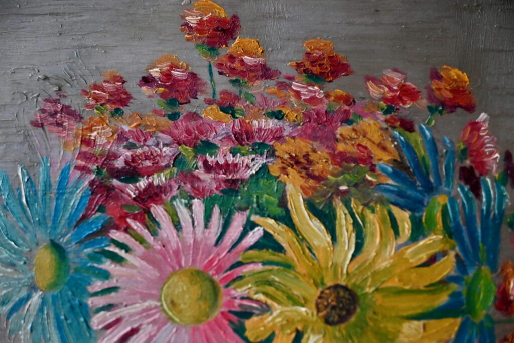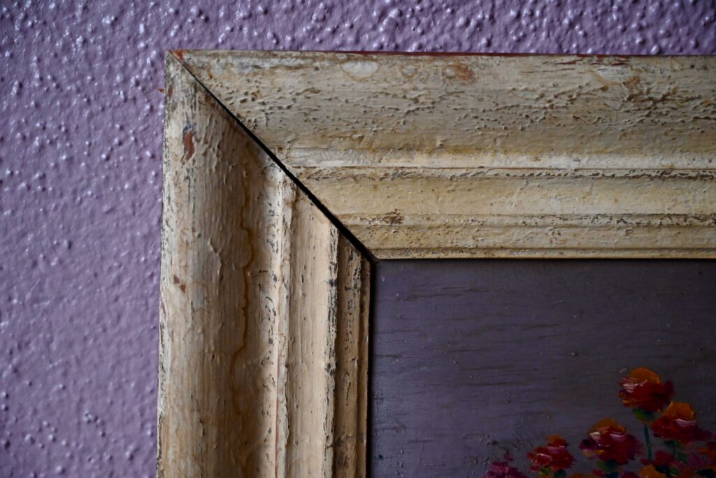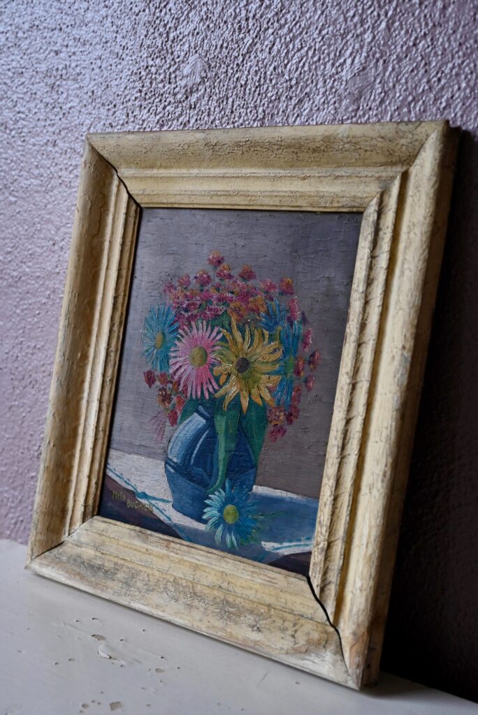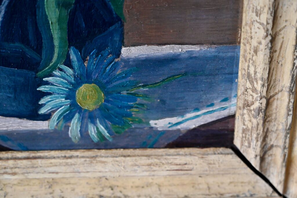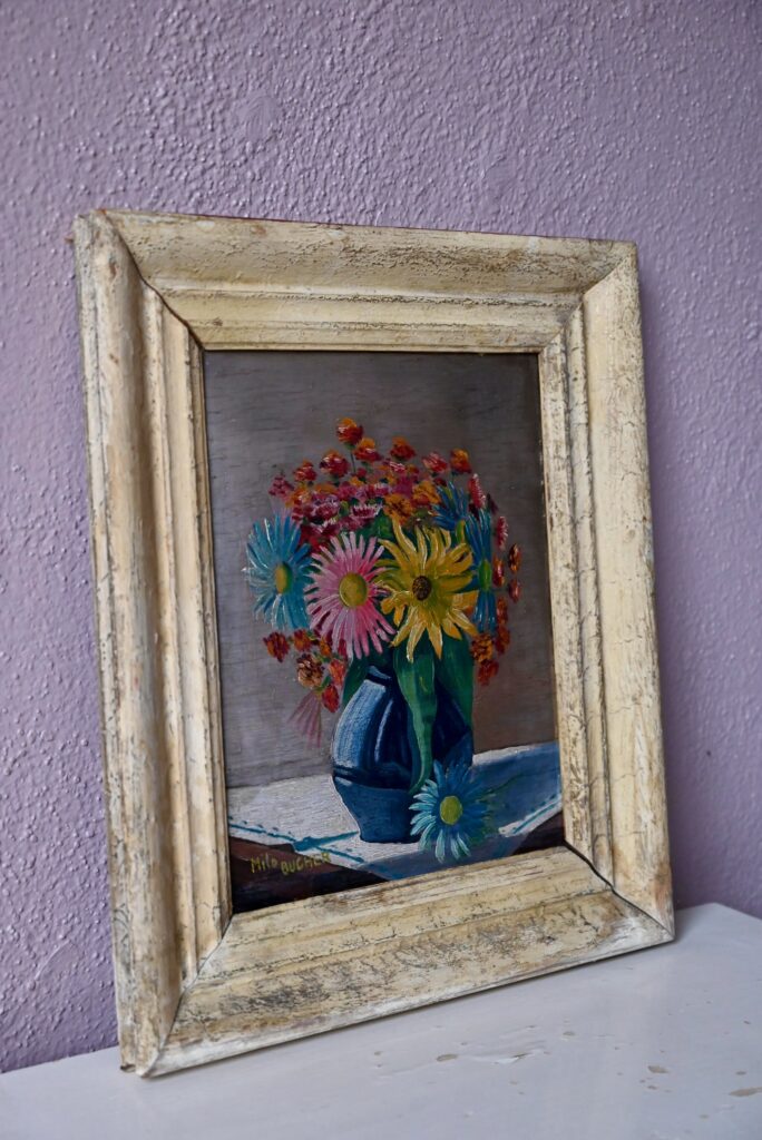 Huile sur toile de Milo Bucher. Elle est ancienne. Signé par l’artiste en bas à gauche. Tableau en bon état, couleurs fraîches, des traces du temps sur le cadre qui présente un petit décalage d’angle.