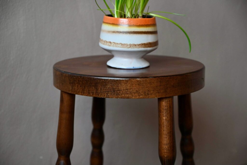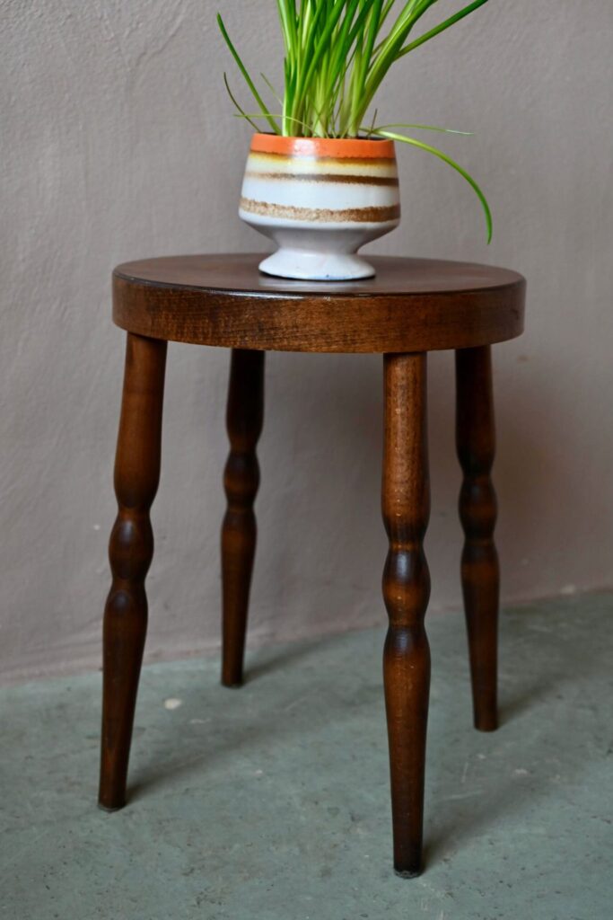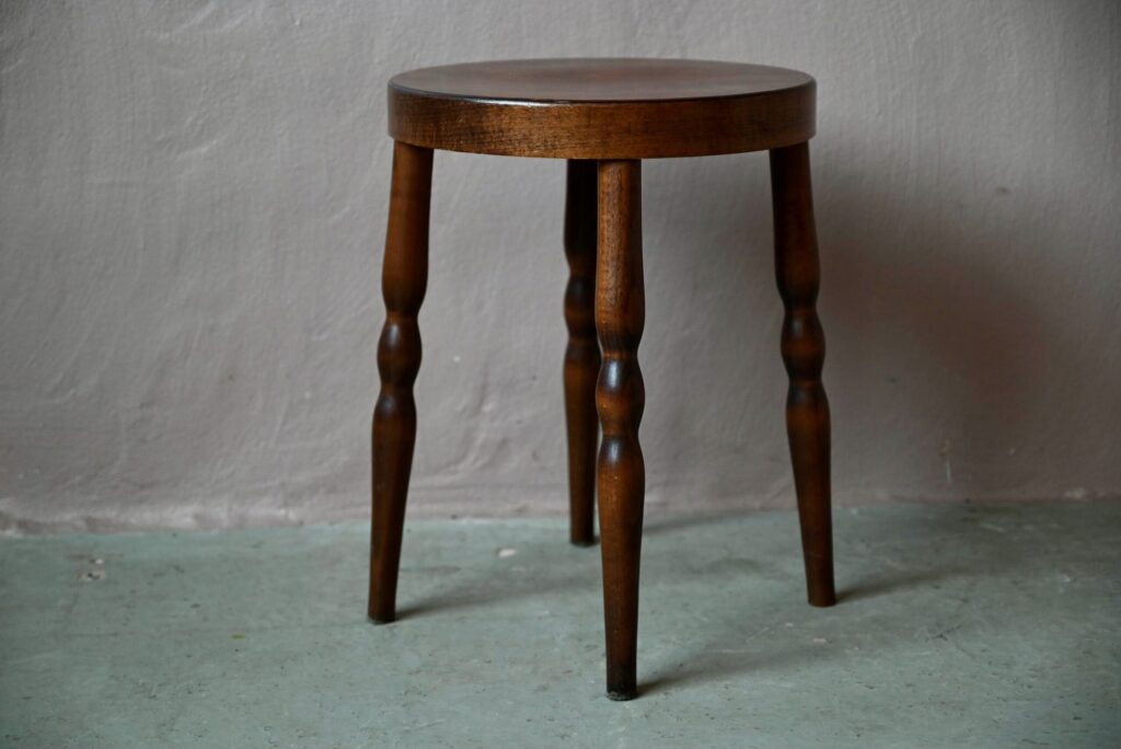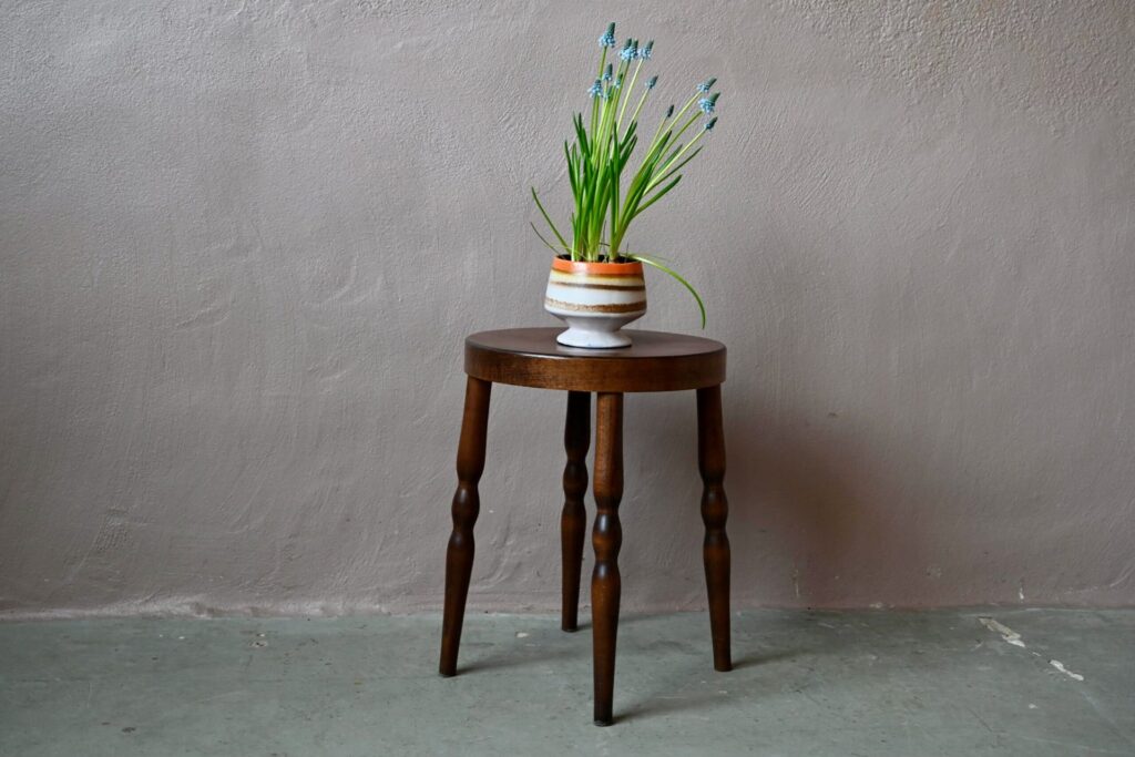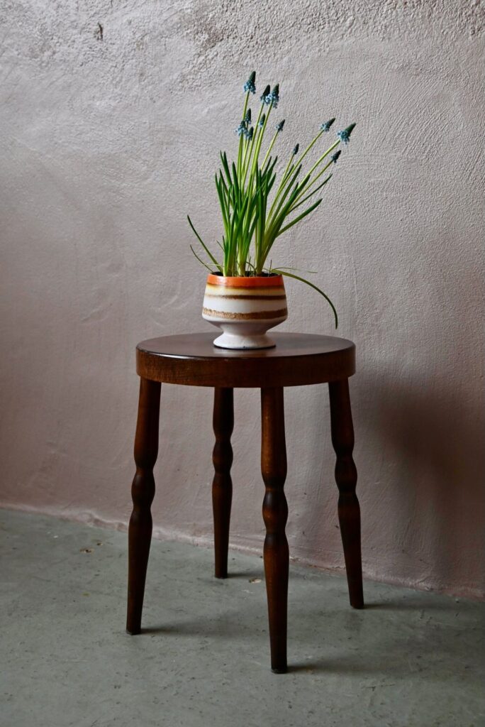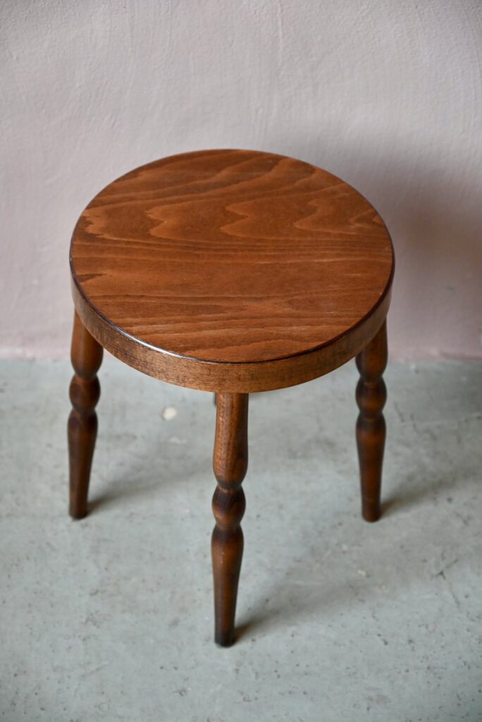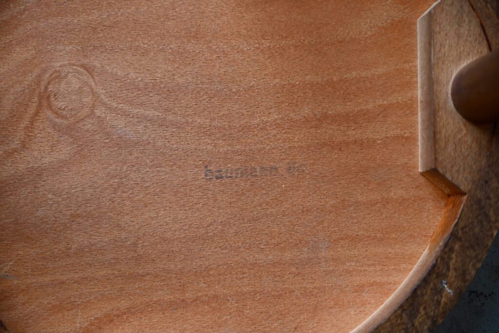 Le tabouret peut être utilisé en assise d’appoint ou comme petite table, porte-plantes, chevet ou sellette. Il est en bel état. Un tampon “Baumann” est présent sous l’assise.