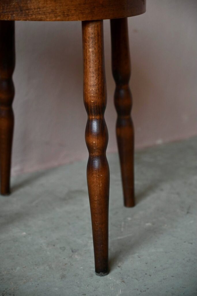 Ce tabouret Baumann est un classique du mobilier vintage. Réalisé en hêtre courbé de teinte profonde, il possède un look classique et bohème à la fois. Son assise ronde est large at confortable, l’accent est mis sur un piétement élégant en bois tourné.
