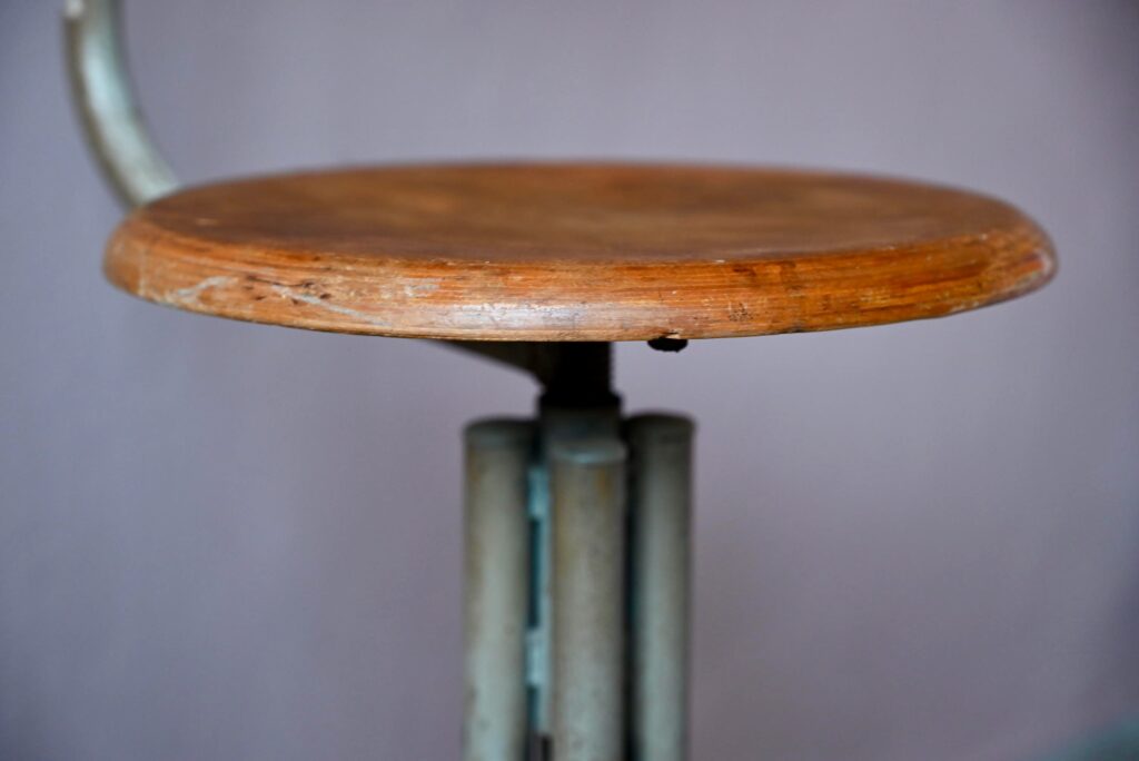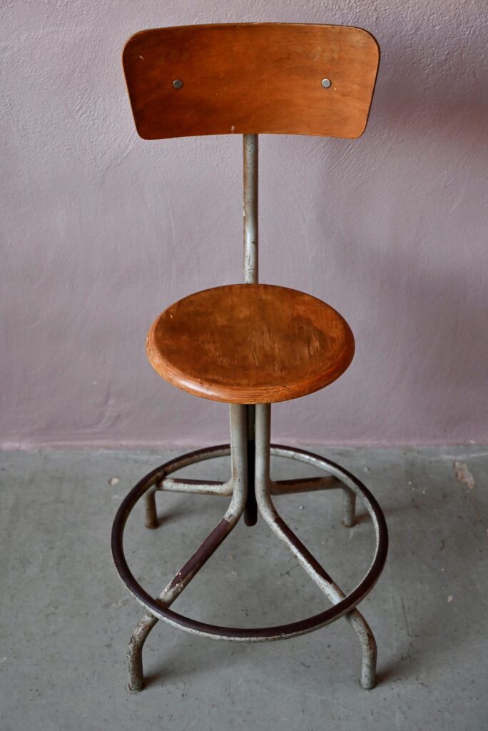 Des lignes fleurant bon la vie d’un atelier et une patine intense animent ce tabouret indus des années 50. Avec son piétement en métal tubulaire patiné et son assise et dossier en bois, ce tabouret haut est touchant. Pour cette pièce originale, l’ergonomie n’est pas oubliée avec un repose-pieds circulaire, une hauteur d’assise réglable et un dossier inclinable.