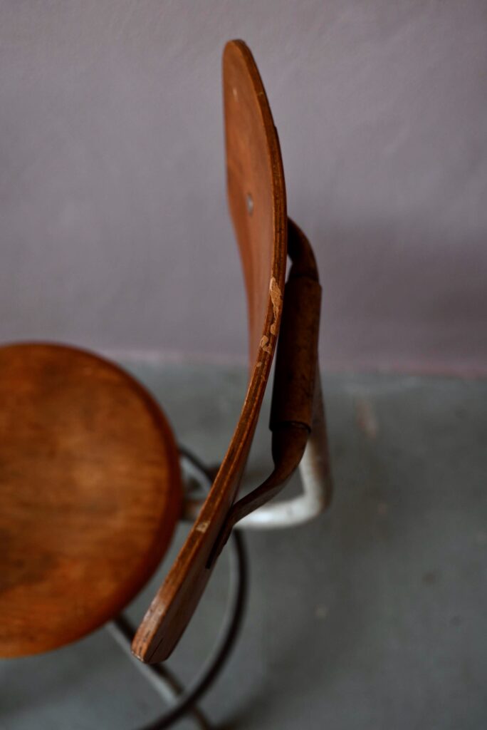 Le piétement est en métal tubulaire, un arceau repose-pieds est présent. Le métal est patiné et présente des marques d’oxydation. Assise et dossier sont en contreplaqué, il présente des marques d’usage et quelques taches, ainsi que que d’importants manques de placage visibles en photo. Il est réglable en hauteur et pivotant. Le dossier est inclinable et ergonomique.