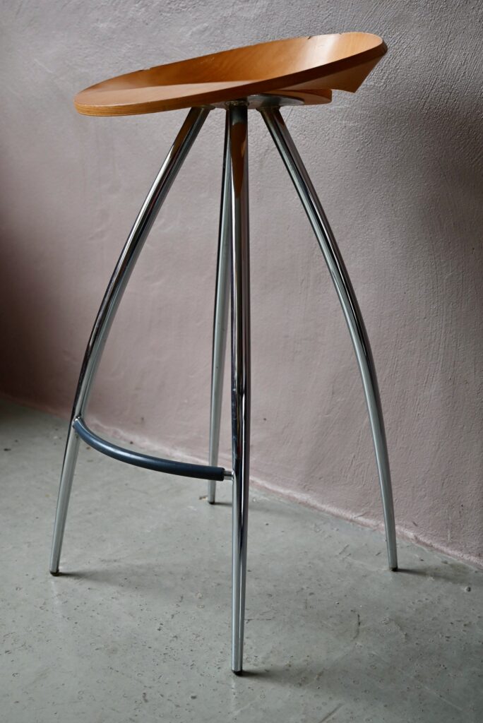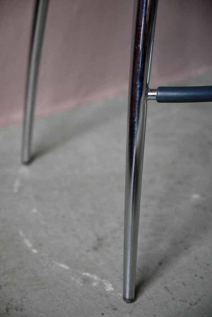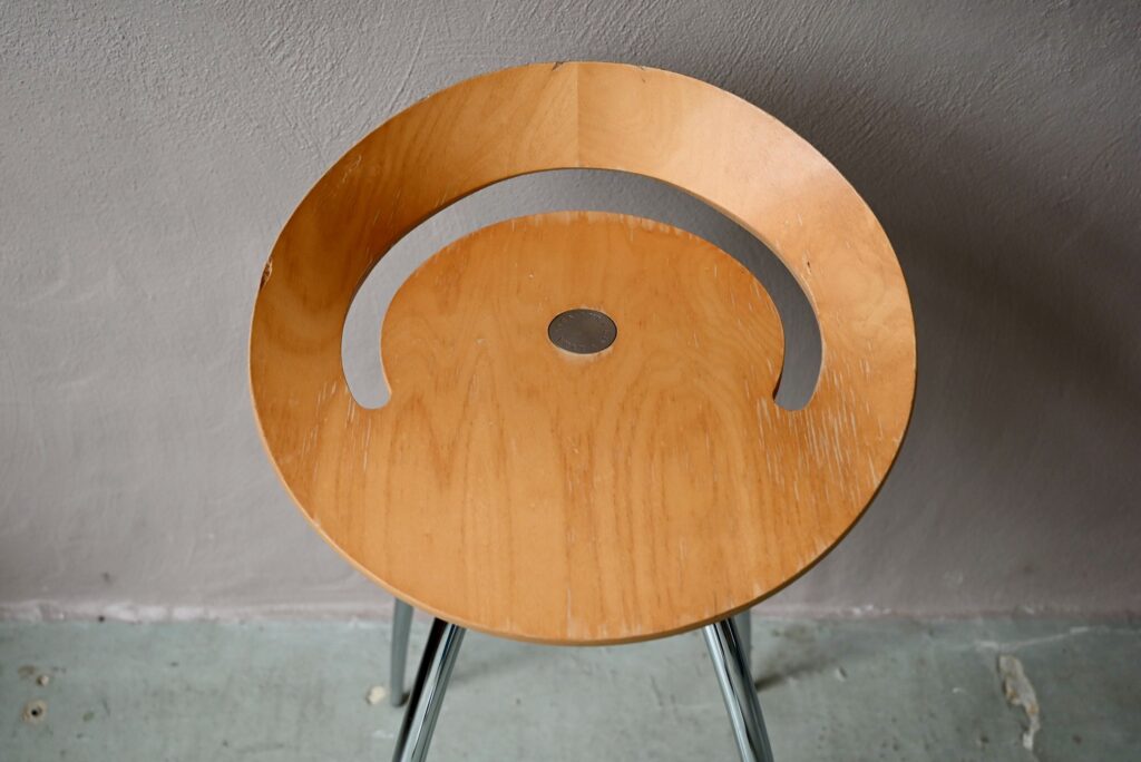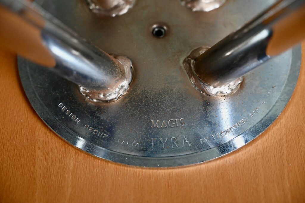 Le tabouret est en chrome et contreplaqué de hêtre clair. Il présente quelques traces d’usage sur l’assise, de petits manques visibles en photo. Le nom du modèle “Lyra” est visible sur l’assise et l’éditeur “Magis” est mentionné sous celle-ci. Le tabouret est lourd et stable. Un repose-pied est présent et couvert d’un caoutchouc anti-dérapant.