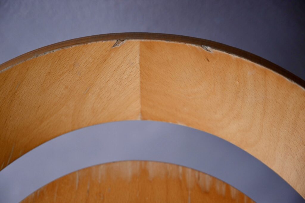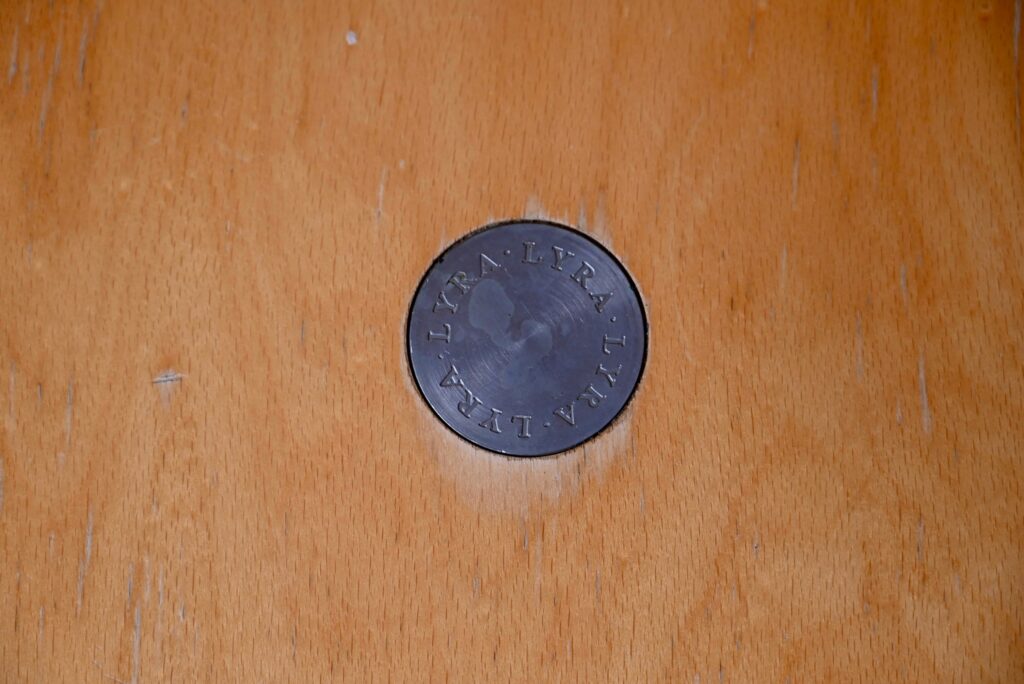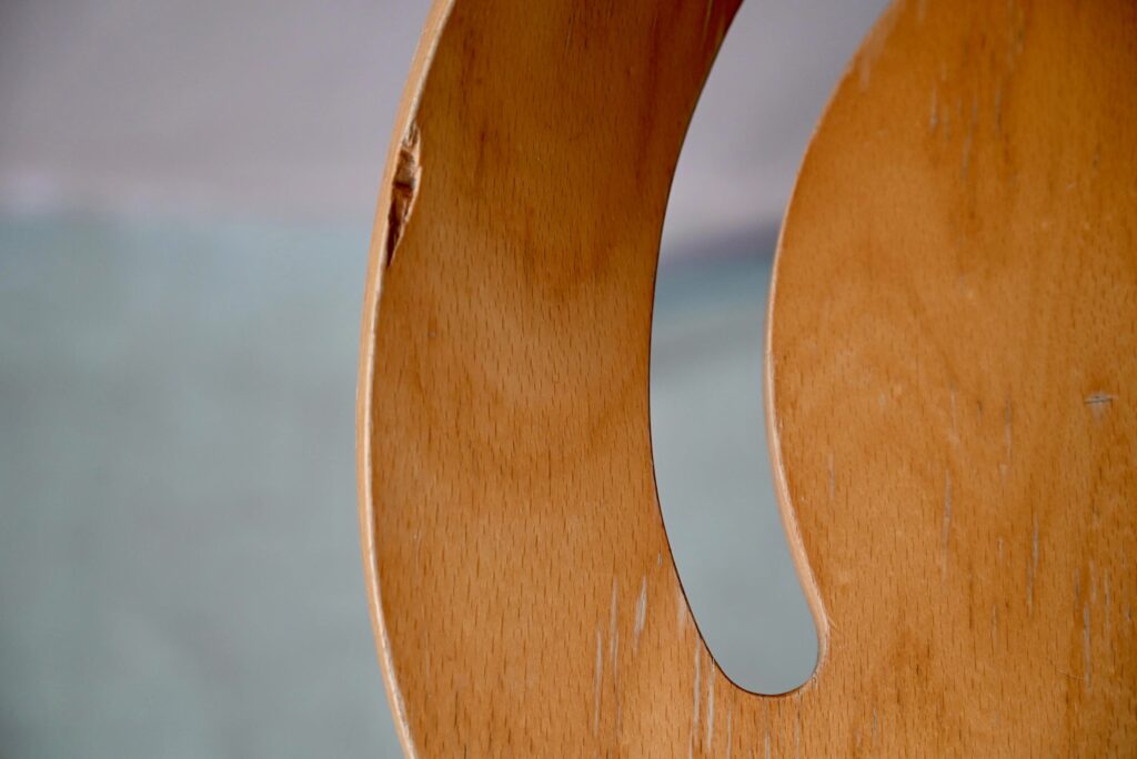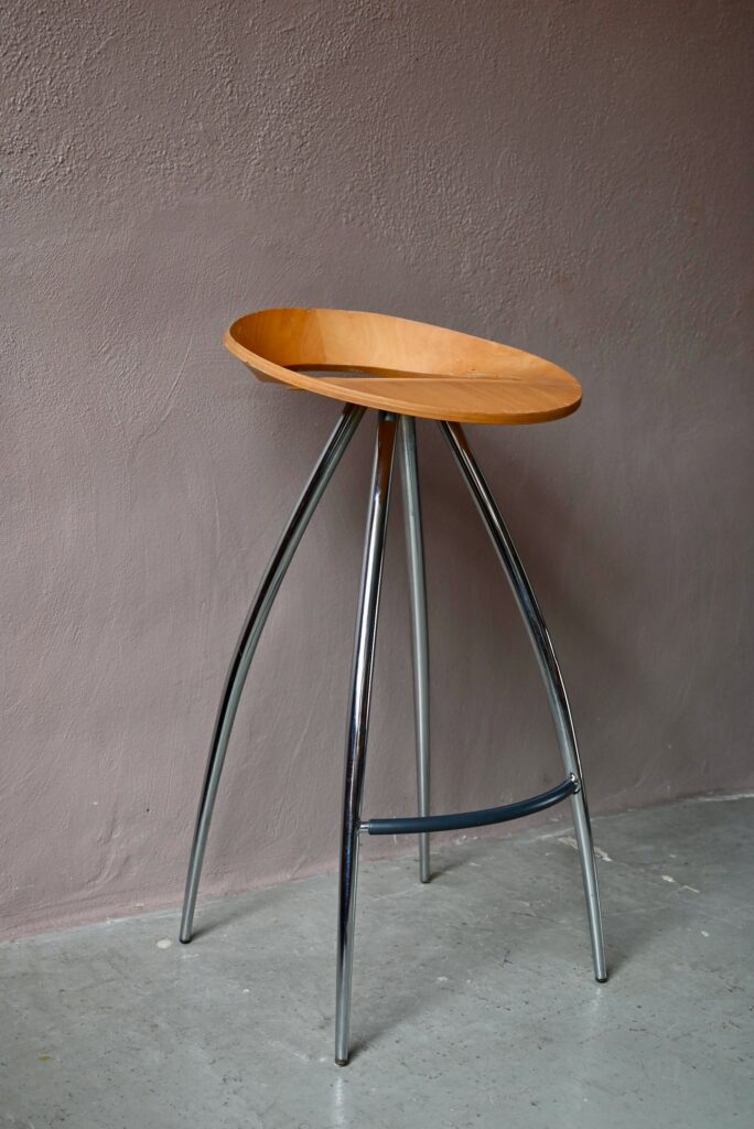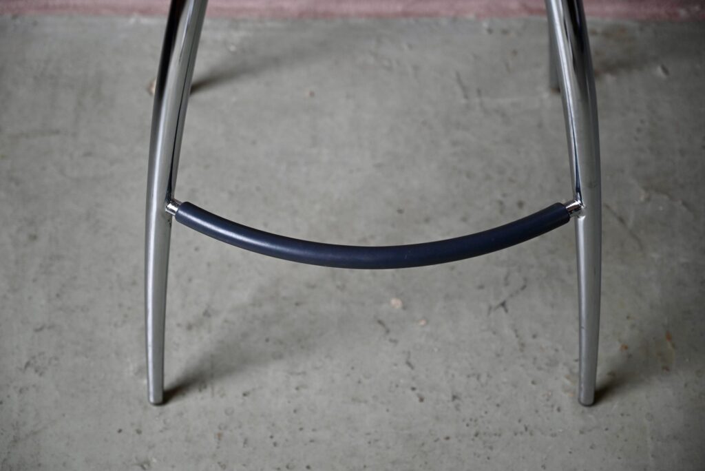 Le tabouret est en chrome et contreplaqué de hêtre clair. Il présente quelques traces d’usage sur l’assise, de petits manques visibles en photo. Le nom du modèle “Lyra” est visible sur l’assise et l’éditeur “Magis” est mentionné sous celle-ci. Le tabouret est lourd et stable. Un repose-pied est présent et couvert d’un caoutchouc anti-dérapant.