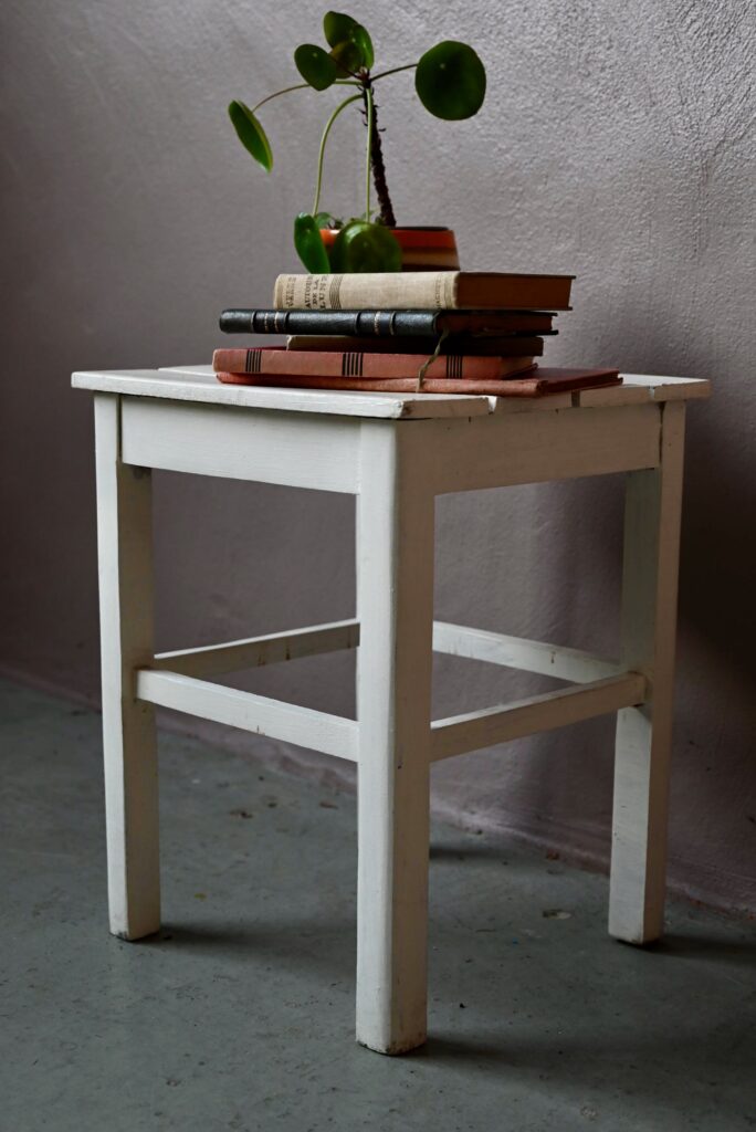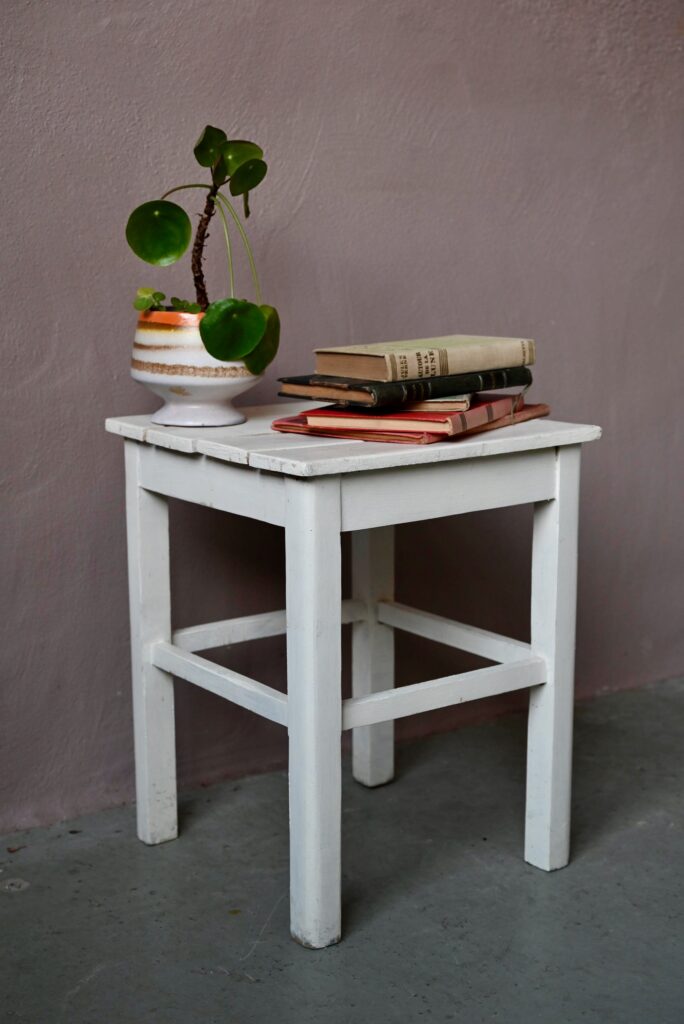 Ce mignon petit tabouret date des années 50. Entièrement en bois, la peinture blanche est patinée par les années et la fonction. Il a beaucoup de charme. Il deviendra un parfait porte-plantes bohème ou un chevet minimaliste wabi-sabi… On aime son air bohème!