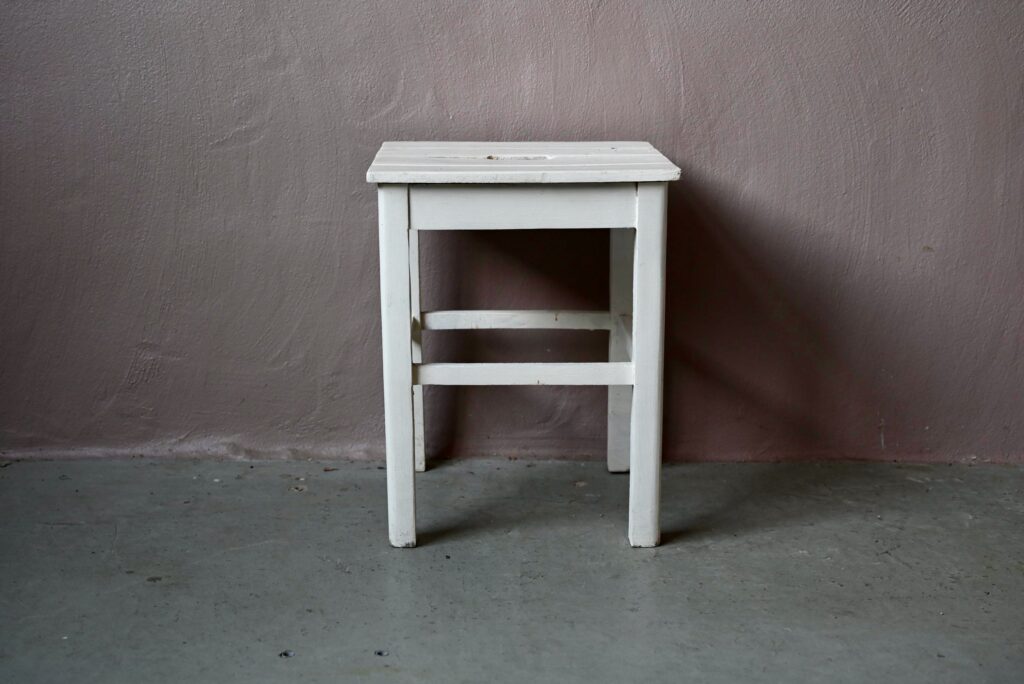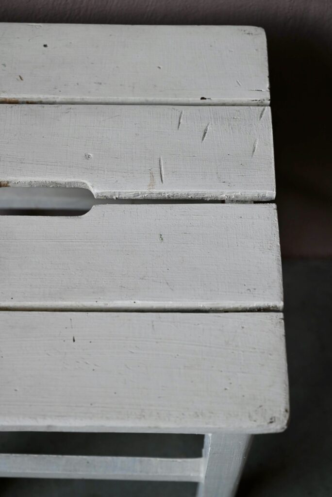 Le tabouret est ancien, la peinture blanche est d’origine et patinée. Il est en bois massif.