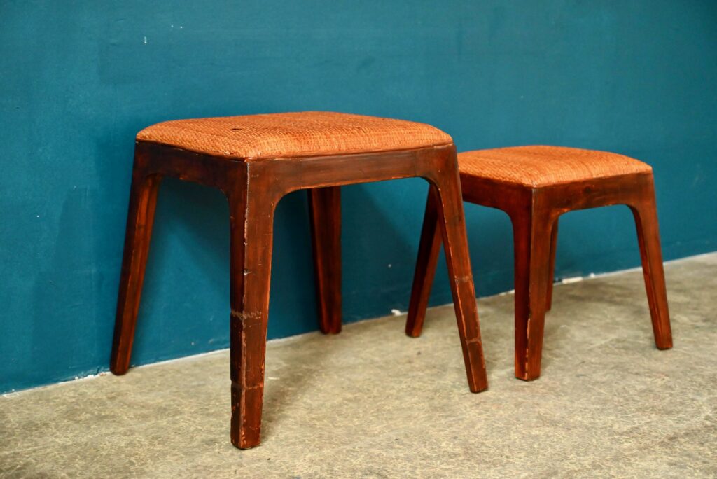 Les 2 tabourets sont en bois, avec une assise de paille cannée. Ils ont été utilisés avec intensité, la patine est touchante. L’ensemble est parfaitement fonctionnel. Une trace brulée est présente sur une des assises. Il n’y a pas de trou dans le cannage.