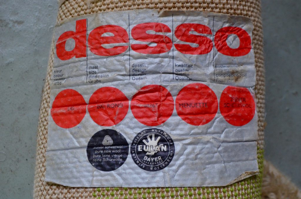 Le tapis Space Age est ancien, en laine, de teinte beige et nuances de vert. Il est rond. Il date des années 70 et est en bon état. Le tapis est propre et dénué d’odeurs, il ne montre que de très légères traces d’usage.
