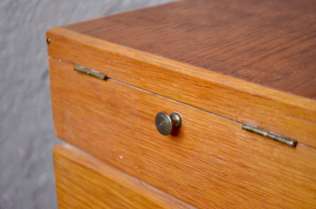 La travailleuse date des années 60. Elle dispose d’un caisson en bois comprenant des boîtes à compartiments. La teinte miel est douce et lumineuse. De légères tâches d’usage sont visibles sur les photos. Le piétement compas est en métal tubulaire noir. Celui-ci comprend un porte-revues agrémenté de fils de scoubidou jaune. Stable, cette couturière est une jolie pièce vintage.