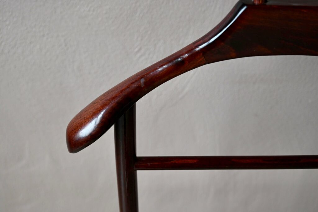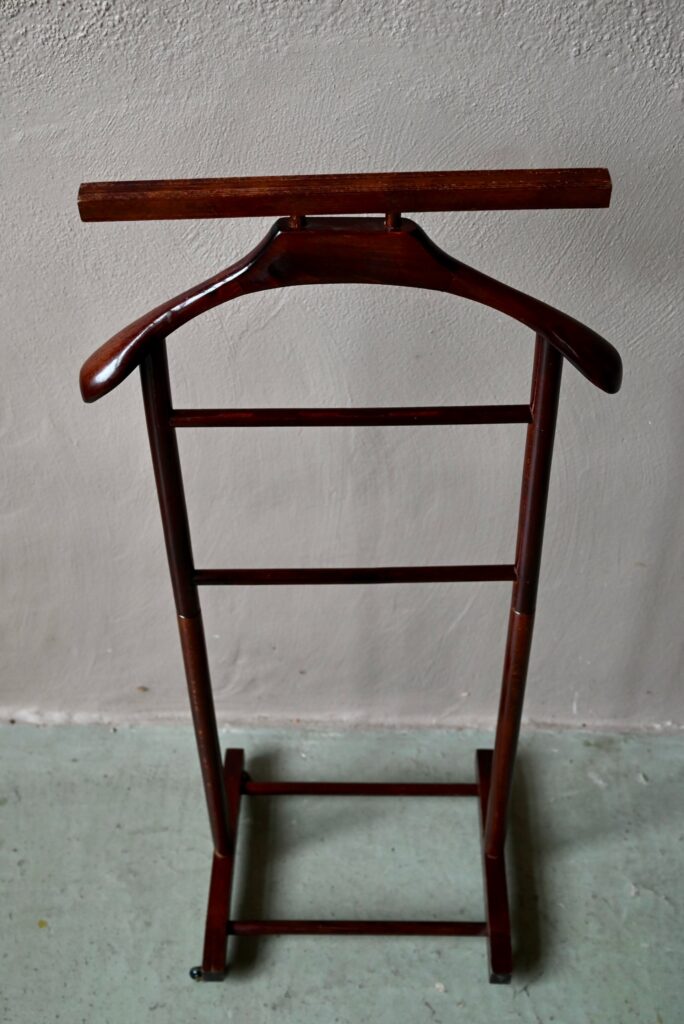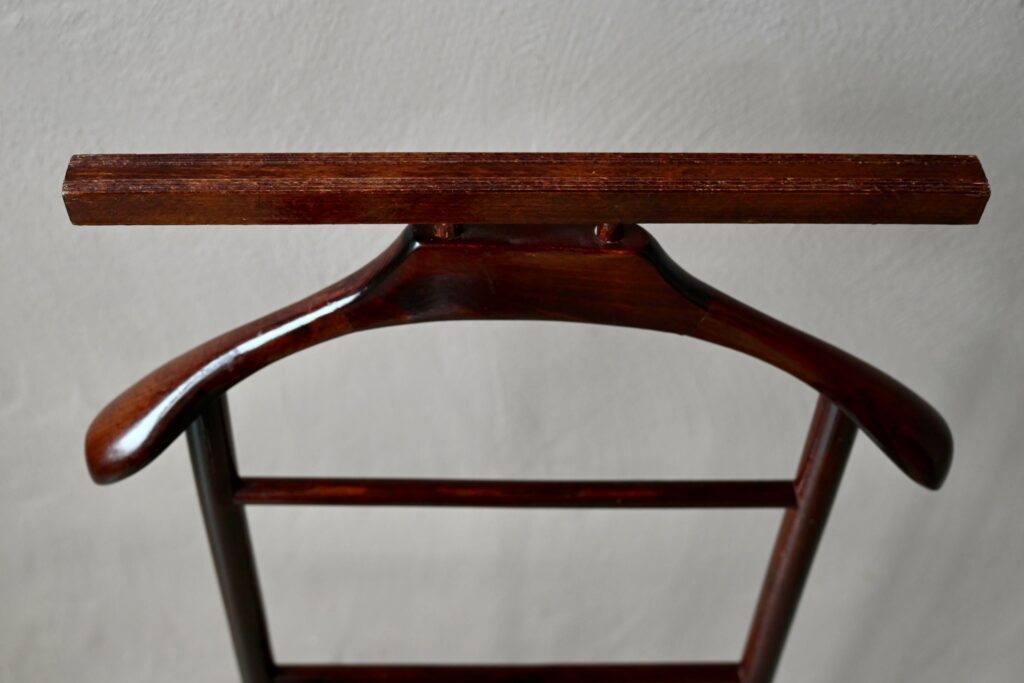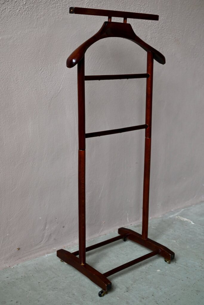 Ce modèle date des années 60 et est en bel état, des traces d’usages sont visibles. Le valet vintage est parfaitement fonctionnel. Il dispose de petites roulettes.
