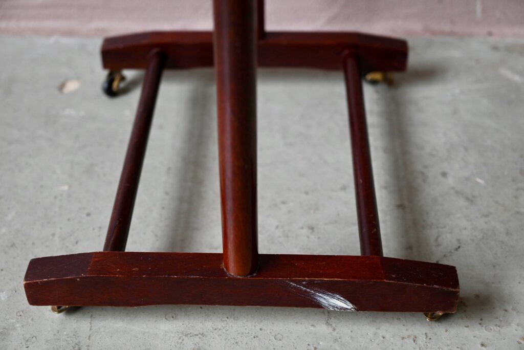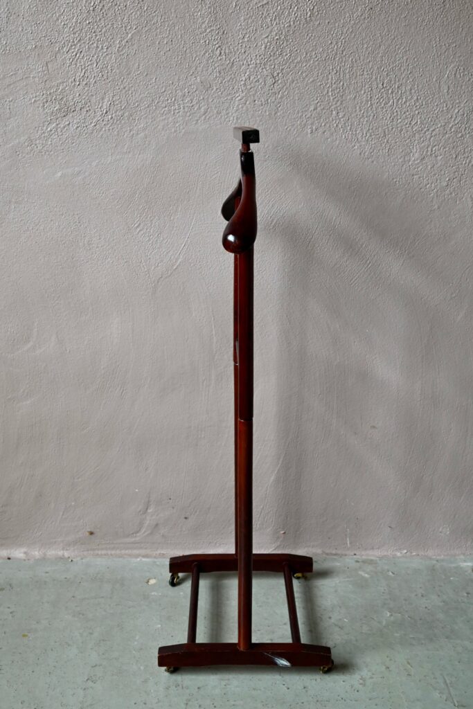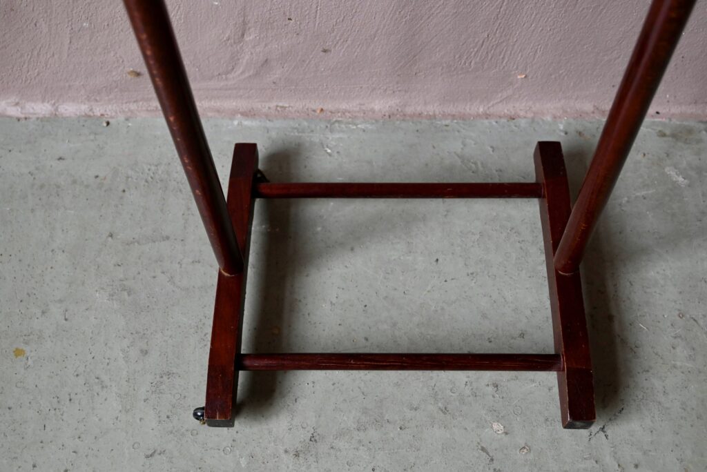 Toujours utile et prêt à rendre service, ce charmant portant à vêtements ou valet de chambre est une production rétro des années 60. Réalisé en hêtre de teinte foncée, il est doté d’un double porte-pantalons et de roulettes.