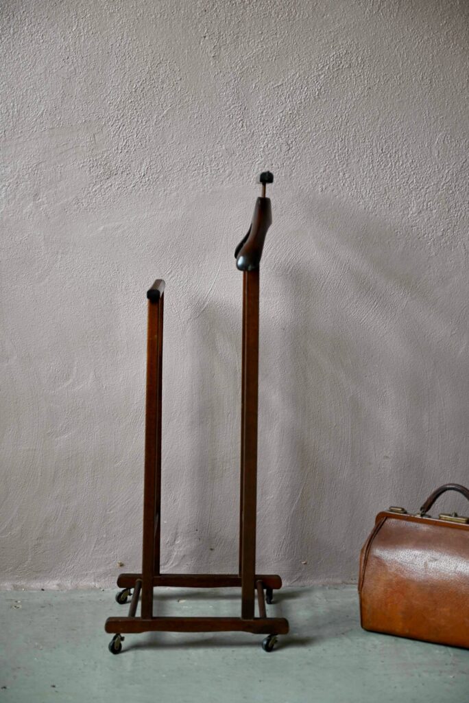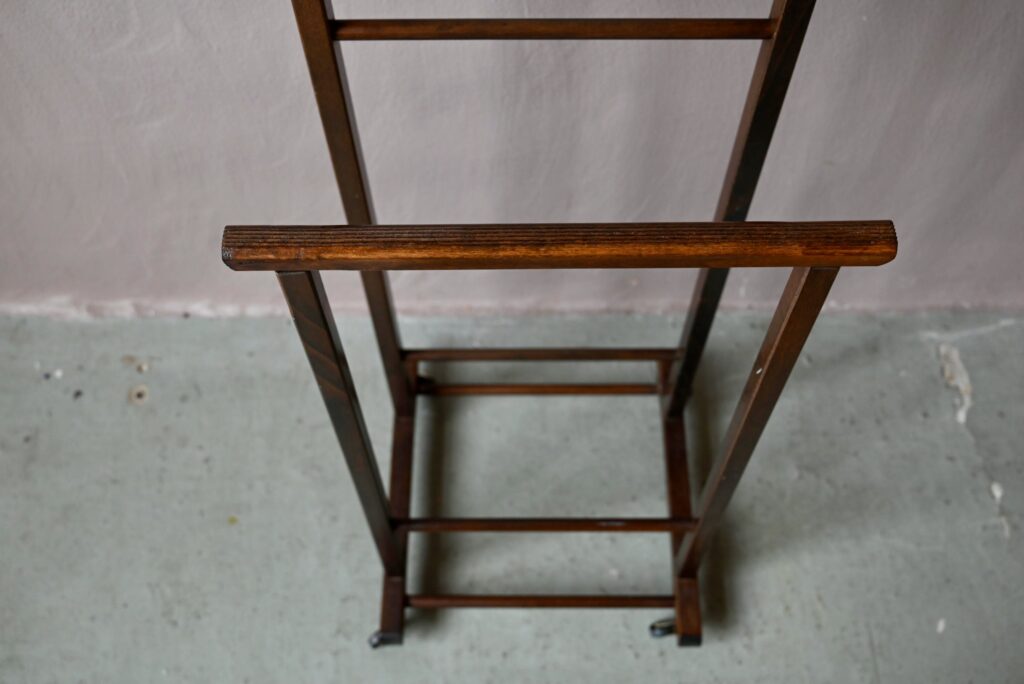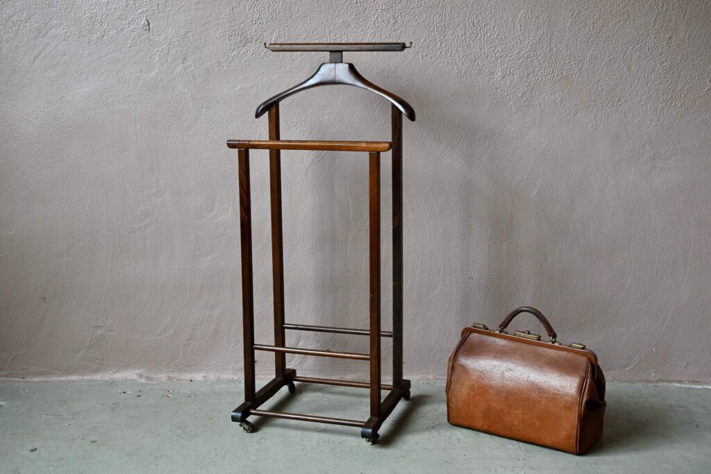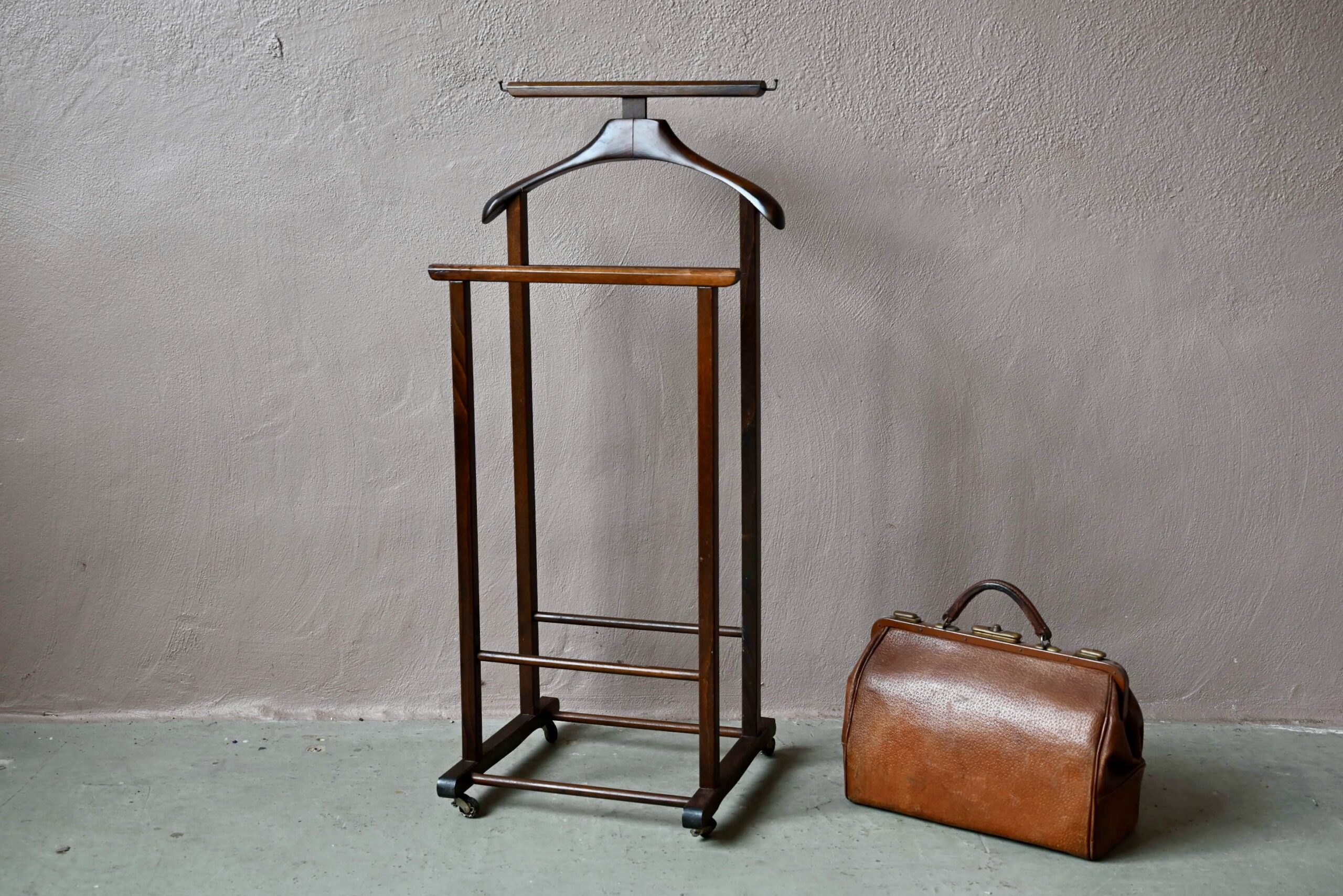 Ce modèle date des années 60 et est en bel état. Des traces d’usage sont visibles. Le valet vintage est parfaitement fonctionnel. C’est un modèle original avec ses deux portants.