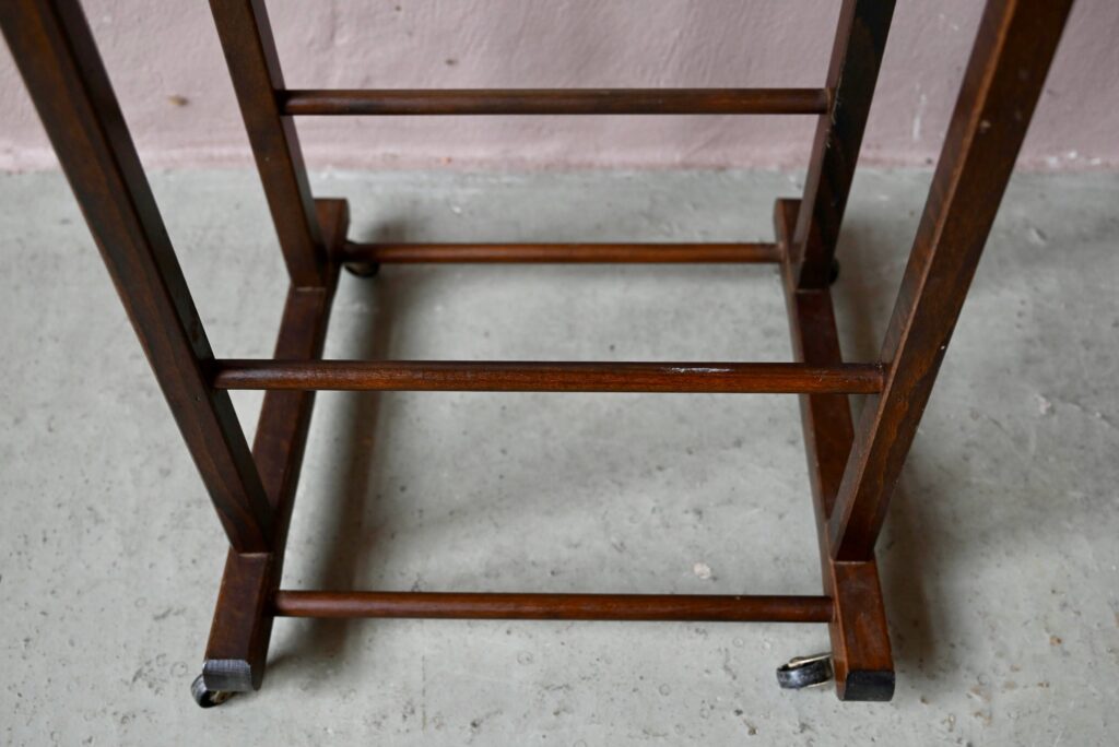Cet accessoire de chambre est un beau modèle de valet de chambre ou porte-vêtements. Celui-ci est réalisé en hêtre massif. Il tire son élégance d’un dessin épuré, d’une teinte sombre et profonde du bois. Ce modèle est doté de roulettes et d’un porte-pantalon déporté. Parfaitement fonctionnel, le portant possède un “on ne sait quoi” de chic et de pratique!
