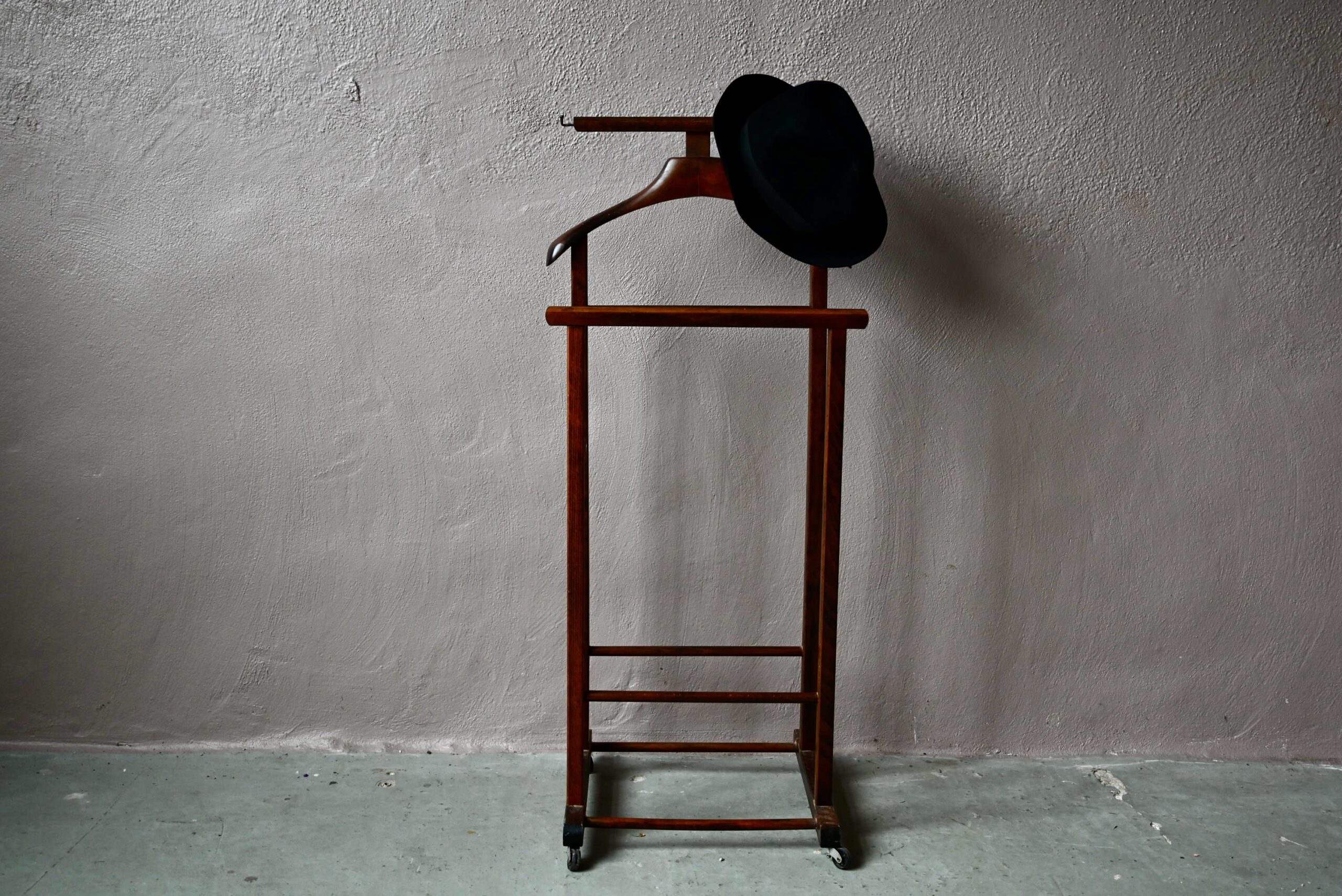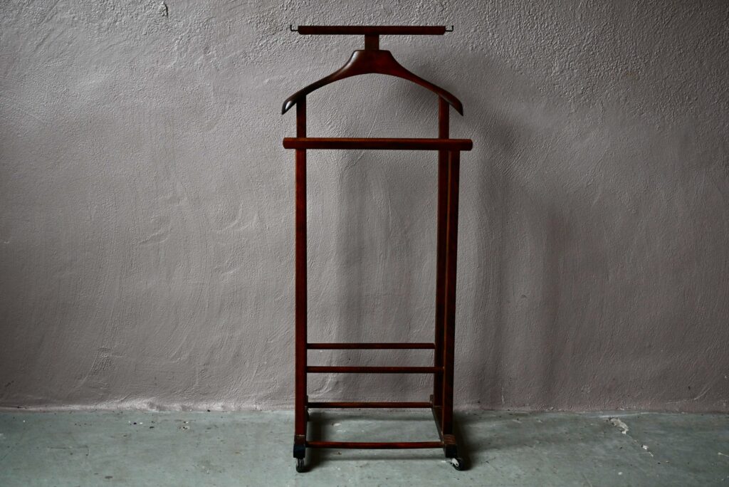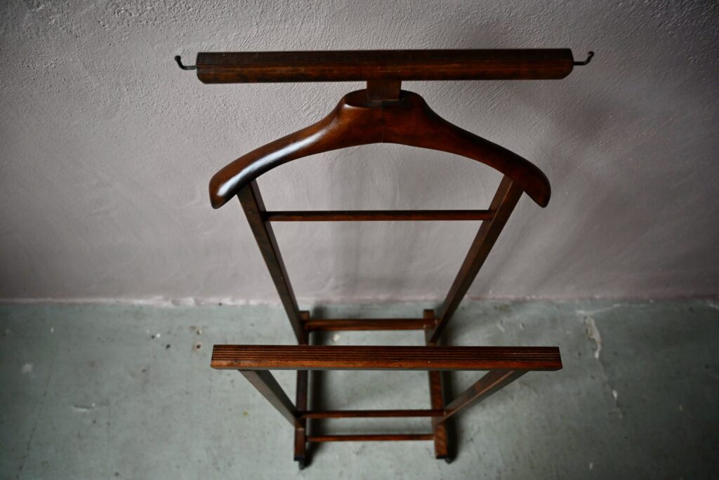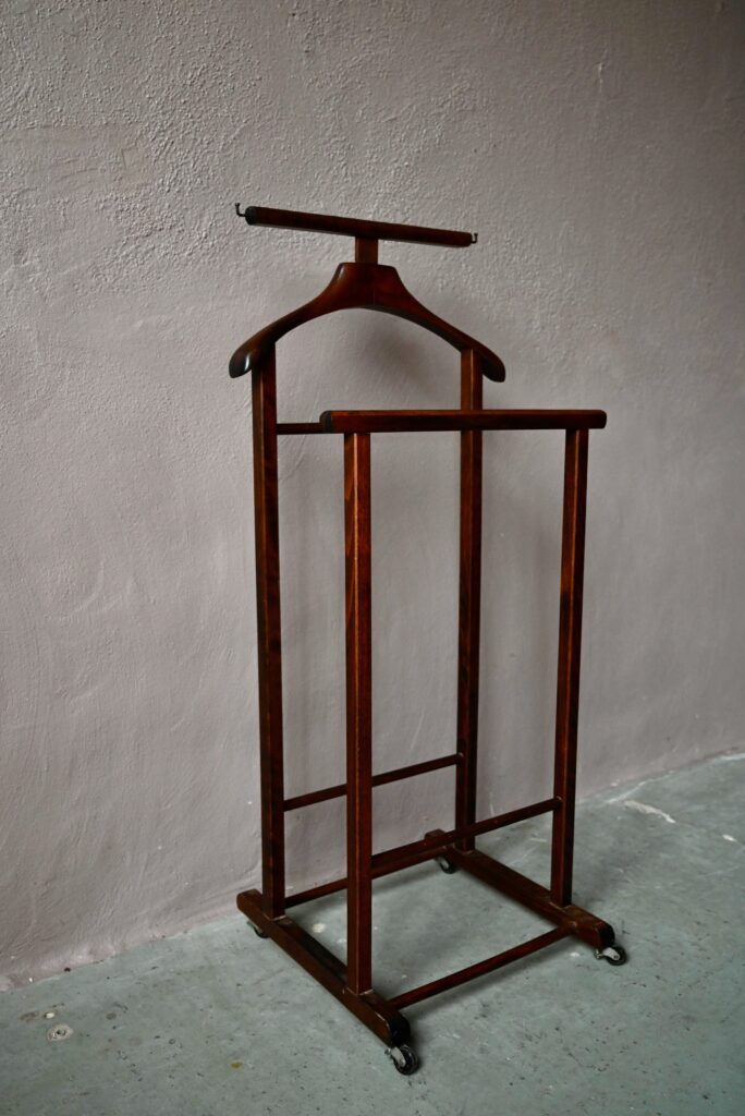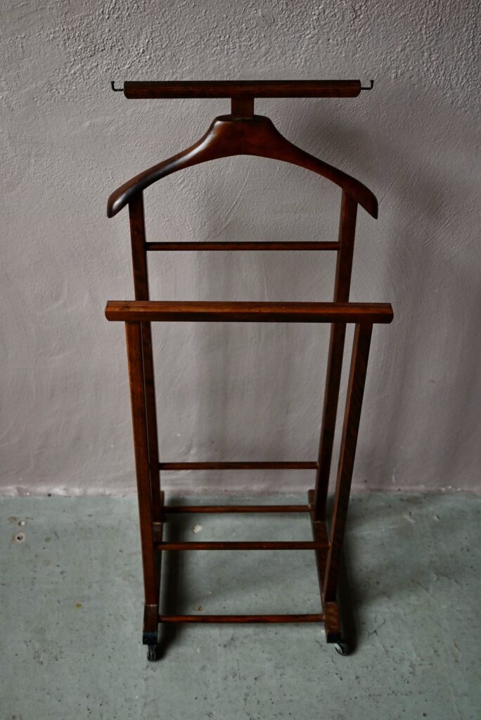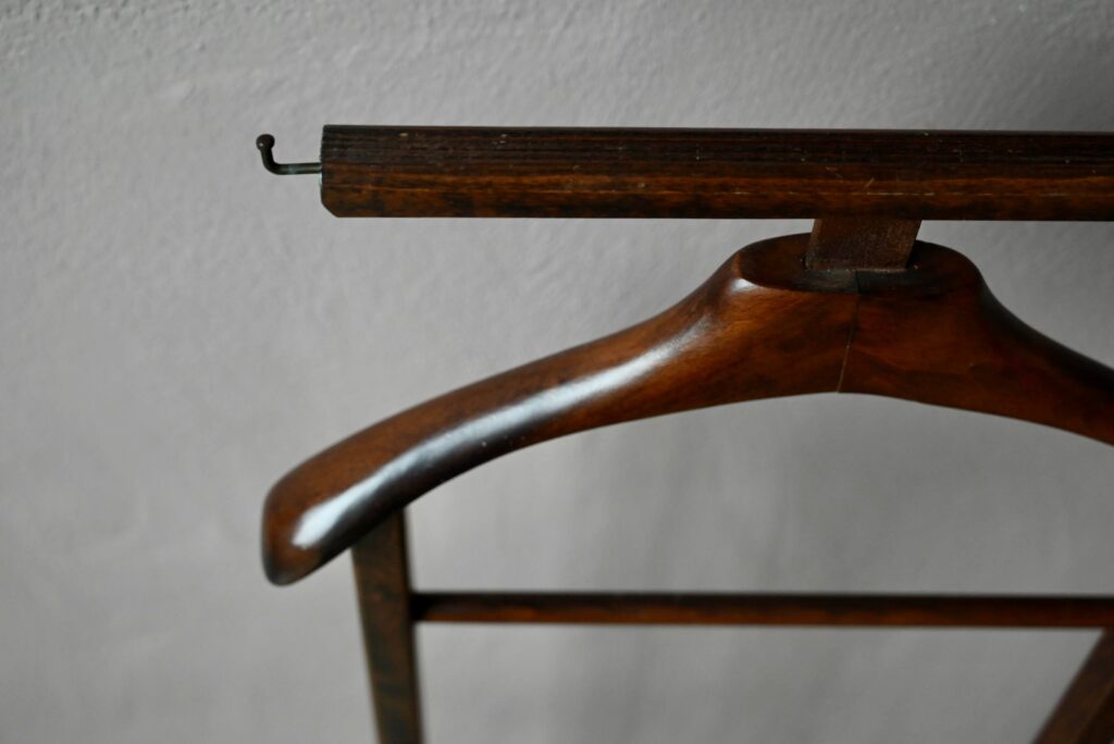 Ce modèle date des années 60 et est en bel état. Des traces d’usage sont visibles. Le valet vintage est parfaitement fonctionnel. C’est un modèle original avec ses deux portants.