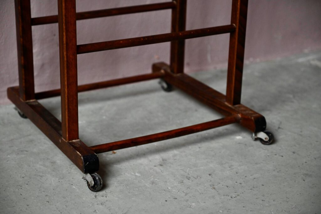 Cet accessoire de chambre est un beau modèle de valet de chambre ou porte-vêtements. Celui-ci est réalisé en hêtre massif. Il tire son élégance d’un dessin épuré, d’une teinte sombre et profonde du bois. Ce modèle est doté de roulettes et d’un porte-pantalon déporté. Parfaitement fonctionnel, le portant possède un “on ne sait quoi” de chic et de pratique!