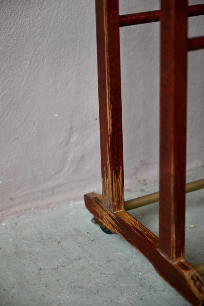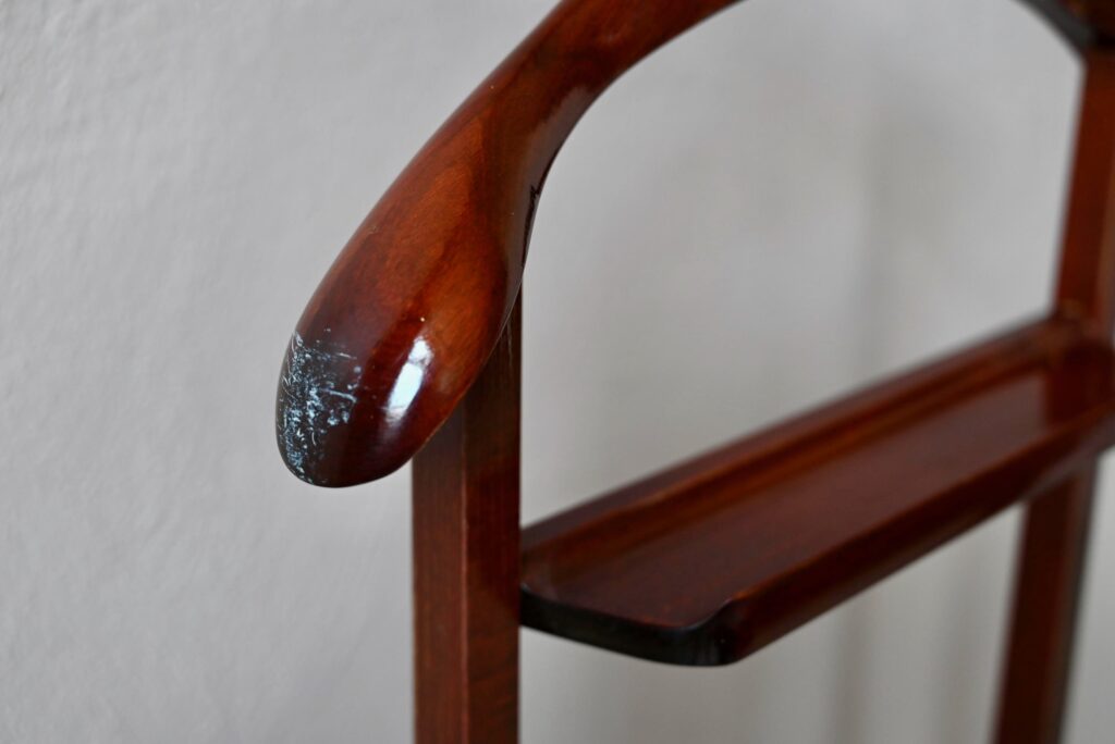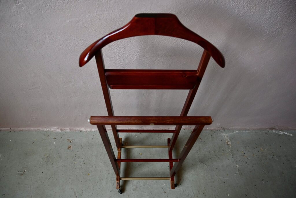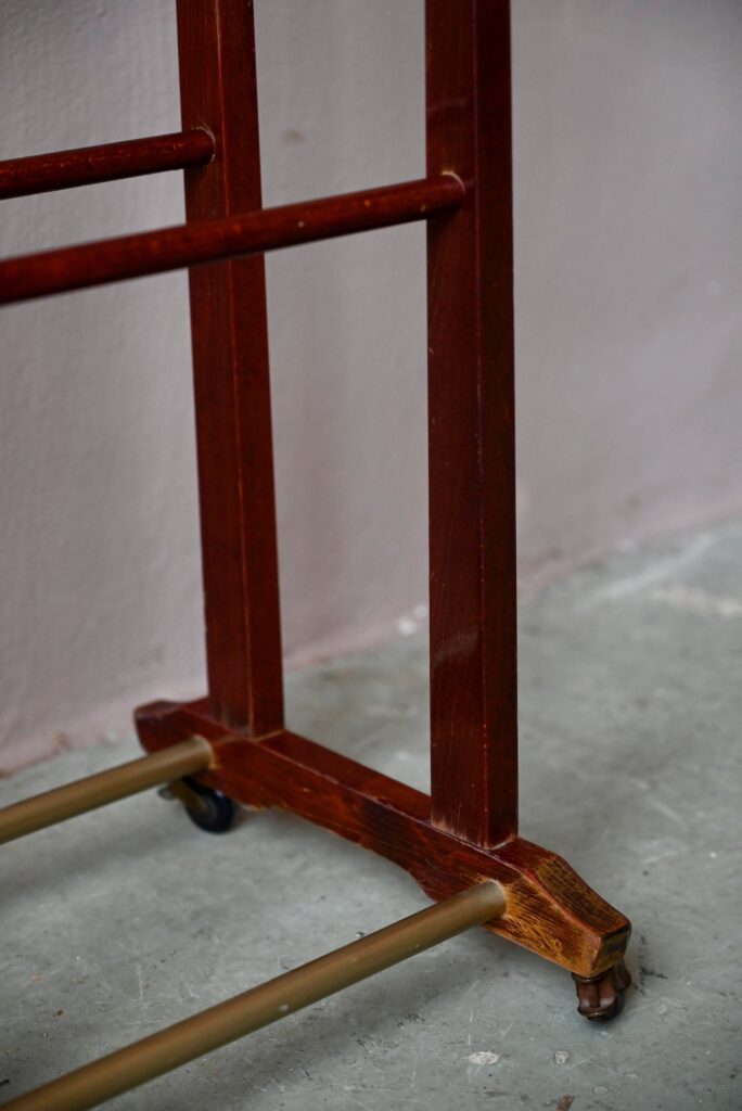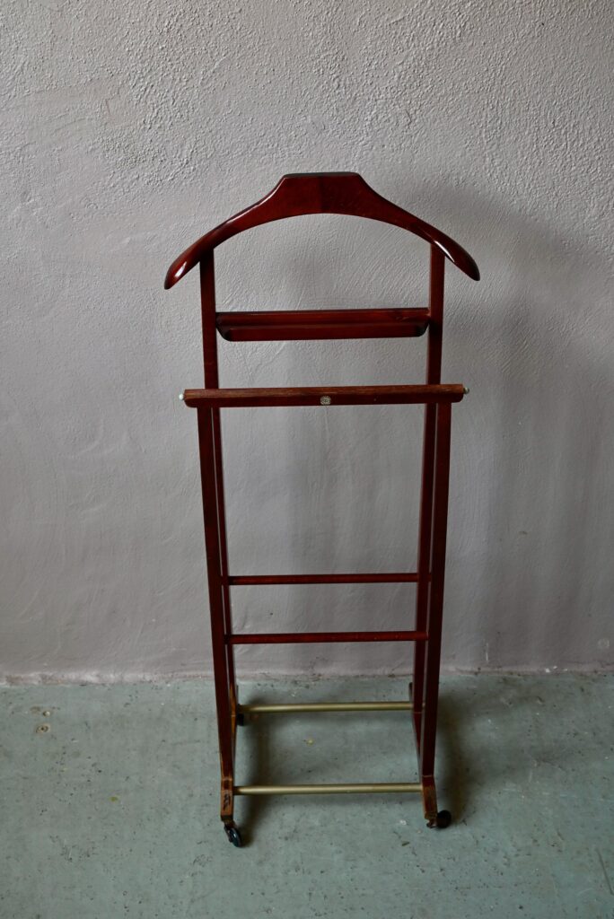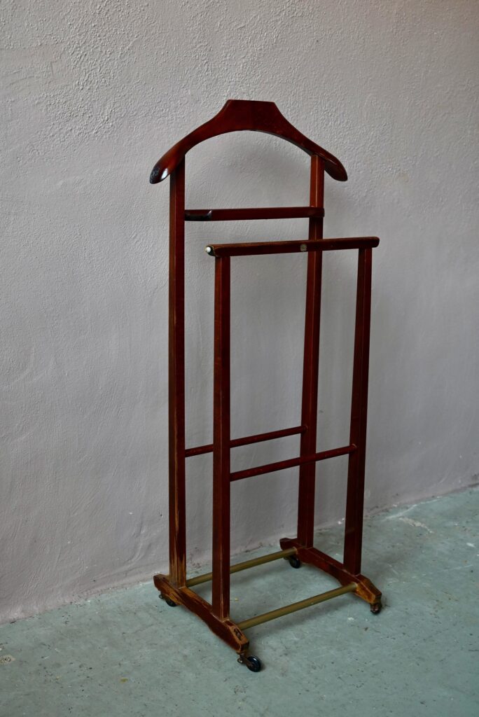 Ce modèle date des années 60 et est en bel état, des traces d’usages importantes sont visibles sur le vernis. Le valet vintage est parfaitement fonctionnel, c’est un modèle originale avec ses deux portants.