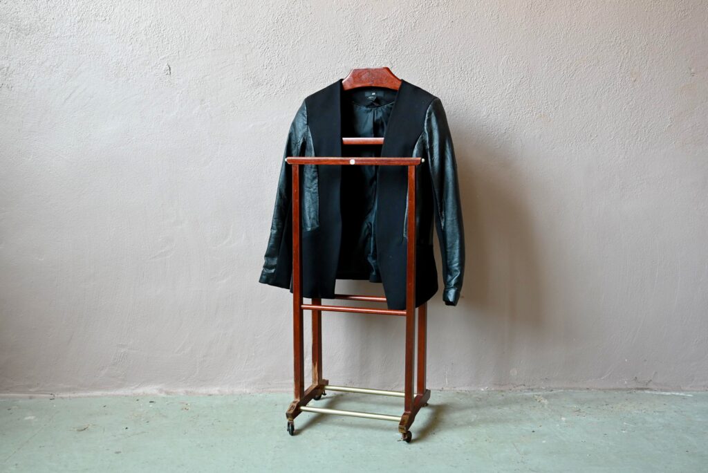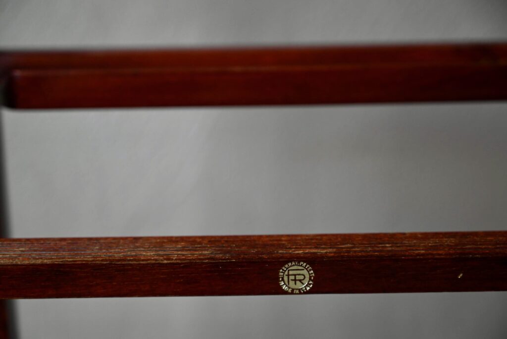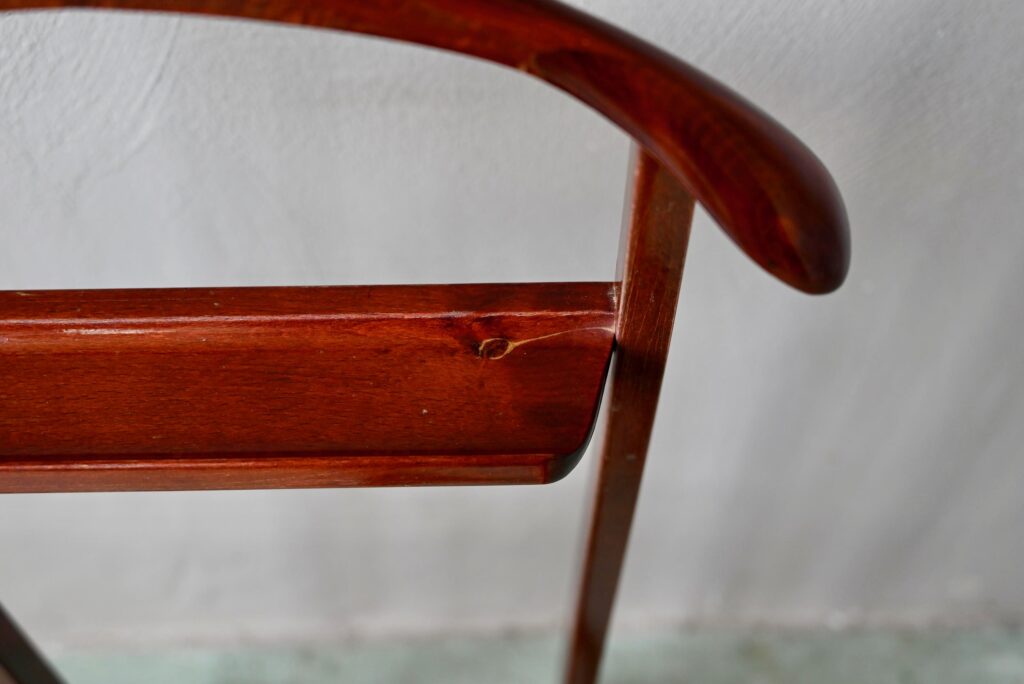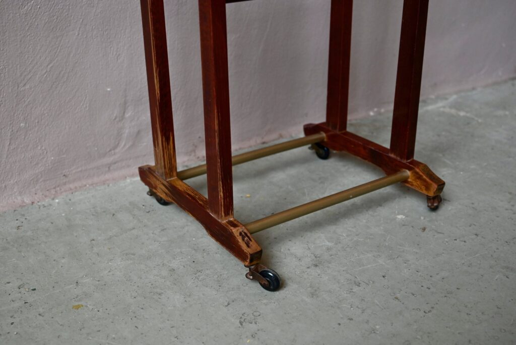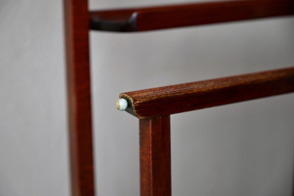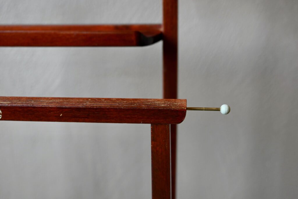 Ce modèle date des années 60 et est en bel état, des traces d’usages importantes sont visibles sur le vernis. Le valet vintage est parfaitement fonctionnel, c’est un modèle originale avec ses deux portants.