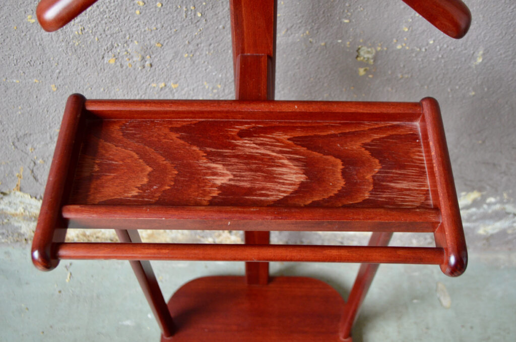 Ce modèle de valet de chambre est atypique. Il est en bel état, des traces d’usages légères sont visibles notamment sur le vernis du vide-poches. Le valet vintage est parfaitement fonctionnel.
