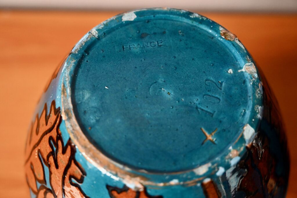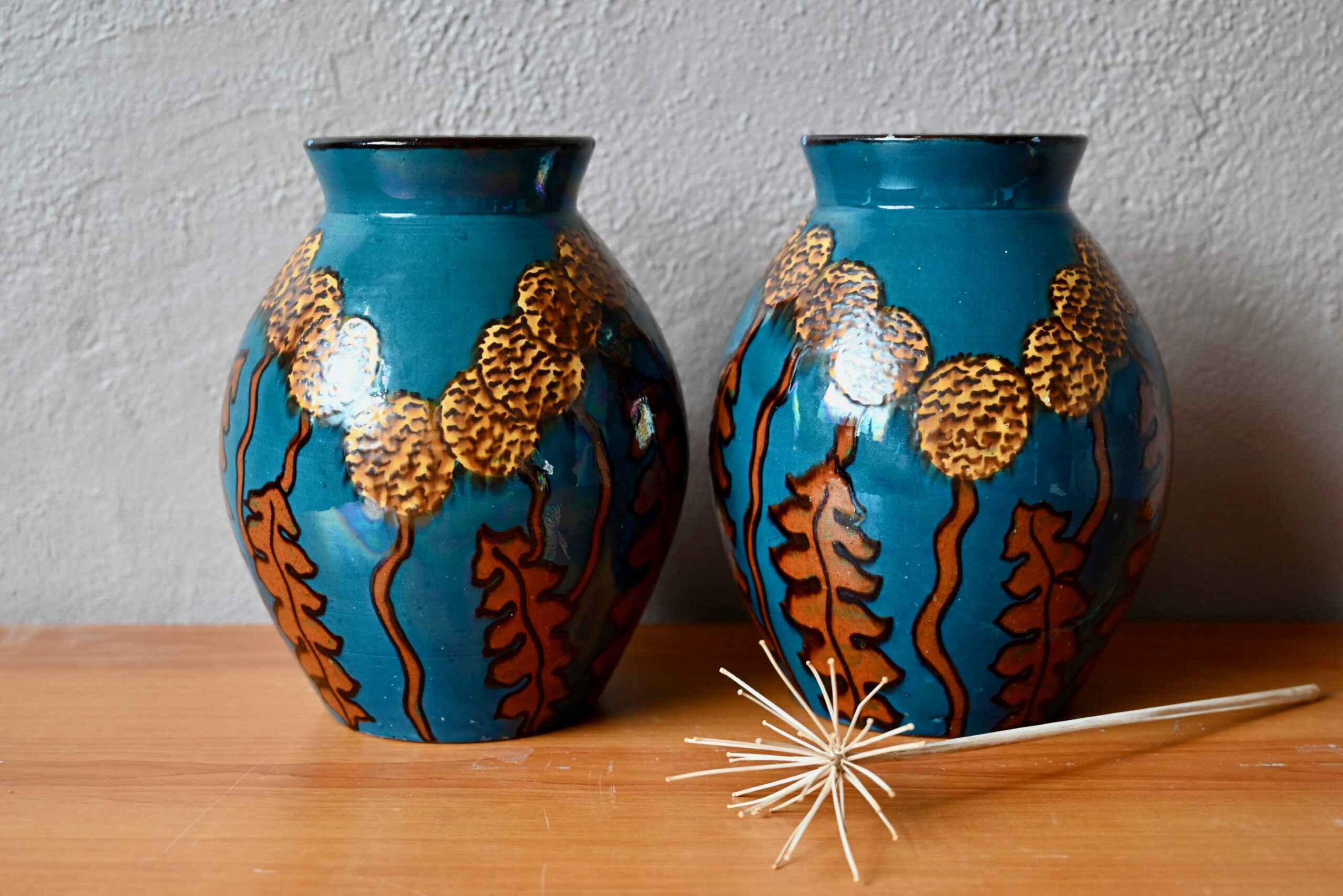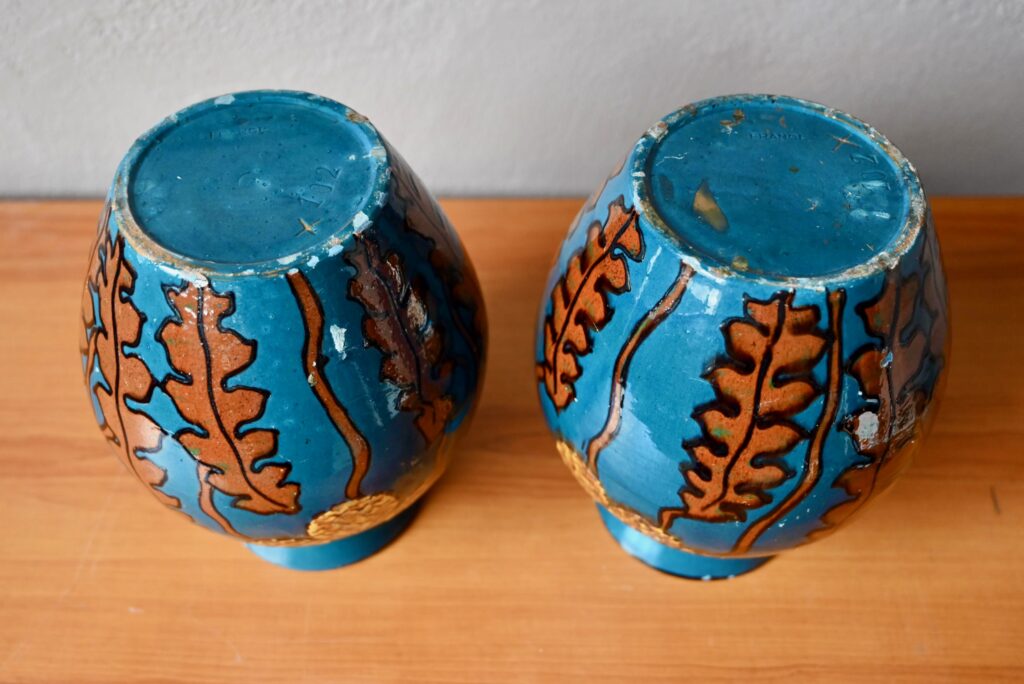 Les vases sont de belle taille. L’émaillage bleu à motif végétal, feuillage et fougère, est sublime, irisé à la lumière. Des petits défauts et rares manques d’émaillage sont visibles en photo. Le prix est pour la paire. Les vases sont signés “France/102” sur le dessous.