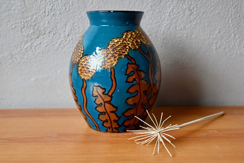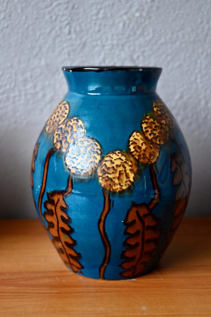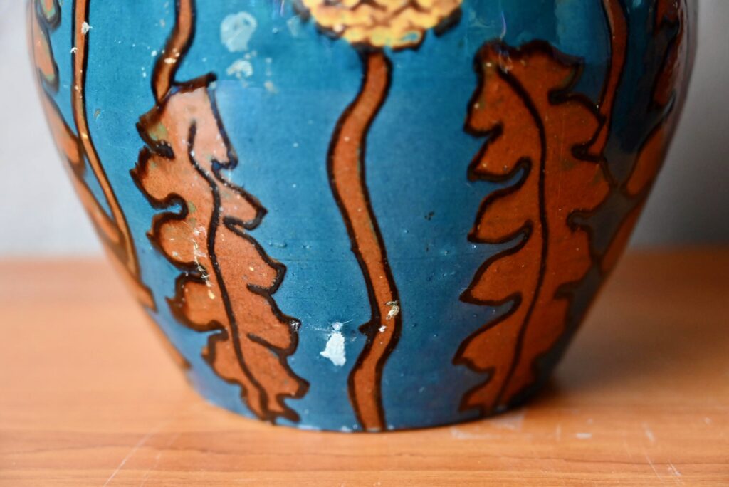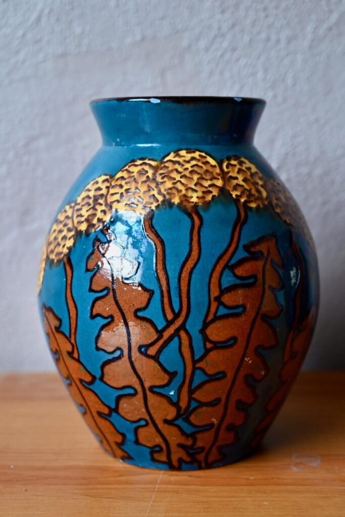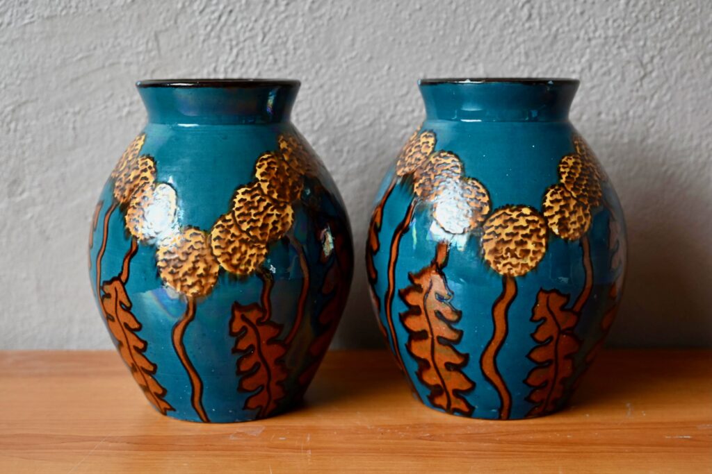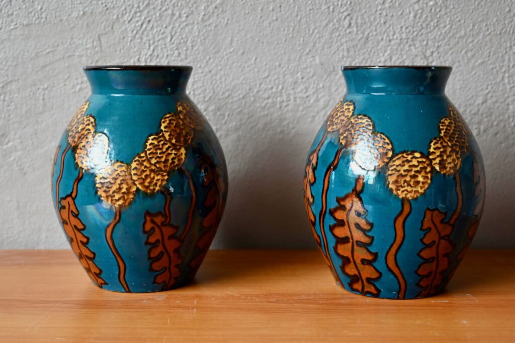 Peintre et céramiste savoyard né en 1893, Emile Simonod était aussi poète et ses céramiques en témoignent. Ces vases sont d’une grande finesse, à mi-chemin Art Nouveau et Art Déco. Spécialiste des paysages d’automne, les motifs représentent le monde végétal, ici des feuillages et fougères stylisés dans des tons orangé-brun. Sur un fond bleu encre, ils ressortent avec puissance et se font touchants. Grâce à l’utilisation d’oxydes métalliques, les émaux de Simonod sont reconnaissables car subtilement irisés. Saisissants, élégants et remarquables, ces vases des années 30 sont des pièces de collection.