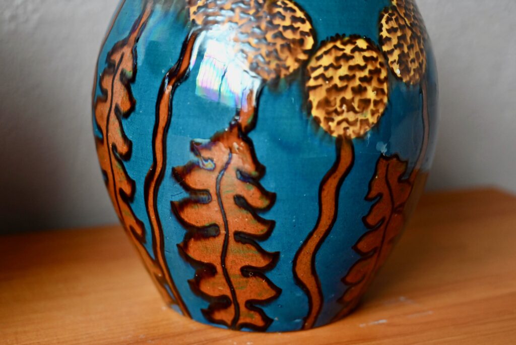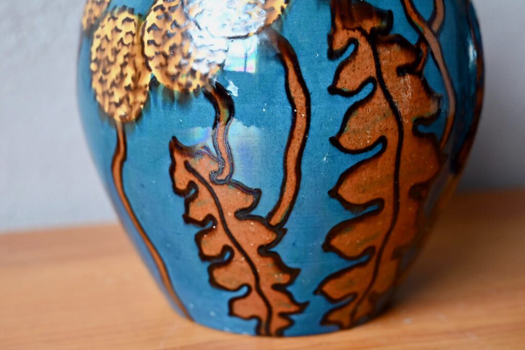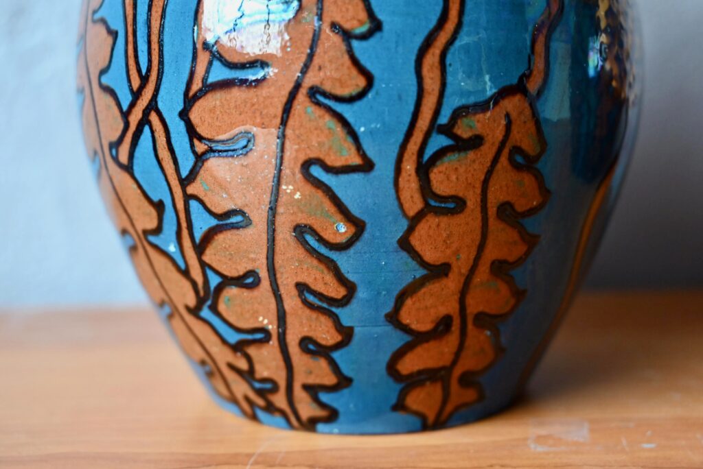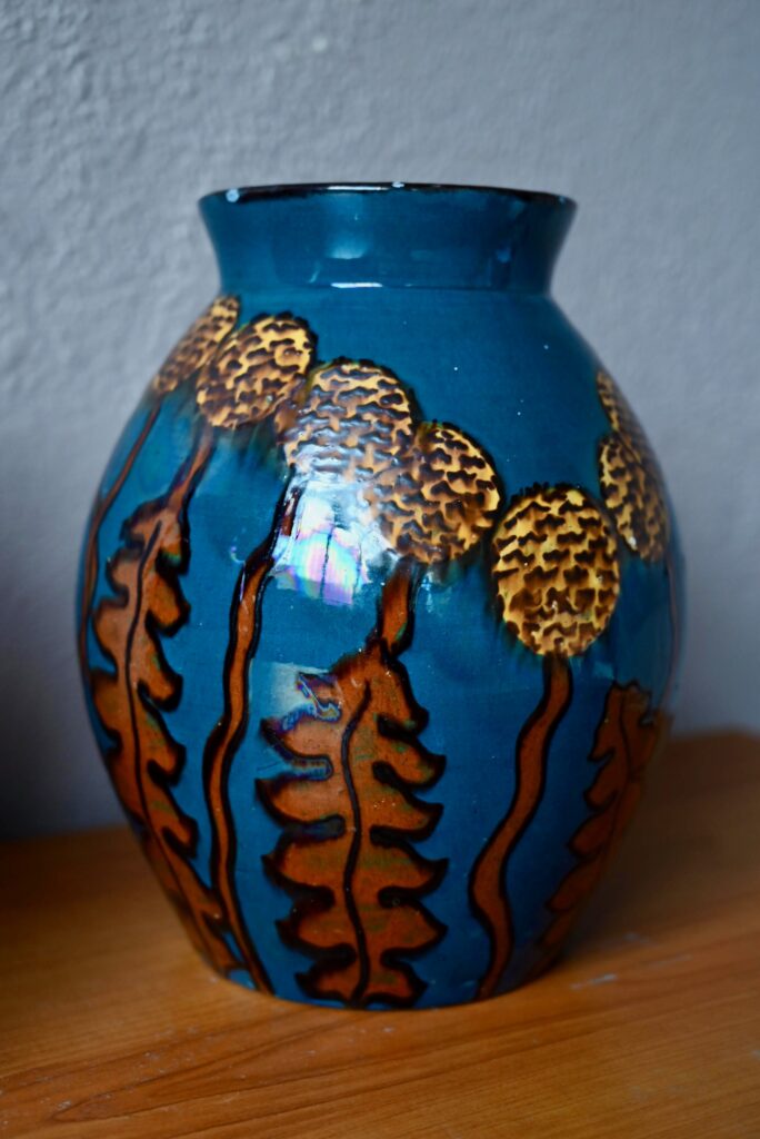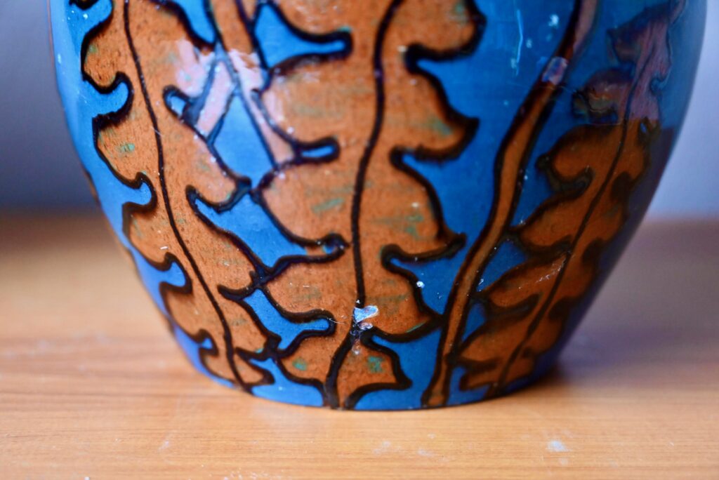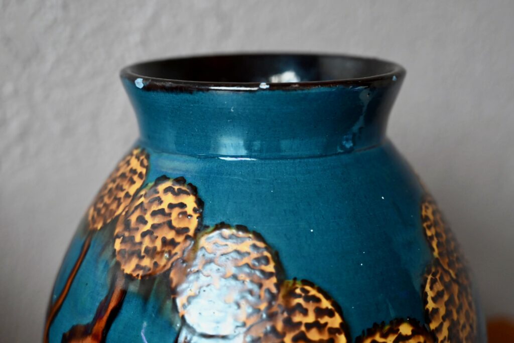 Peintre et céramiste savoyard né en 1893, Emile Simonod était aussi poète et ses céramiques en témoignent. Ces vases sont d’une grande finesse, à mi-chemin Art Nouveau et Art Déco. Spécialiste des paysages d’automne, les motifs représentent le monde végétal, ici des feuillages et fougères stylisés dans des tons orangé-brun. Sur un fond bleu encre, ils ressortent avec puissance et se font touchants. Grâce à l’utilisation d’oxydes métalliques, les émaux de Simonod sont reconnaissables car subtilement irisés. Saisissants, élégants et remarquables, ces vases des années 30 sont des pièces de collection.