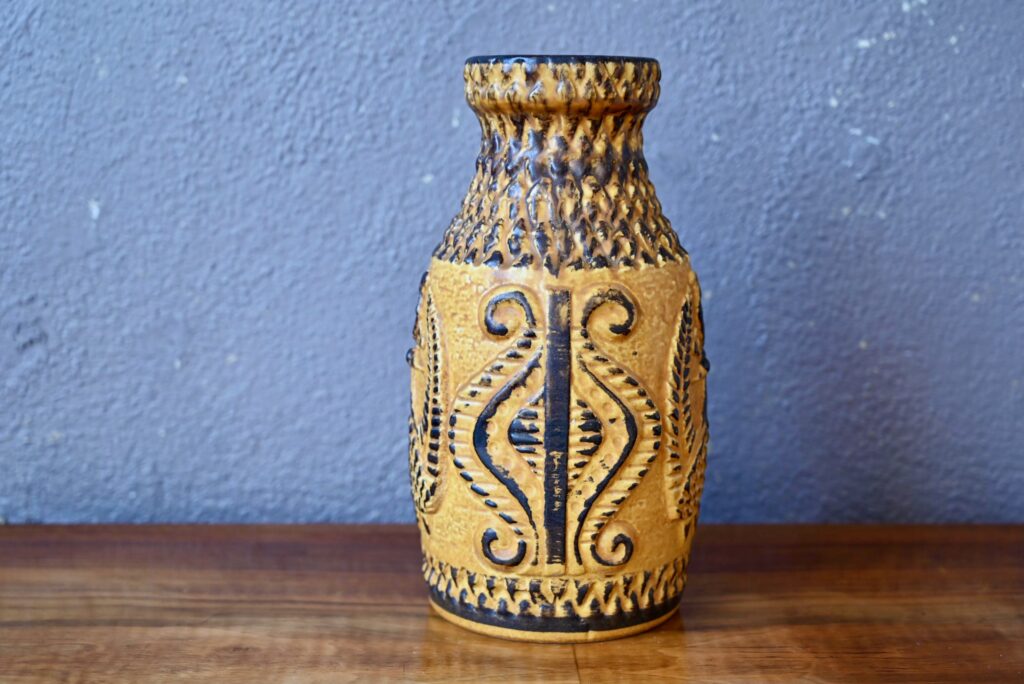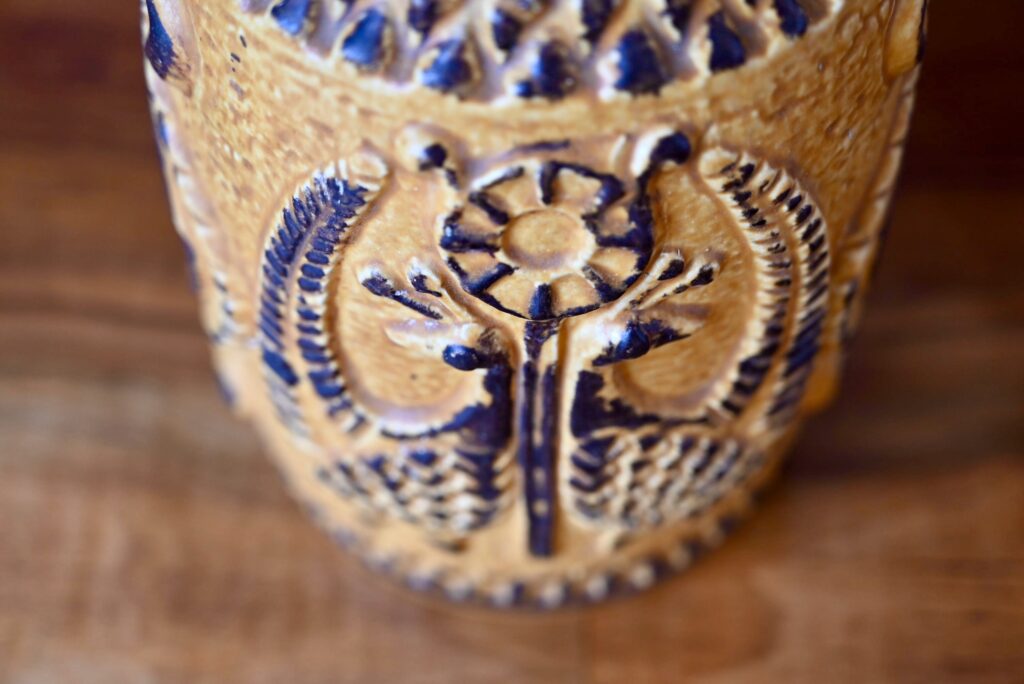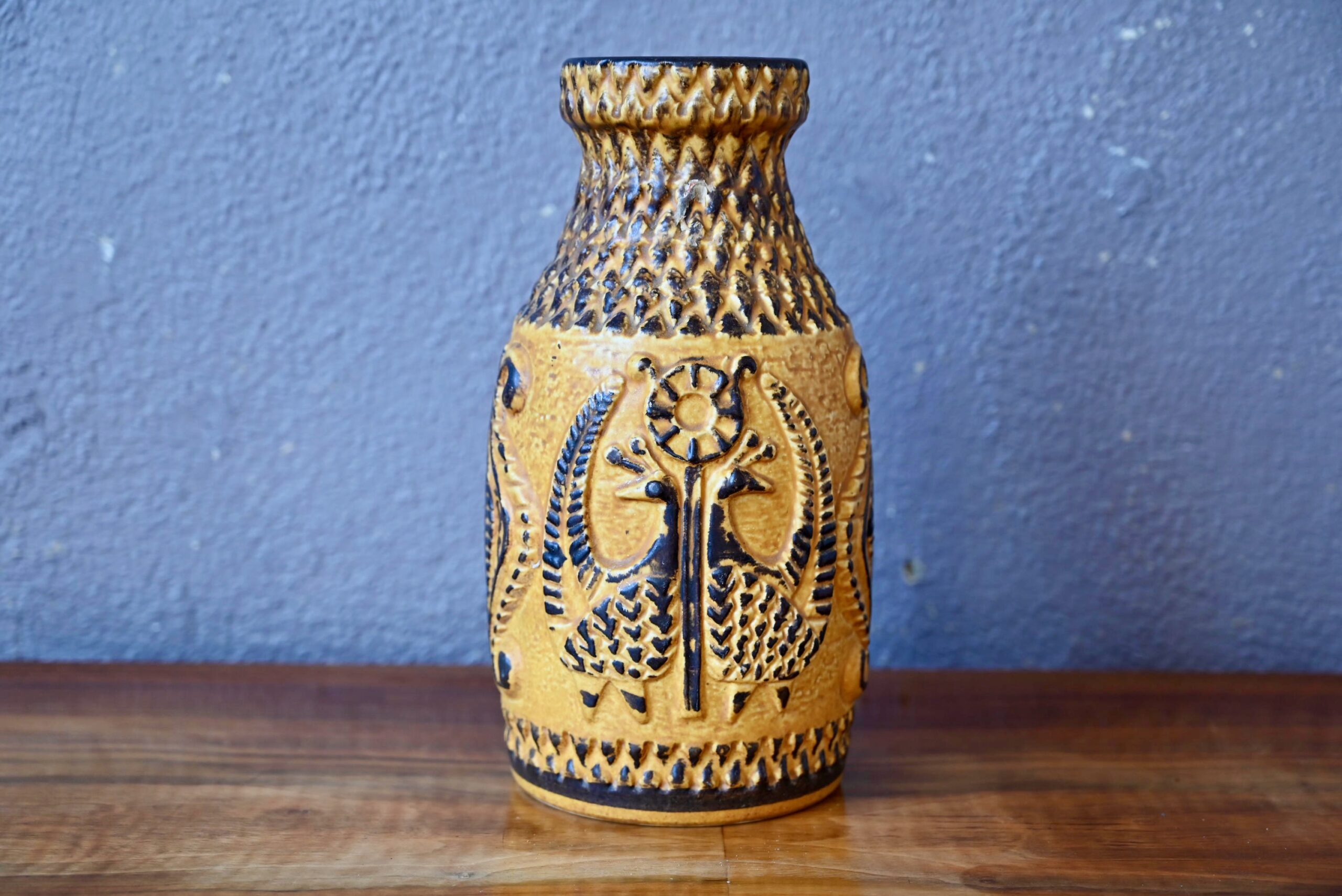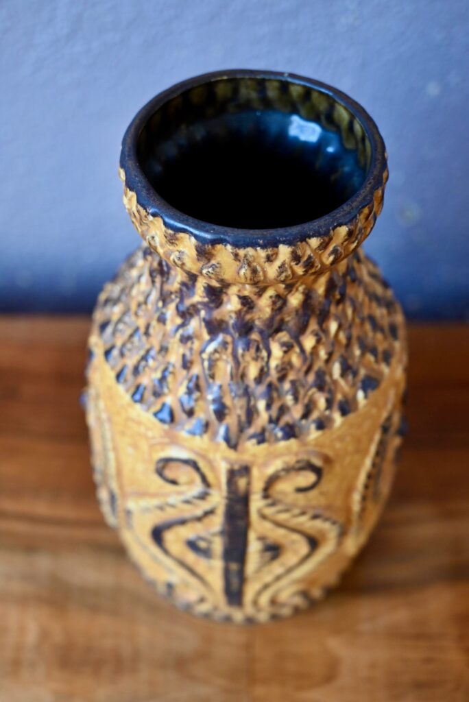 Bay Keramik fait partie des fabriques de céramique réputées pour la production de vases aux émaux colorés et toniques. Ce vase émaillé de jaune et richement décoré de paons et de motifs géométriques en relief est rehaussé de noir. Décorative et originale, cette céramique viendra compléter l’ambiance d’une pièce de sa touche colorée.