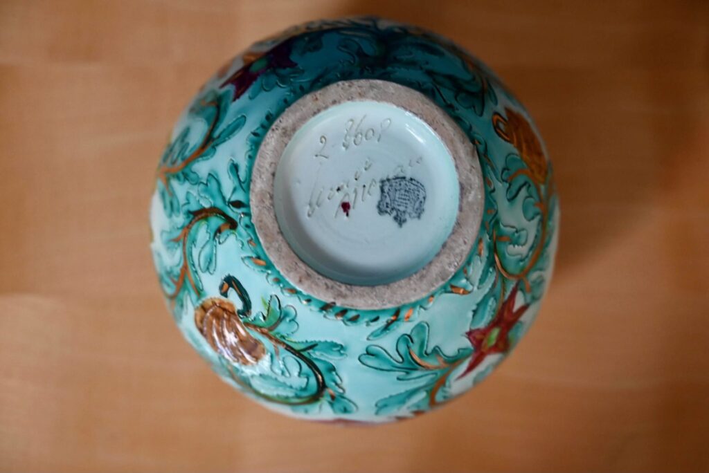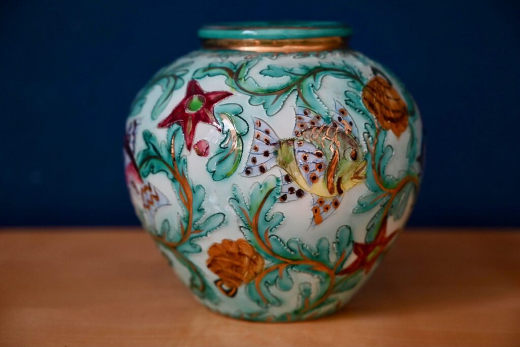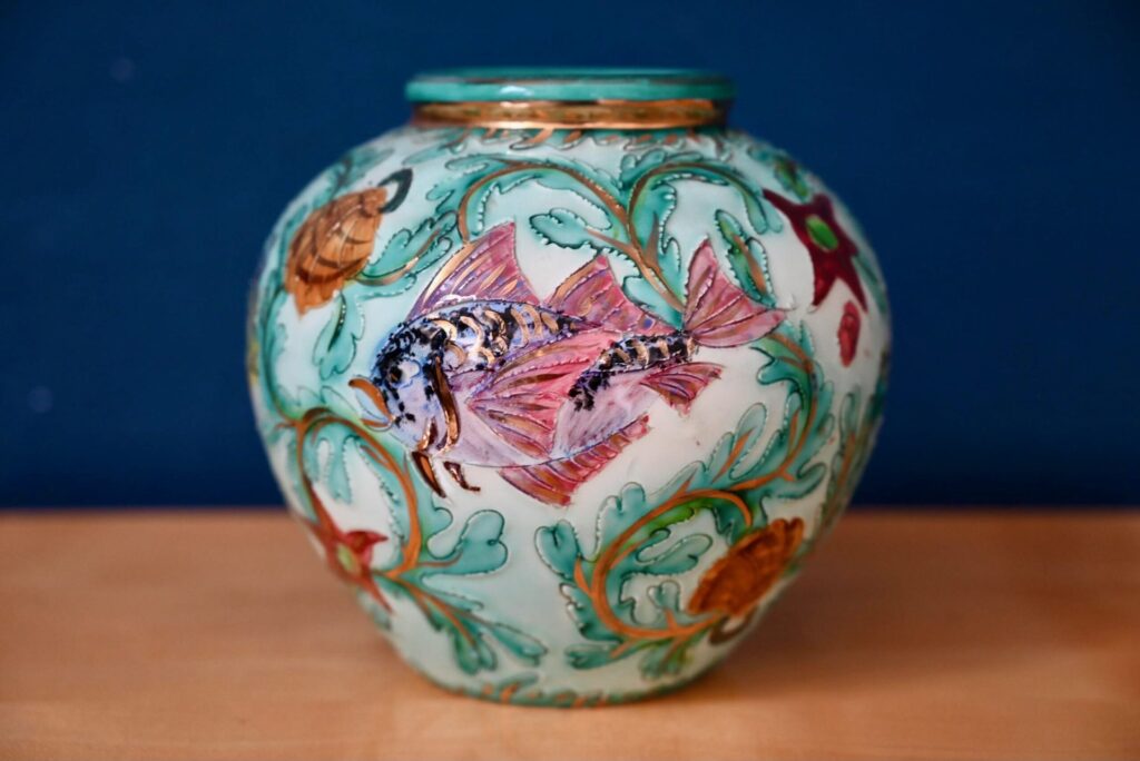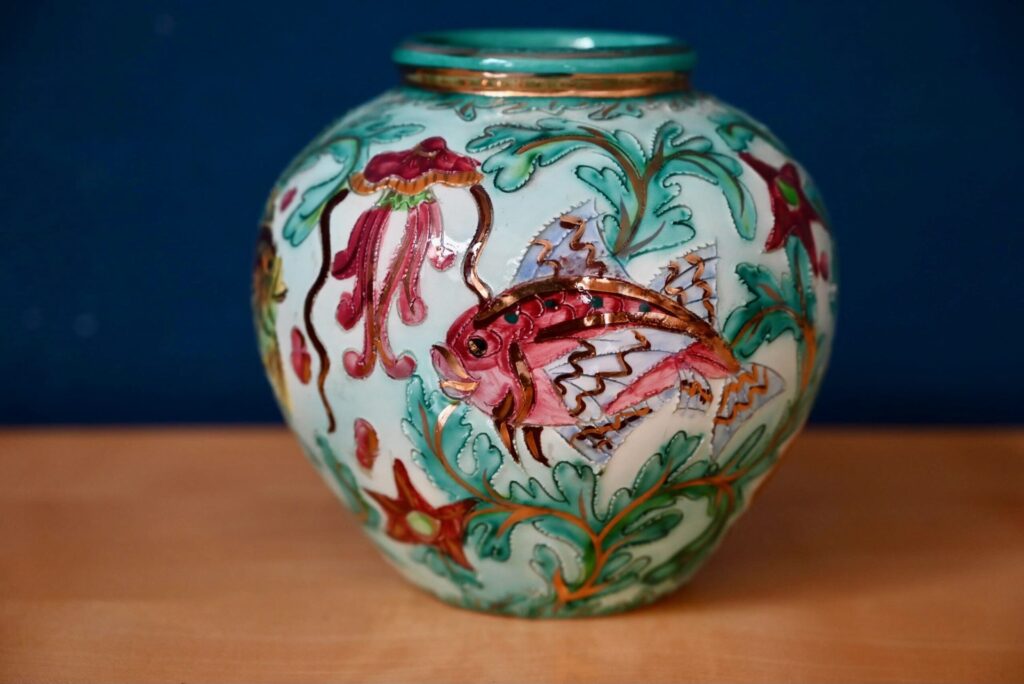 Une forme boule classique, mais des couleurs et des motifs exceptionnels à la frontière du kitsch! Ce vase signé Cerart Monaco date des années 60 et met en avant la faune et la flore marine… de la Côte d’Azur! Sur fond vert eau, ciselés et peints à la main, on retrouve des poissons colorés, des anémones, des coquillages, et même, une petite pieuvre. Rehaussé par des détails à l’or fin, ce vase ancien est une explosion de couleurs, soulignant la finesse des détails. Il met en avant un imaginaire foisonnant, entre rêve et réalité.