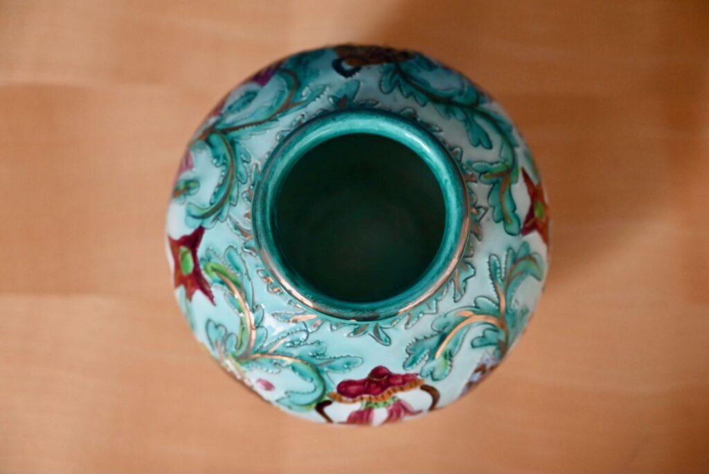 Le vase est ancien et date des années 60. Il est en très bel état. L’émail est coloré et brillant, rehaussé de détails à l’or fin. Les motifs sont ciselés et peints. Le fond est vert eau à vert soutenu. Le vase est signé et numéroté sur le dessous.
